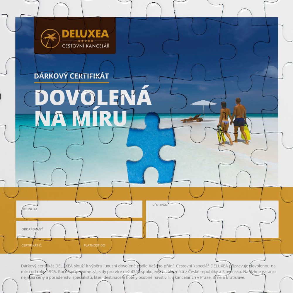 - Darčekový certifikát Dovolenka na mieru je možné použiť na úhradu Zmluvy o zájazde medzi DELUXEA s.r.o. a klientom uplatňujúcim Darčekový certifikát. Darčekový certifikát platí na pobyt v ľubovoľnom hoteli z ponuky cestovnej kancelárie DELUXEA a na úhradu leteniek. Darčekový certifikát je možné čerpať iba jednorazovo.