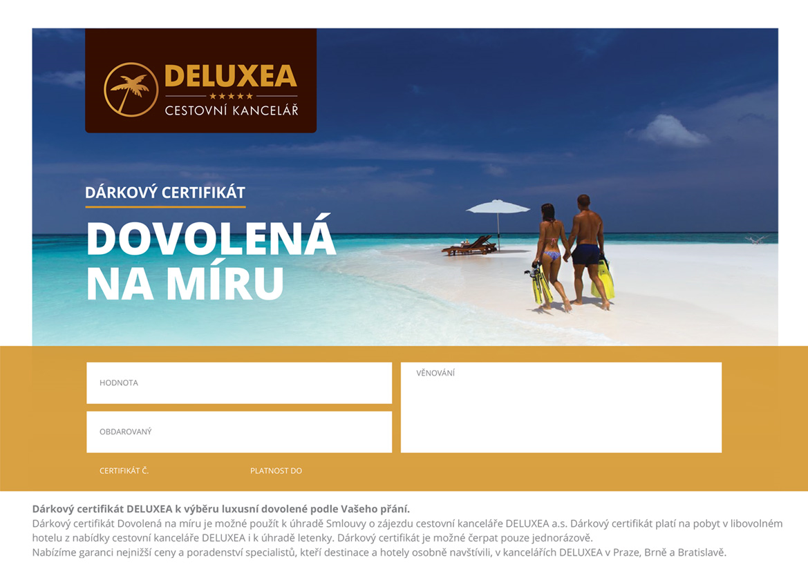 - Obdarovaný si môže vybrať Dovolenku na mieru (zájazd, hotel alebo letenku) na deluxea.cz alebo využiť poradenstvo špecialistov cestovnej kancelárie DELUXEA, s.r.o. v kanceláriách v Prahe, Brne alebo Bratislave.