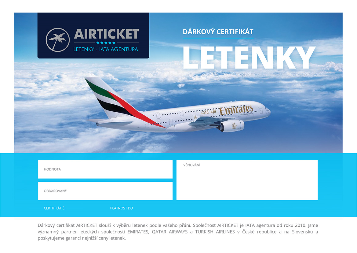 - Darčekový certifikát Letenka je možné použiť na úhradu ľubovoľnej letenky.