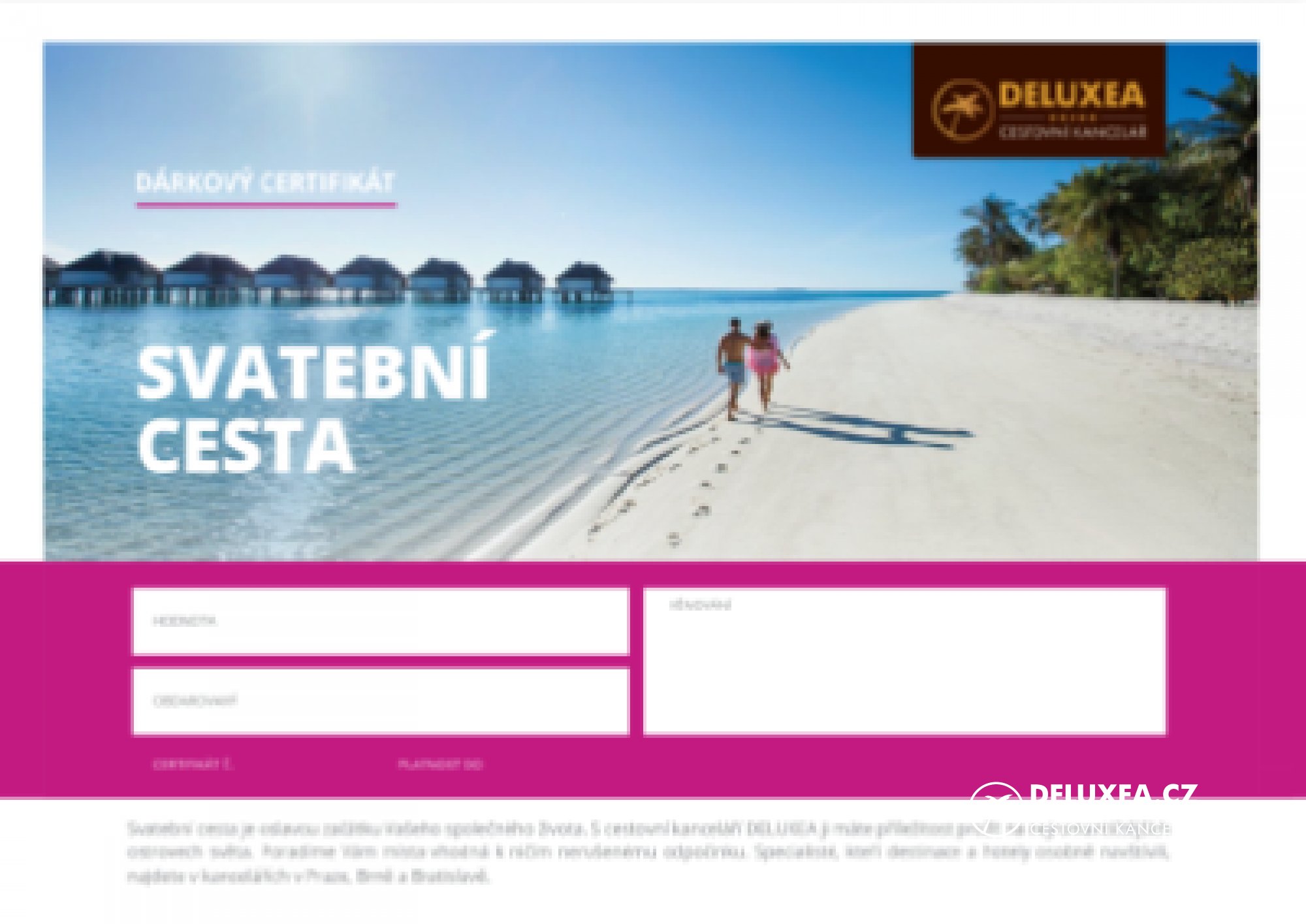 Svatební cesta je oslavou začátku Vašeho společného života. S cestovní kanceláří DELUXEA ji máte příležitost prožít na nejromantičtějších ostrovech světa. Poradíme Vám místa vhodná k ničím nerušenému odpočinku. Destinace i hotely jsme osobně navštívili a rádi Vám poradíme z osobních zkušeností.