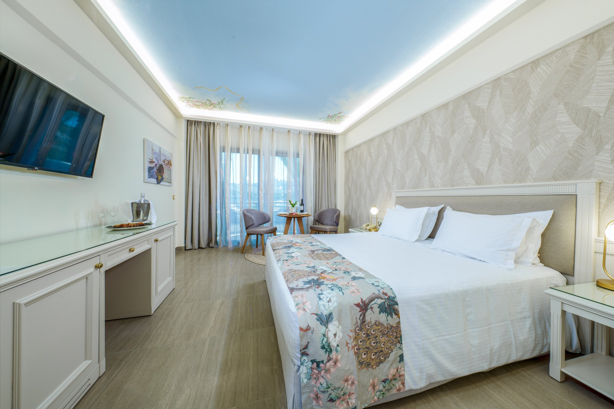 Tento elegantní pokoj (28 m²) navržený ve středomořském stylu nabízí pohodlné zázemí s přímým přístupem ke společnému bazénu. Součástí pokoje je manželská postel (nebo dvě samostatná lůžka), koupelna s masážní vanou a balkón či terasa. Na vyžádání je k dispozici rozkládací přistýlka. Maximální kapacita: 3 osoby.