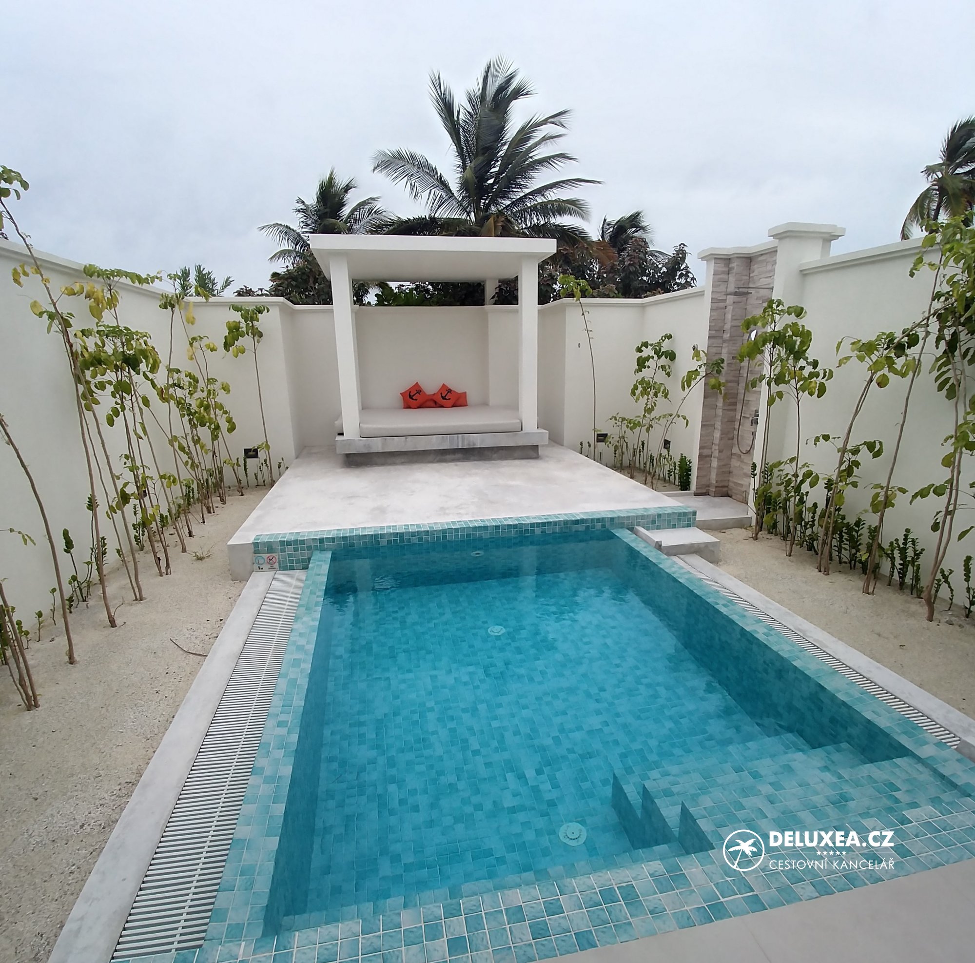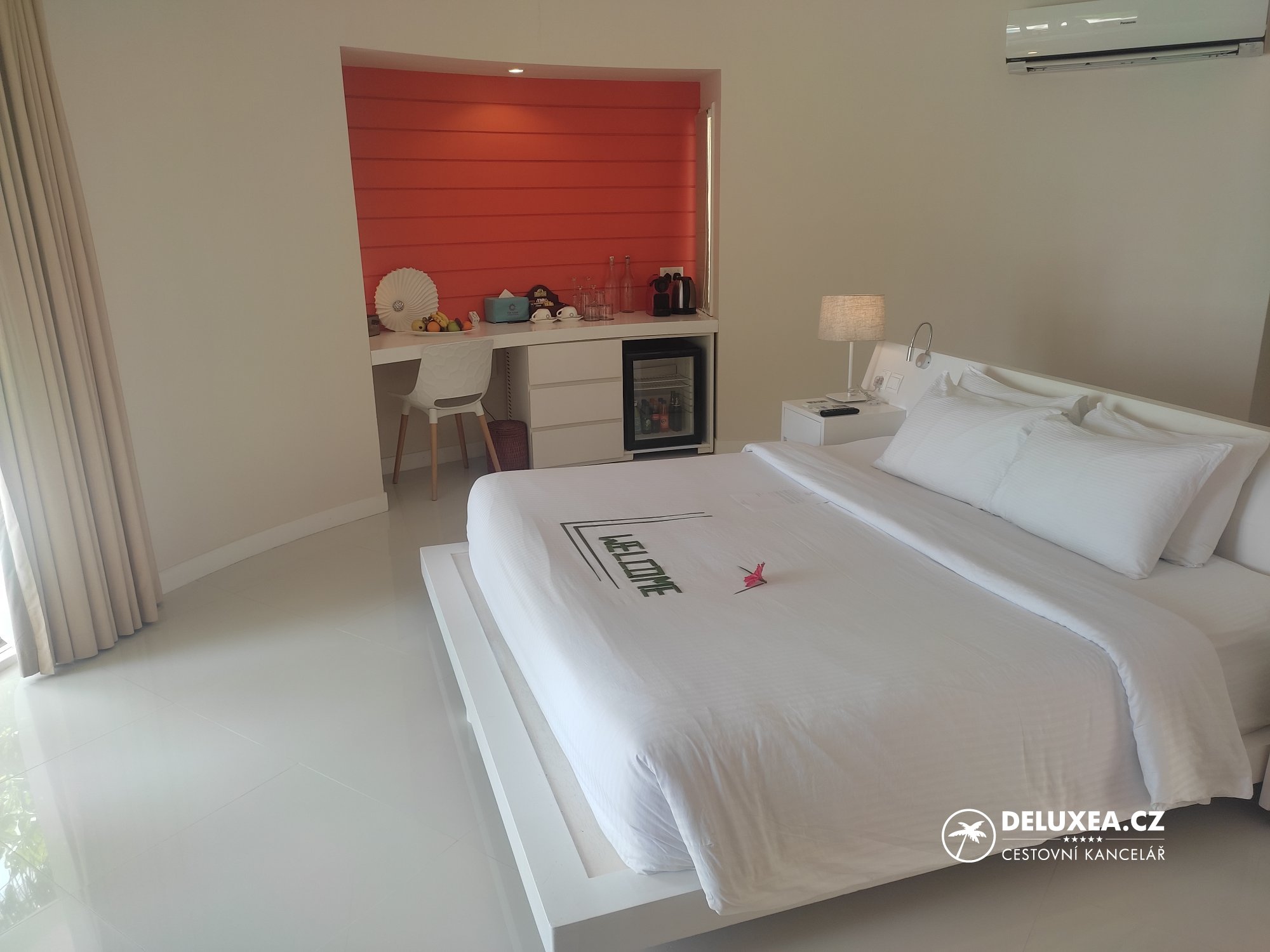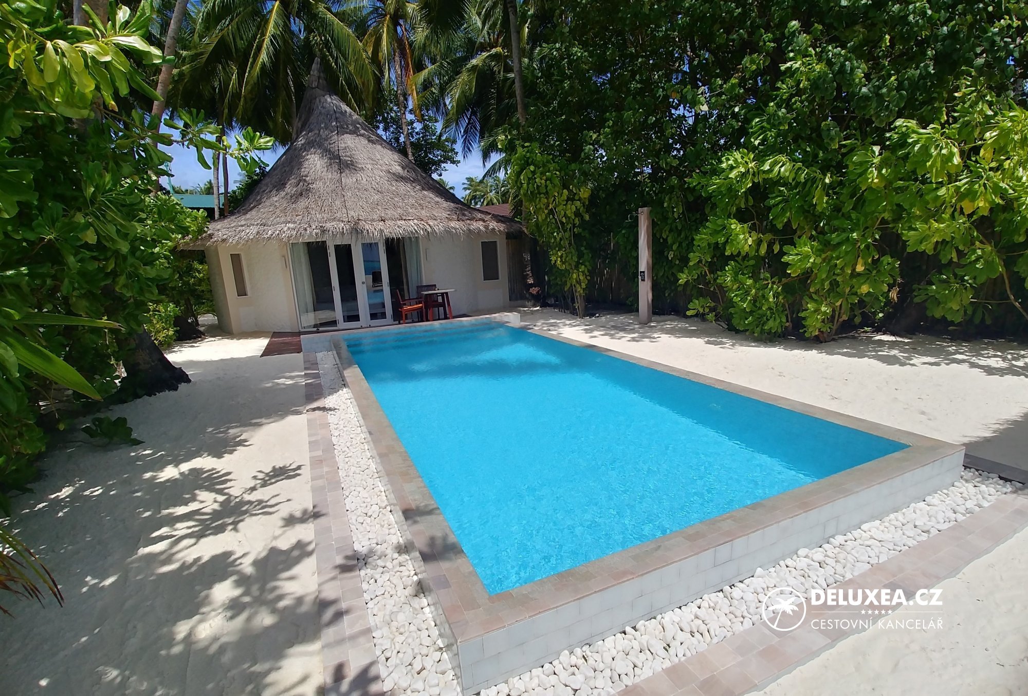 Již od příjezdu jsme se zde cítili jako doma a zaměstnanci se nám snažili splnit každé přání. Ubytování jsme měli zajištěné v plážové vilce s bazénem, Sun Aqua Pool Villa č. 162. Tato vilka se nachází hned vedle centra vodních sportů, i tak ale poskytuje dostatečné soukromí a klid. Vilka nabízí prostornou ložnici ve tvaru mušle s manželskou postelí, minibarem, denním lůžkem, dále šatnu a otevřenou koupelnu s vanou, sprchovým koutem i venkovní sprchou. Venku je k dispozici soukromý bazén, posezení, přístup na širokou pláž včetně lehátek a krytého houpacího lehátka. Díky umístění na jihozápadní straně ostrova jsme tak měli výhled na západ slunce a nadvodní vilky. Koupání na této straně ostrova nabízí tyrkysovou lagunu a pozvolný vstup do vody.