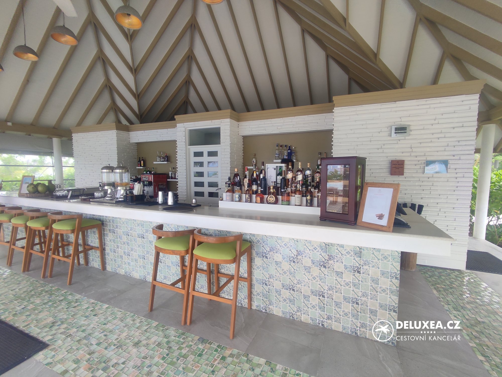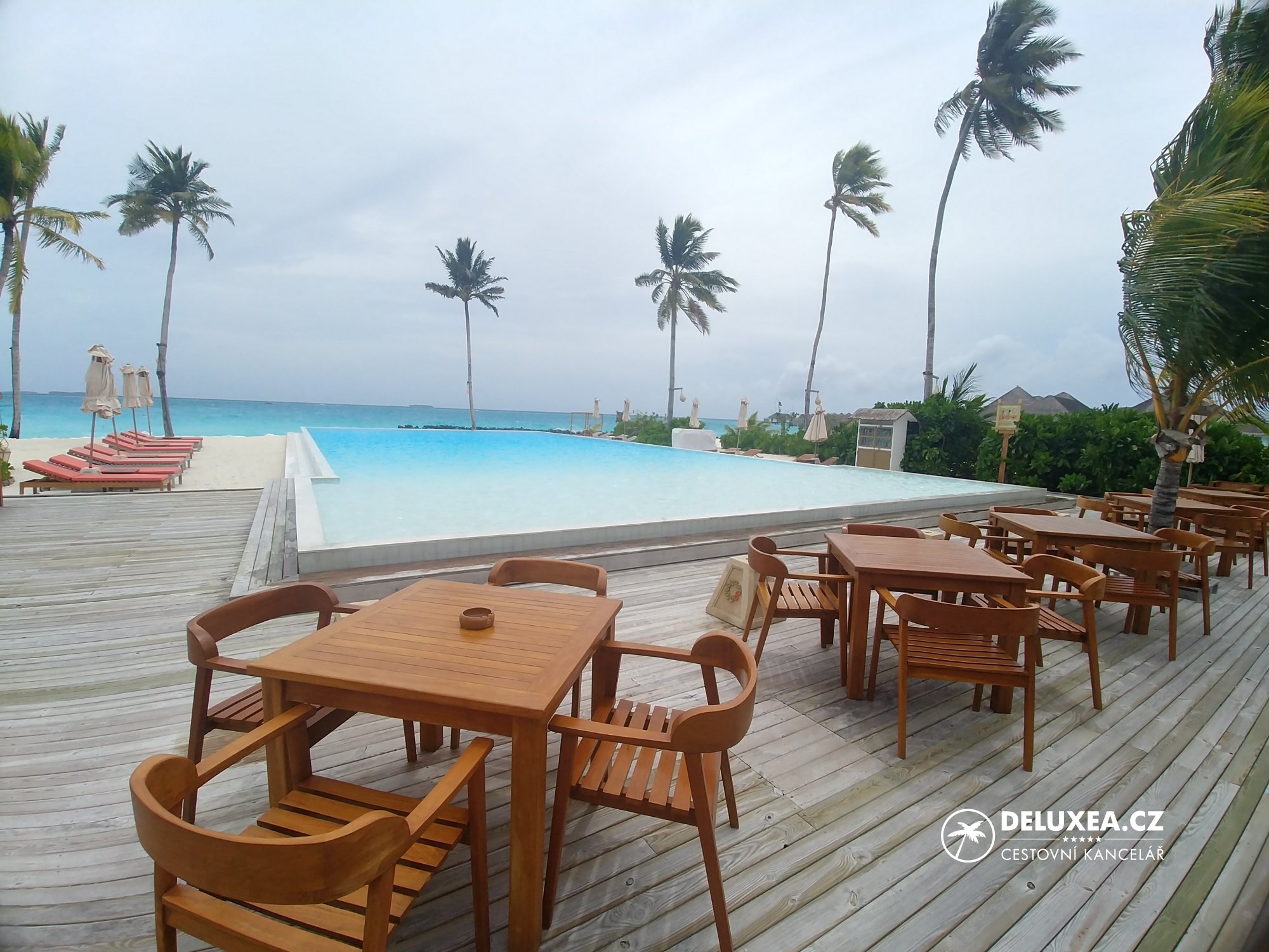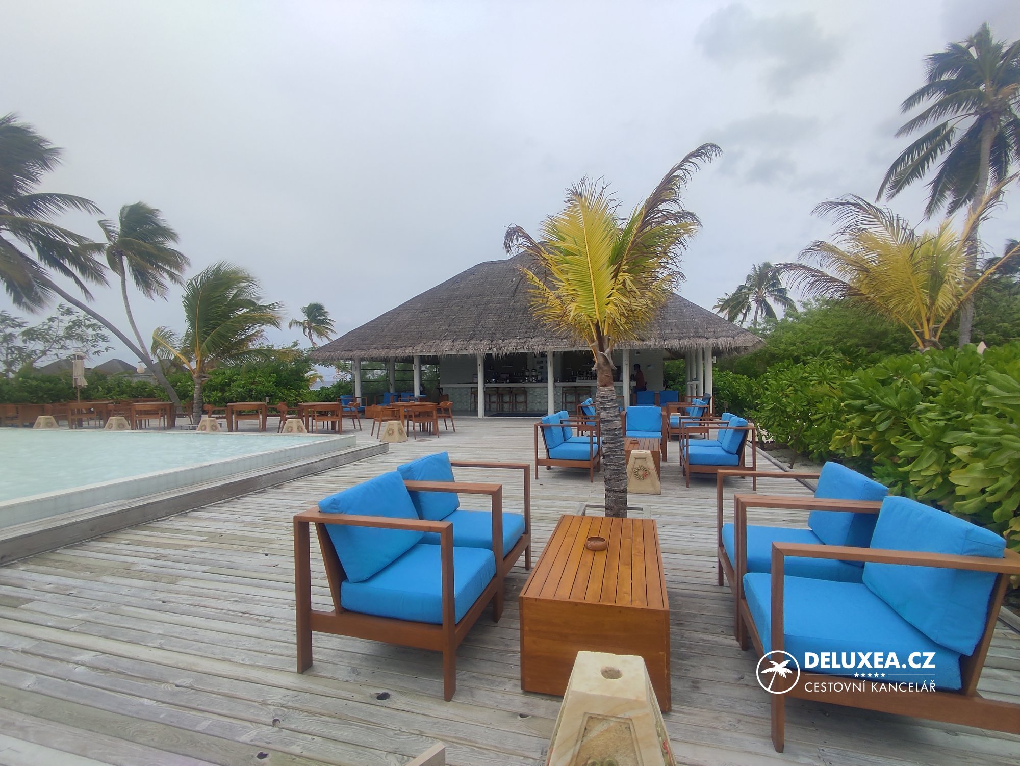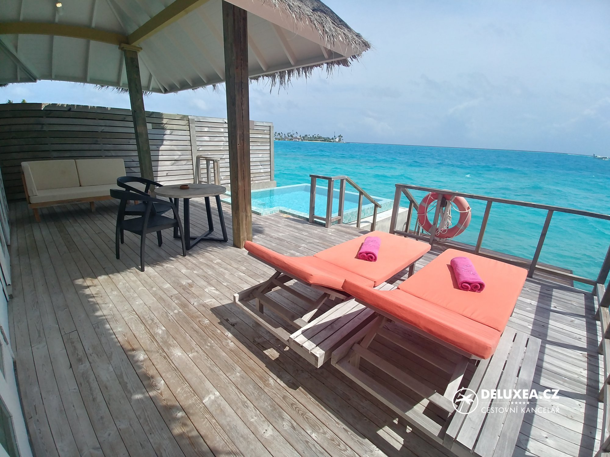 My jsme tentokrát vyzkoušeli nadvodní vilku Ocean Suite with Pool s výhledem na tyrkysovou lagunu. Jelikož jsme nikdy „nad vodou“ nespali, byl to pro nás opravdový zážitek. Zaujal nás jak moderní design vilek včetně prosklených prvků v koupelně, tak prostorná terasa s bazénem a s možností pozorovat západy slunce a okolní podmořský život. Naopak nás trošku překvapilo místní podnebí, kdy nás potkala delší večerní bouřka, při které se vilka lehce „houpala“ a narážely do ní poryvy větru. I pro tyto případy jsou však vily vybavené. Buď využijete deštník, který je u každé vily, nebo si zavoláte na recepci a přijede pro vás golfový vozík.
