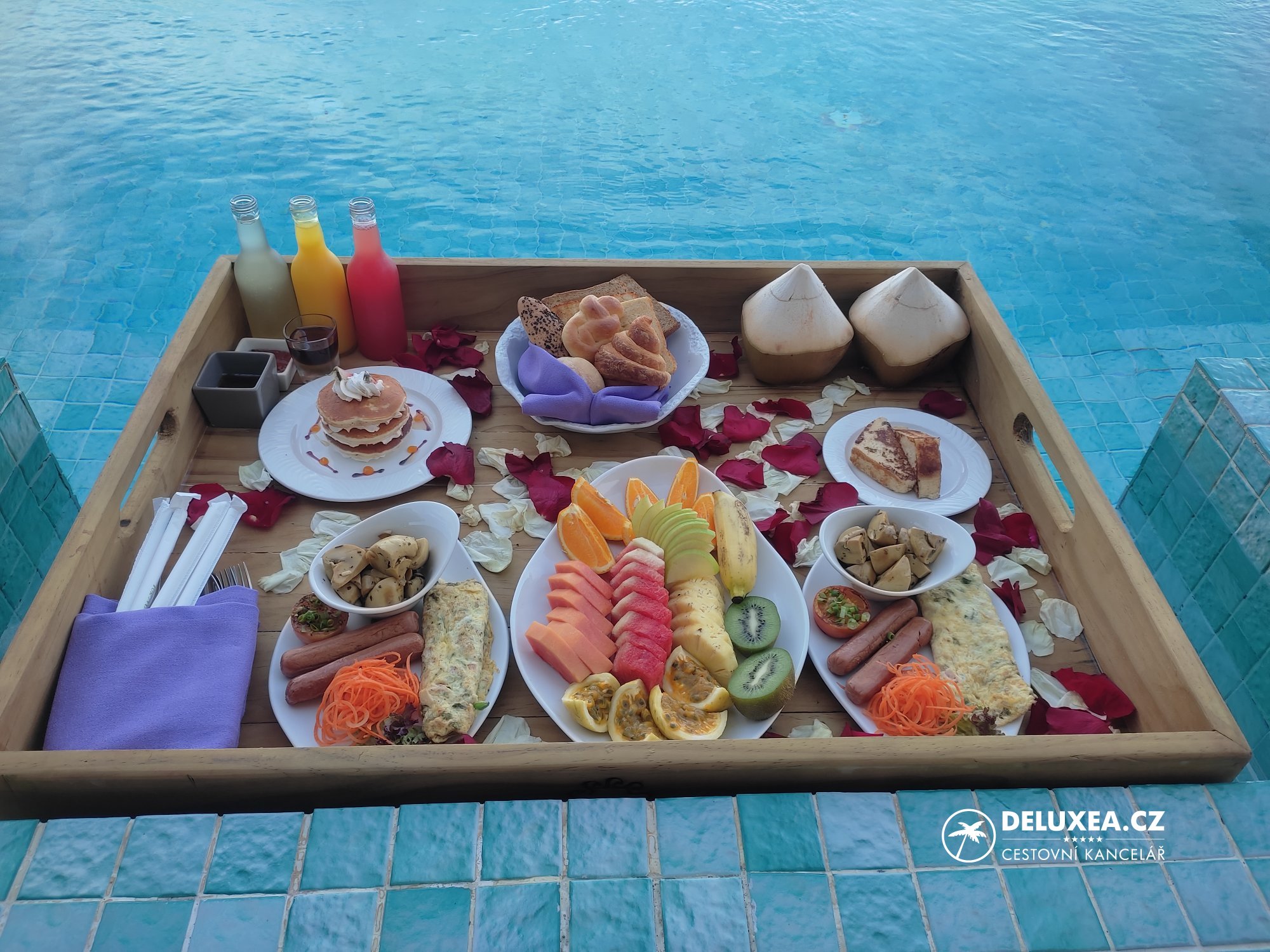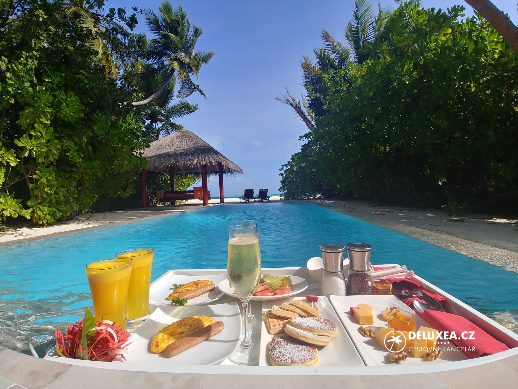Náš pobyt na Sun Siyam Vilu Reef se po čtyřech nocích pomalu přiblížil ke konci. Jako překvapení před odjezdem si pro nás resort připravil plovoucí snídaní v soukromí bazénu naší vilky. Ideální zakončení našeho pobytu :-) Po čtyřech nocích jsme se přesunuli na druhý resort, Sun Siyam Iru Veli. Cesta rychlo člunem trvala necelých 20 minut, během které jsme si užili výhledy na okolní ostrovy.
