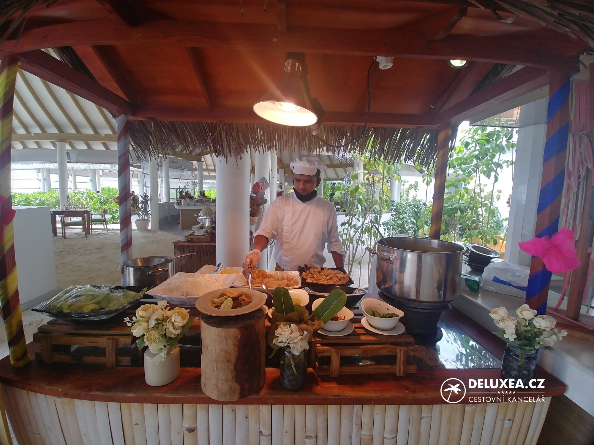 Hlavní restaurace The Aqua má výhodné umístění v blízkosti nadvodních vilek. Nabízí stravování formou bufetu pro snídaně, obědy i večeře, kde si každý vybere. S ohledem na aktuální situaci byla část pokrmů vydávána přímo personálem a např. pečivo, sýry a šunky byly za skleněnou přepážkou. Menu se každý den lehce obměňuje, samozřejmostí bylo dětské menu, vegetariánské varianty pokrmů. Díky umístění nad vodou můžete sedět uvnitř nebo na terase, odkud zajisté spatříte bohatý podmořský život. Během našeho pobytu jsme vyzkoušeli i ostatní restaurace. Pro obědy můžete využít také á la carte restauraci The Spice, která nabízí výběr z italských specialit. Navečer vás naopak vtáhne do dalekých krajů a ochutnáte nejlepší indické speciality. V třetí restauraci Well Done si pochutnáte na mořských plodech a čerstvých rybách. Toto místo je ideální pro romantickou večeři na pláži. Pro obě á la carte restaurace je třeba rezervace. Do budoucna resort také chystá vybudovat restauraci zaměřenou na japonskou kuchyni. Drobné občerstvení a osvěžující nápoje si nejlépe vychutnáte v Positive Energy baru u bazénu. Na odpolední kávu či večerní drink můžete zavítat do baru Nautilis, který se nachází hned vedle příjezdového mola resortu.