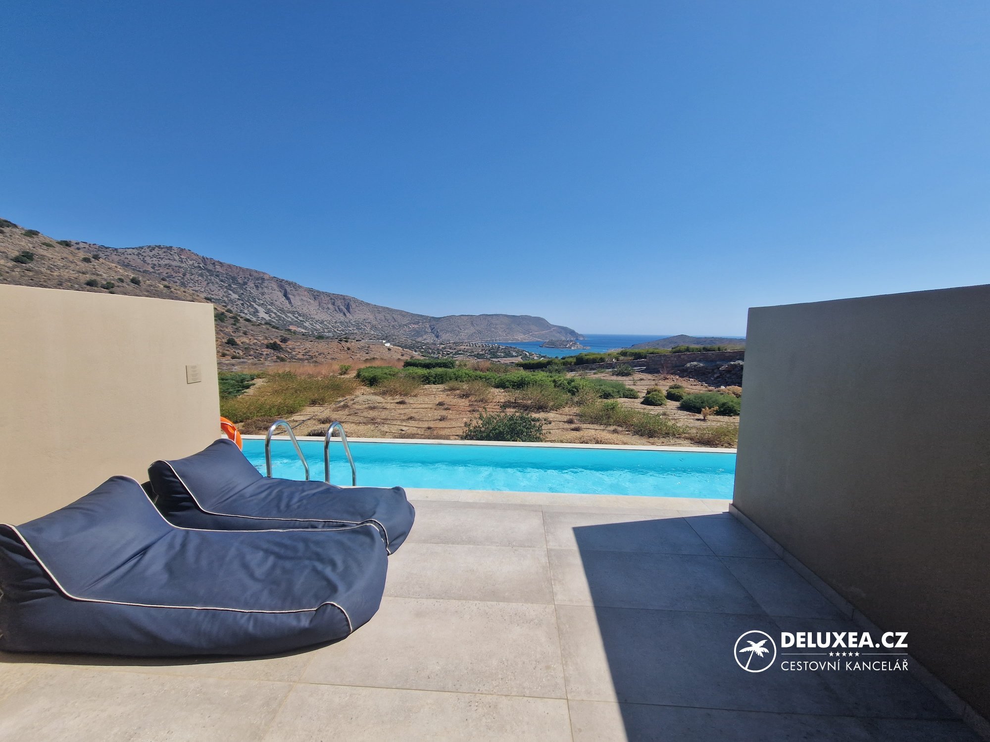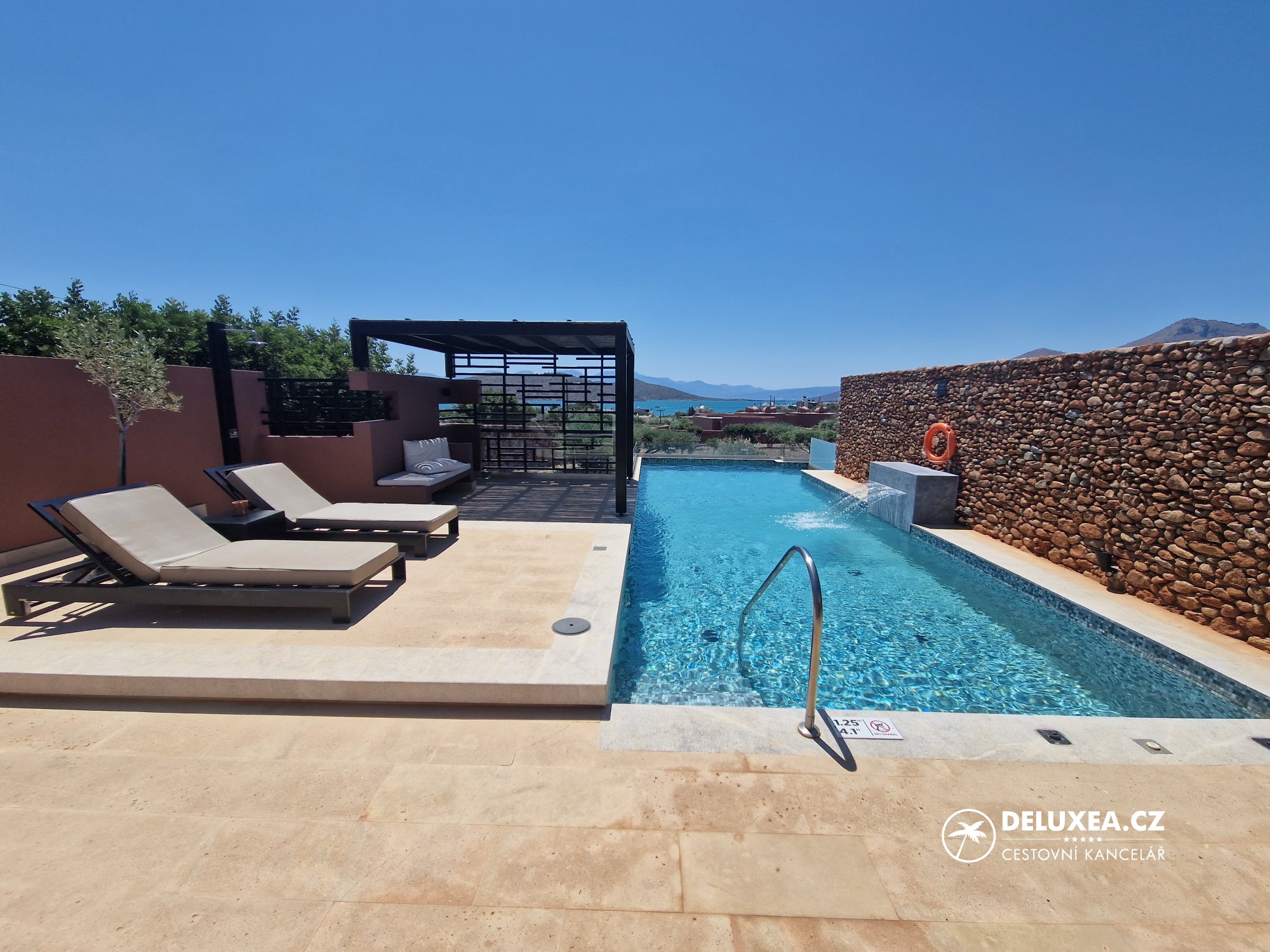 Byli jsme ubytovaní v Sapphire Zen Junior Suite with Private Pool, kde již sám název o sobě vypovídá, že hosté mají v tomto pokoji k dispozici vlastní bazén a k tomu prostornou terasu s výhledem na kouzelný záliv a ještě kouzelnější ostrůvek Spinalonga. Pokoj je velmi dobře koncipovaný a nabízí manželskou postel, samostatnou sprchu a oddělenou toaletu, stejně jako vanu. Samozřejmě prvně bylo v plánu vyzkoušet bazén a hned poté jsme vyrazili na pláž. Přece jen moře je tím hlavním faktorem, proč jsme na dovolenou jeli.
