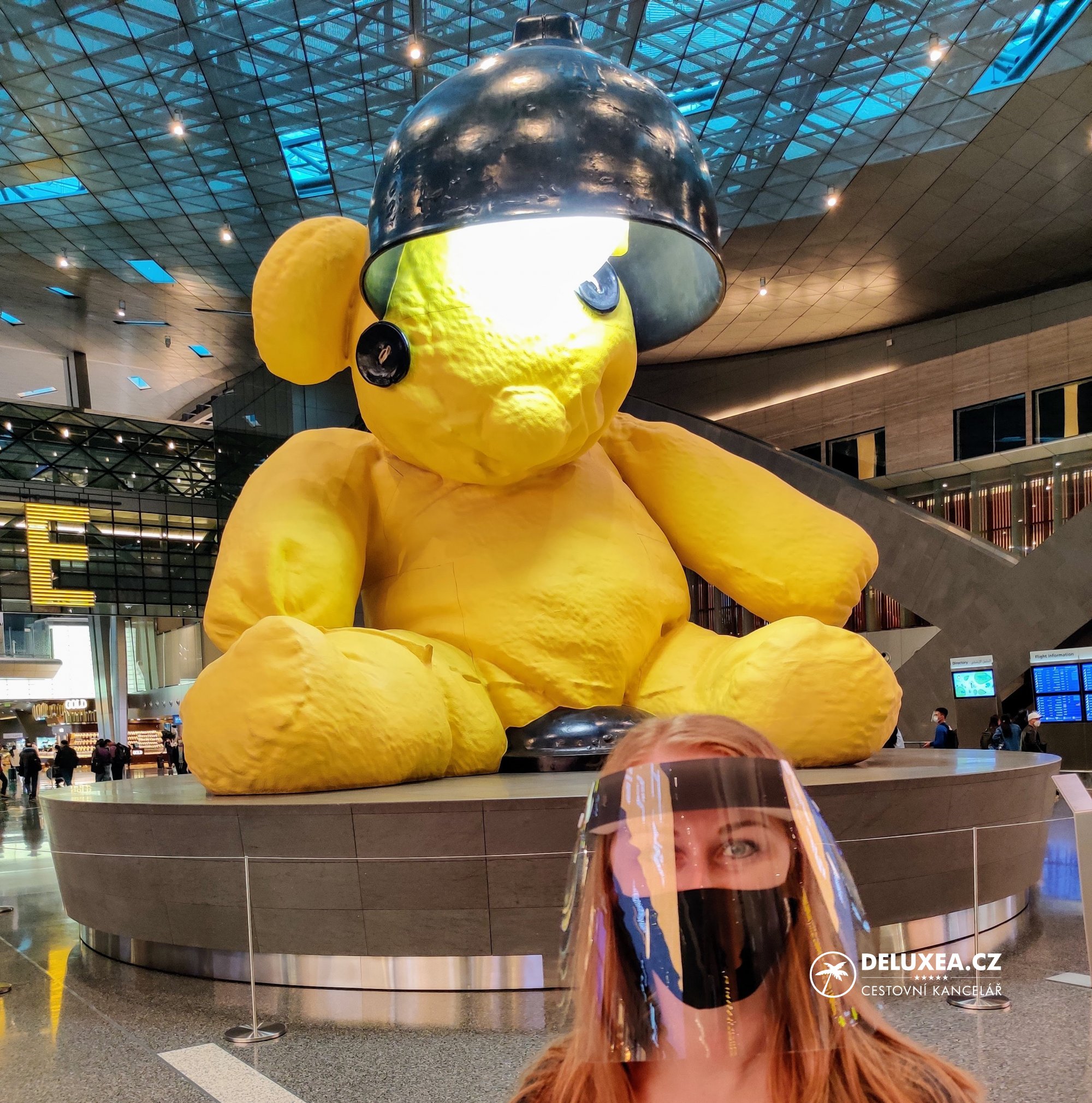 Přestup v Doha proběhl rychle a hladce. Před kontrolou příručních zavazadel se prochází okolo přístroje kontrolující cestujícím teplotu. Osobně jsem si jej ani nevšimla a zaregistrovala ho až při zpáteční cestě domů. Letiště bylo poloprázdné, nejvíce lidí se vyskytovalo v centrální části u velkého zlatého medvěda, který je takový centrální bod letiště, odkud cestující mířili k jednotlivým gate na své lety. Obchody, salonky i food court fungují bez omezení.