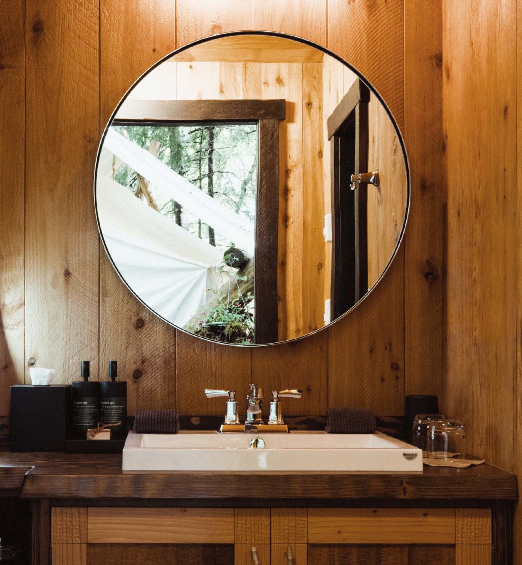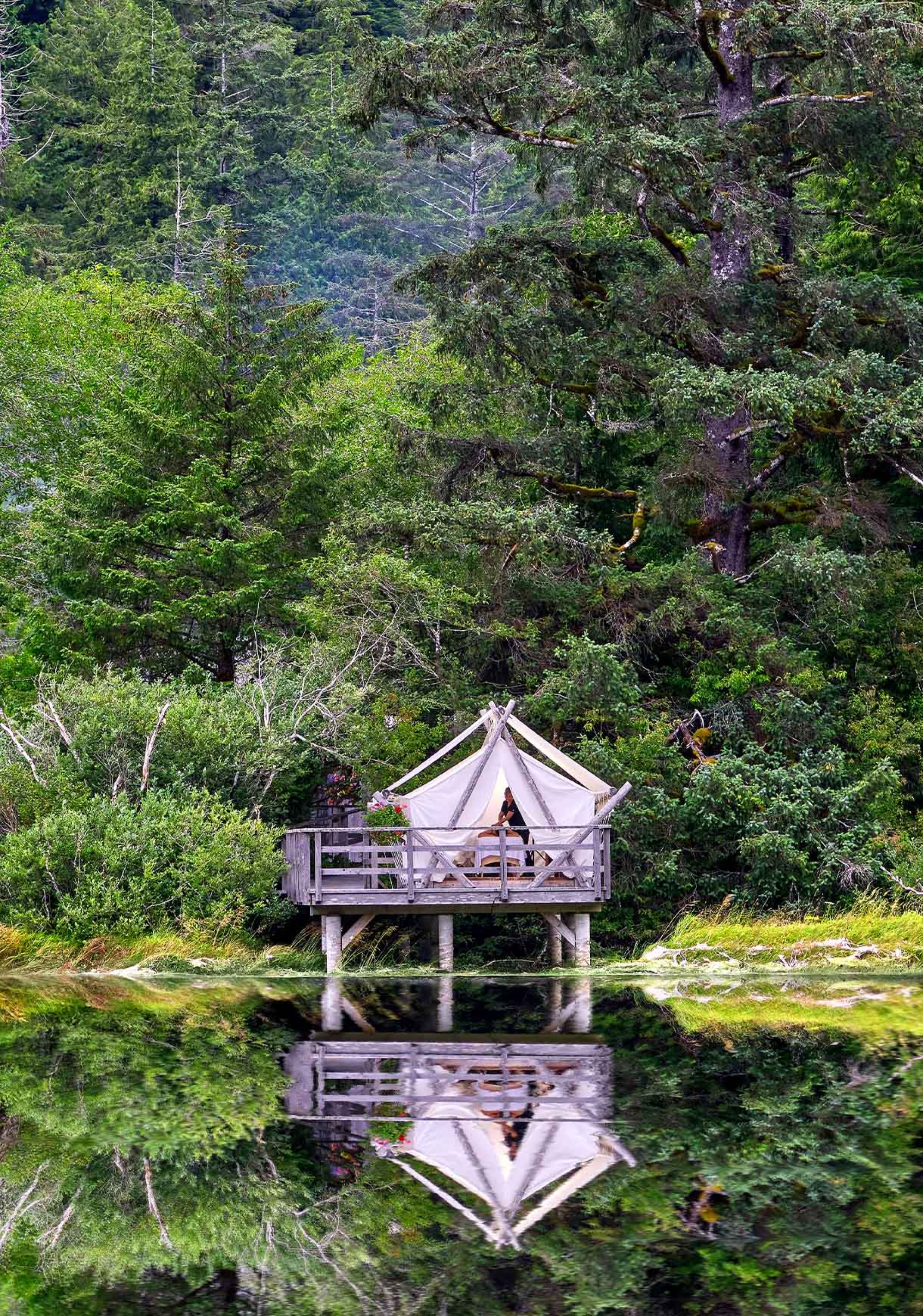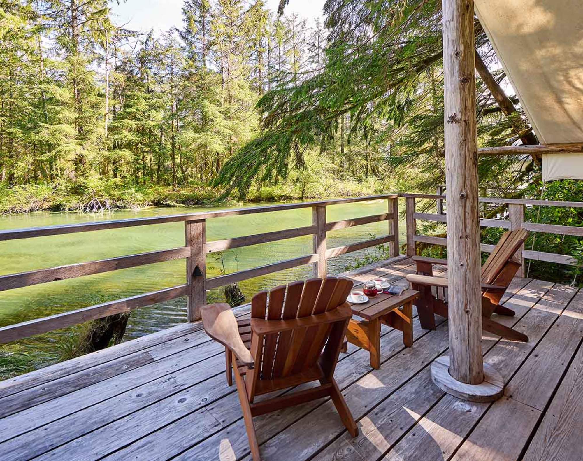 Ubytujte se v tomto unikátním plátěném stanu (55 m2), který je umístěn poblíž mostu na břehu řeky Bedwell a nabízí panoramatické výhledy na vodní hladinu i místní vodní živočichy. Prostorný interiér je vyhříván litinovými kamny a vybaven pracovním stolem, manželskou postelí s luxusním ložním prádlem, rozkládací pohovkou a posezením u kamen. Najdete tu také dekoraci z ohýbaného dřeva, typickou pro původní obyvatele této oblasti. Součástí stanu je koupelna s vyhřívanou podlahou, dvěma umyvadly a venkovní sprchou obloženou cedrovým dřevem. Nechybí ani venkovní terasa s polohovatelnými křesly Adirondack, odkud můžete pozorovat východ slunce nebo řeku protékající deštným pralesem. Maximální kapacita: 2 dospělí a 2 děti.