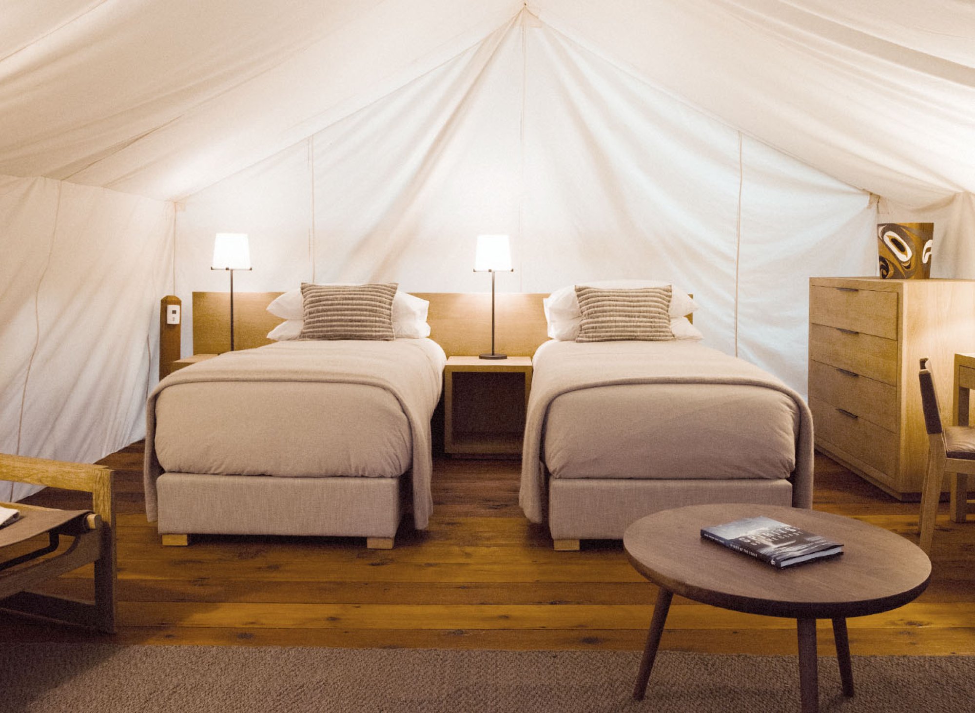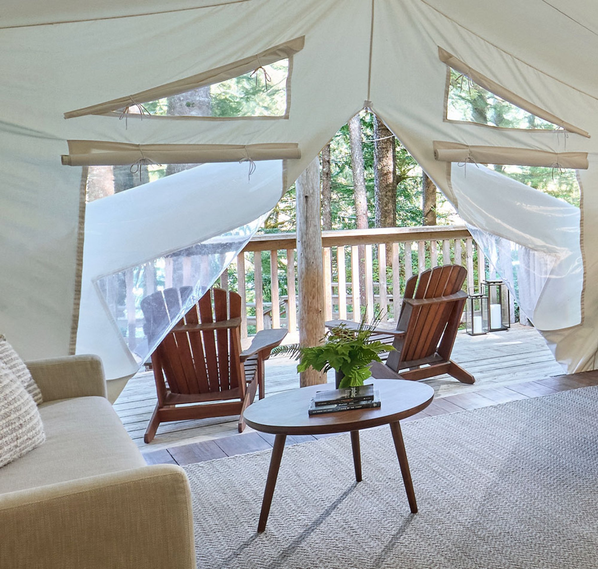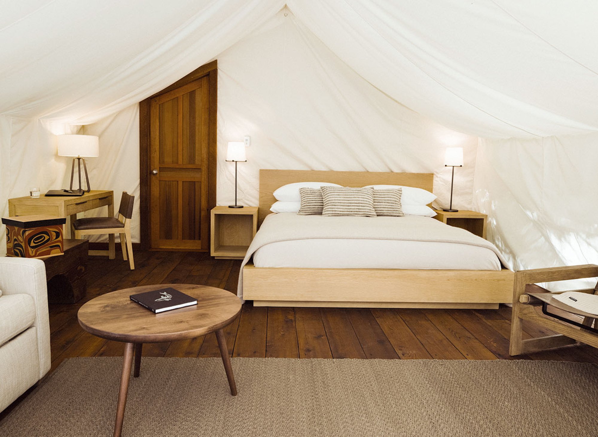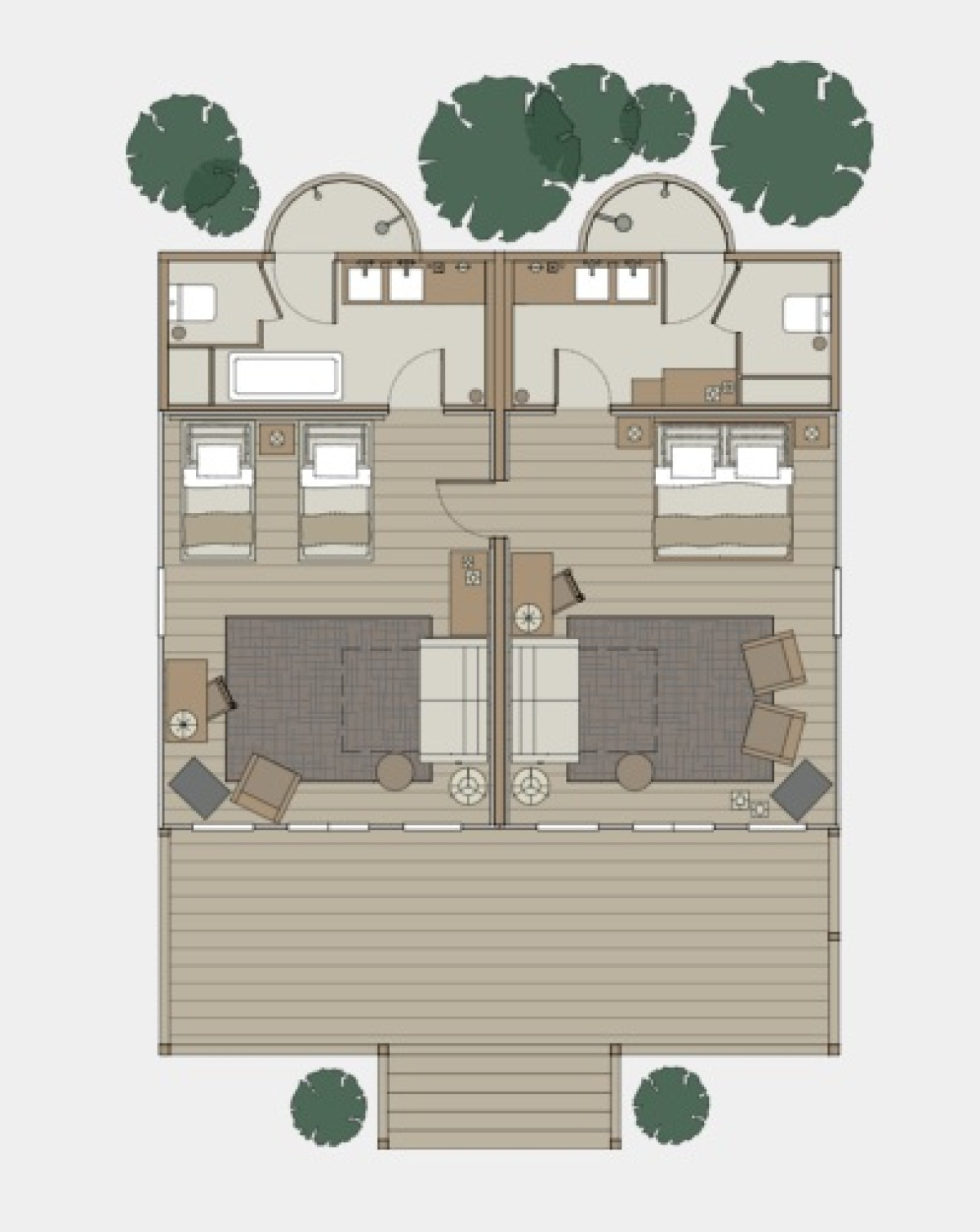 Pro rodiny či skupiny přátel, které potřebují více prostoru, jsou k dispozici tyto propojené stany (115 m2), umístěné vysoko na kopci uprostřed bujného deštného pralesa. Sdílená terasa s pohodlným posezením je jako stvořená k nerušené relaxaci či obdivování výhledů na okolní přírodu a zátoku Clayoquot Sound. Každý stan nabízí svůj vlastní otevřený obývací prostor s pohodlnou rozkládací pohovkou, manželskou postelí (nebo dvěma samostatnými lůžky) a křesílky umístěnými u litinových kamen. K dispozici jsou dvě koupelny uvnitř stanů, vybavené vyhřívanými podlahami, dvěma umyvadly a soukromou venkovní sprchou obloženou cedrovým dřevem. Jedna z koupelen navíc disponuje vanou – ideální pro relaxační koupel po pěší túře. Maximální kapacita: 4 dospělí a 4 děti.