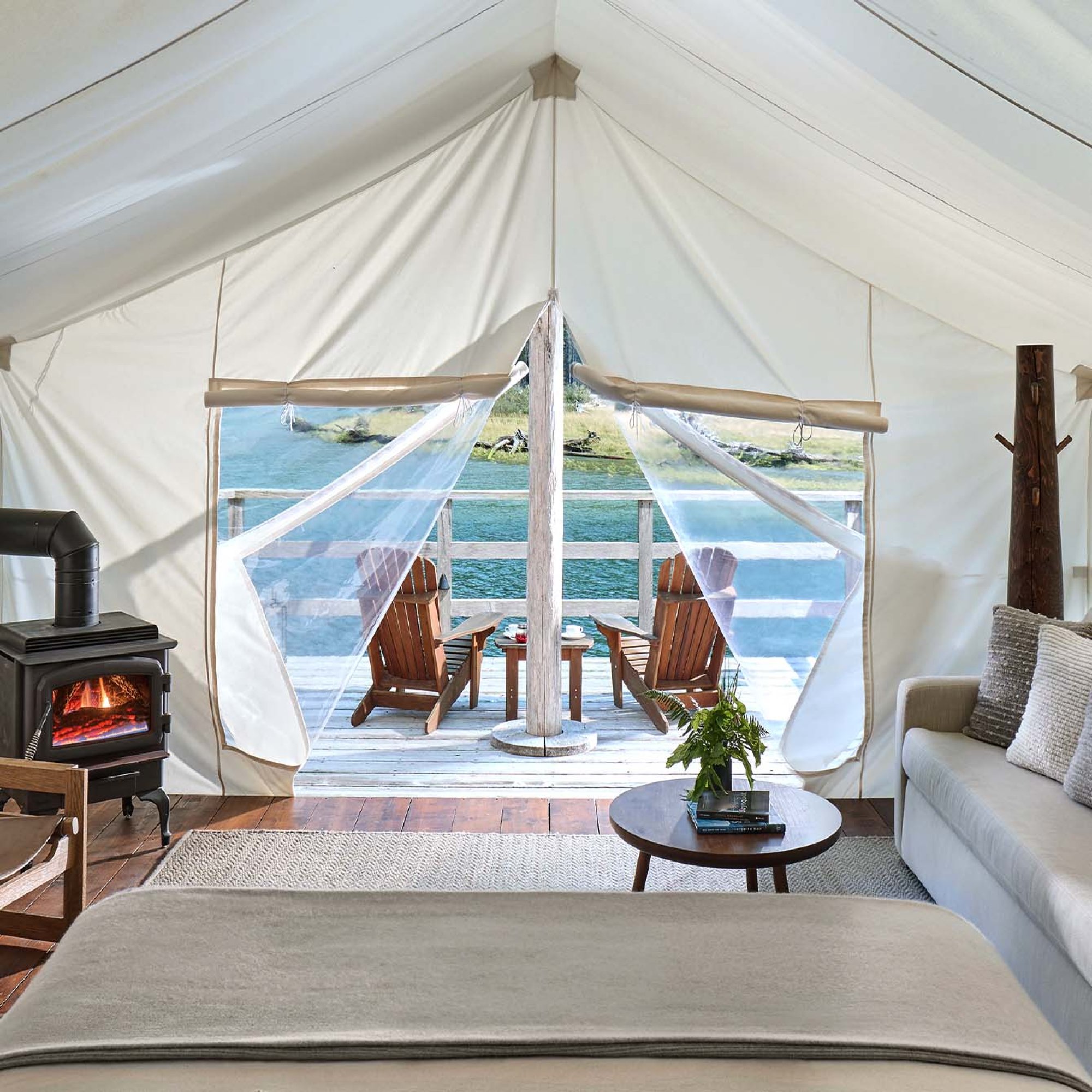 Vychutnejte si dechberoucí výhled na řeku Bedwell a sledujte úchvatný východ slunce přímo ze soukromé terasy tohoto luxusního plátěného stanu (42 m2) na břehu zálivu. Otevřený interiér zahrnuje manželskou postel s luxusním ložním prádlem (nebo dvě samostatná lůžka), obývací část s rozkládací pohovkou a posezení u litinových kamen. Soukromá koupelna s vyhřívanými podlahami a sprchou je umístěná jen pár kroků od stanu. Venkovní veranda je vybavená pohodlnými křesly Adirondack a nabízí ideální místo pro relaxaci či pozorování divoké zvěře. Maximální kapacita: 2 dospělí a 2 děti.