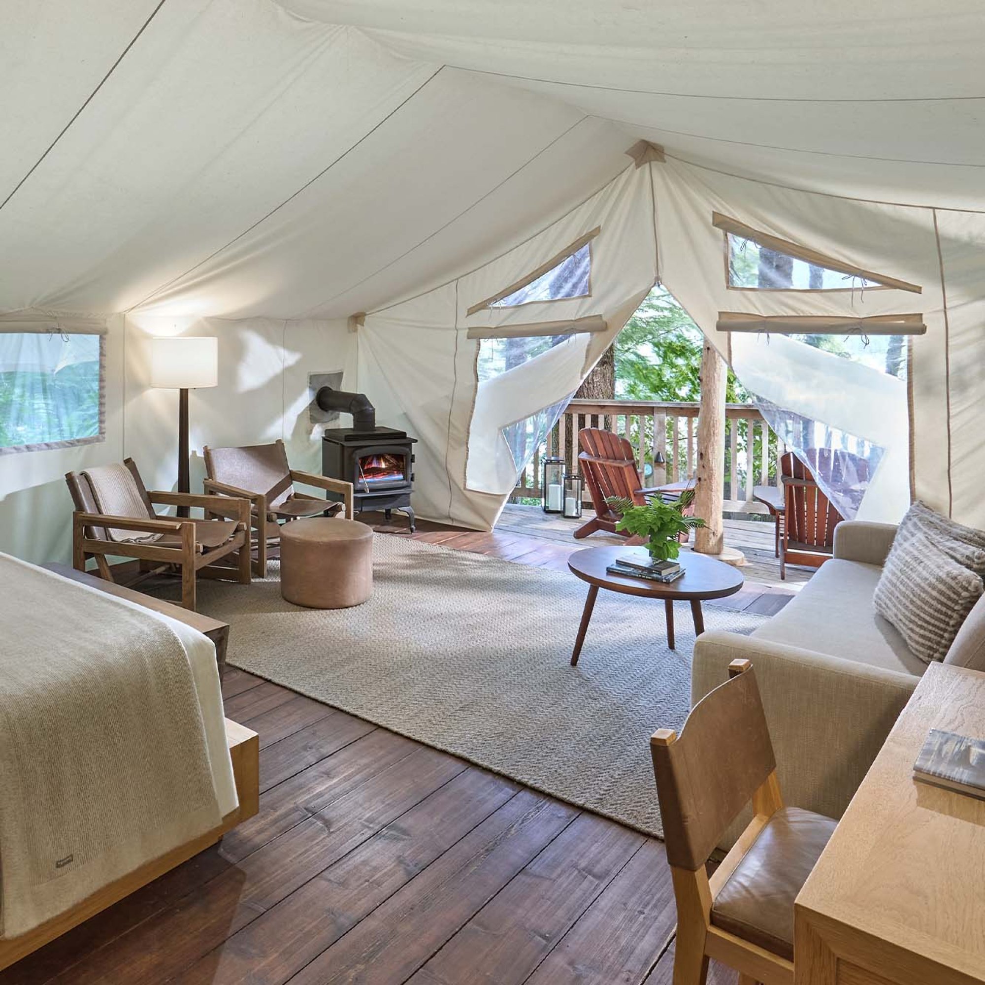 Uprostřed deštného pralesa se nachází útulný stan (48 m2) s plátěnou střechou, který nabízí dokonalé pohodlí a exkluzivní vybavení. Uvnitř najdete pohodlnou manželskou postel s luxusním ložním prádlem (nebo dvě samostatná lůžka), obývací část s rozkládací pohovkou a posezení u litinových kamen. Soukromá koupelna s vyhřívanými podlahami a sprchou se nachází jen pár kroků od stanu. Kromě toho se můžete těšit na vlastní verandu s tradičními křesly Adirondack – ideální místo pro relaxaci s knihou v ruce. Maximální kapacita: 2 dospělí a 2 děti.