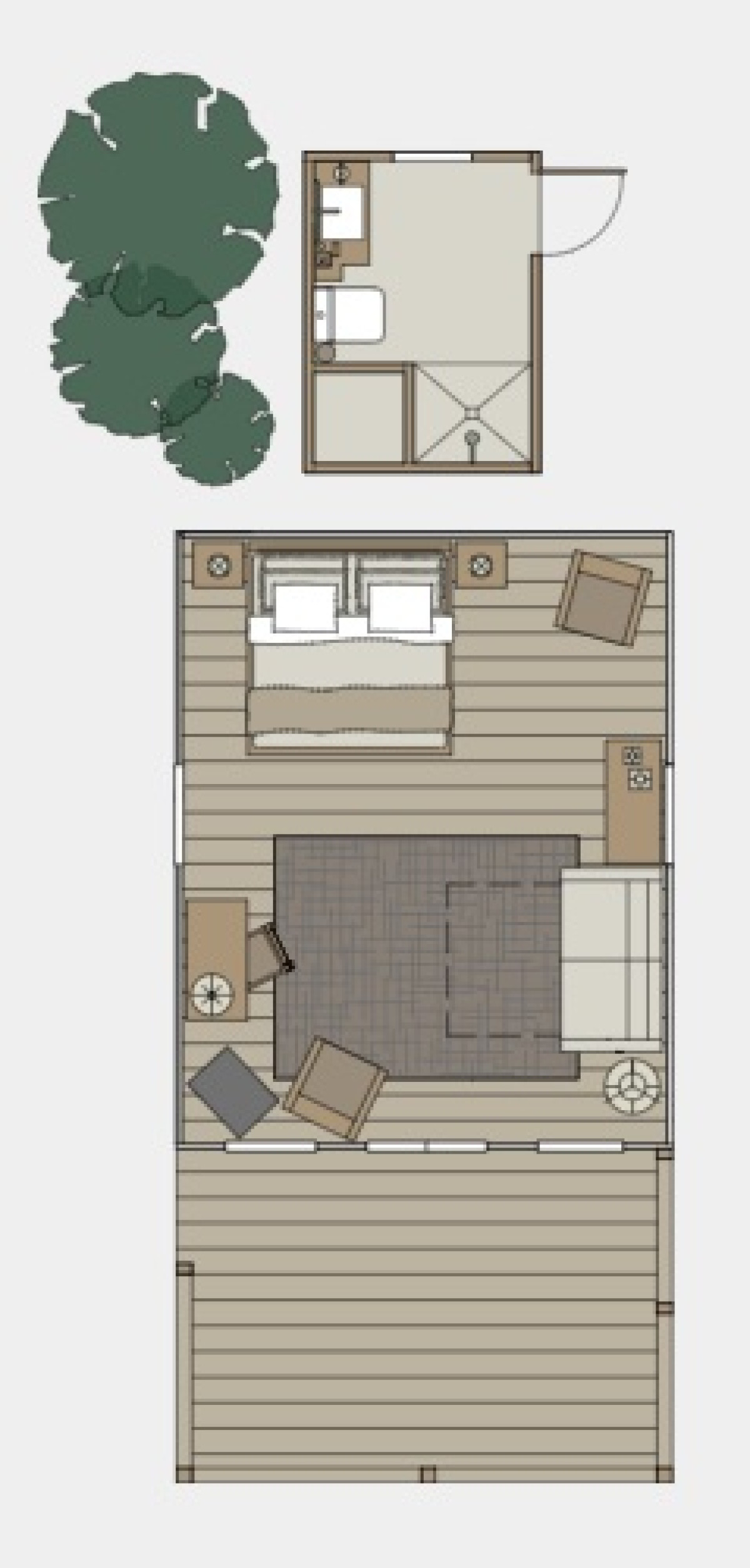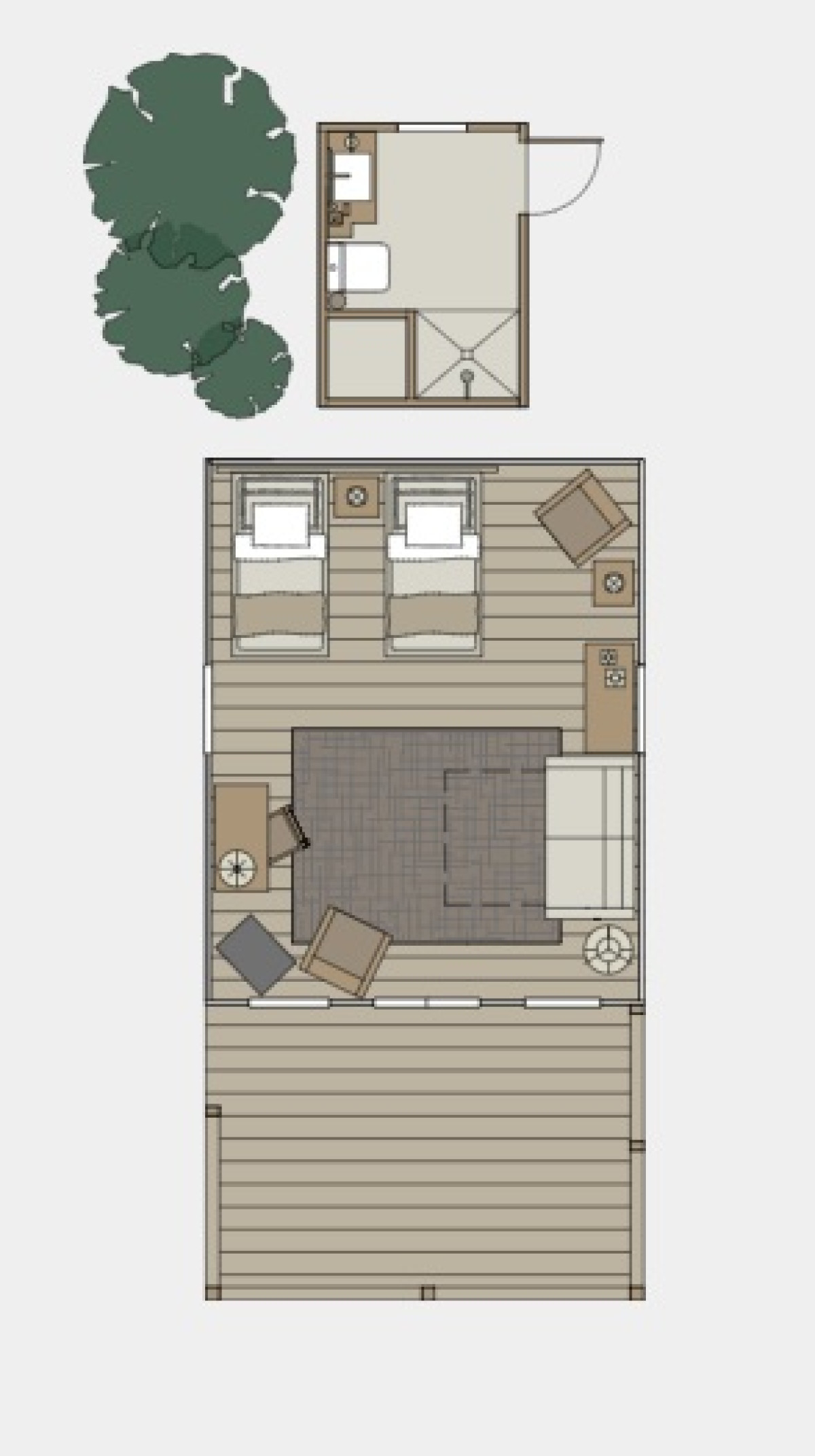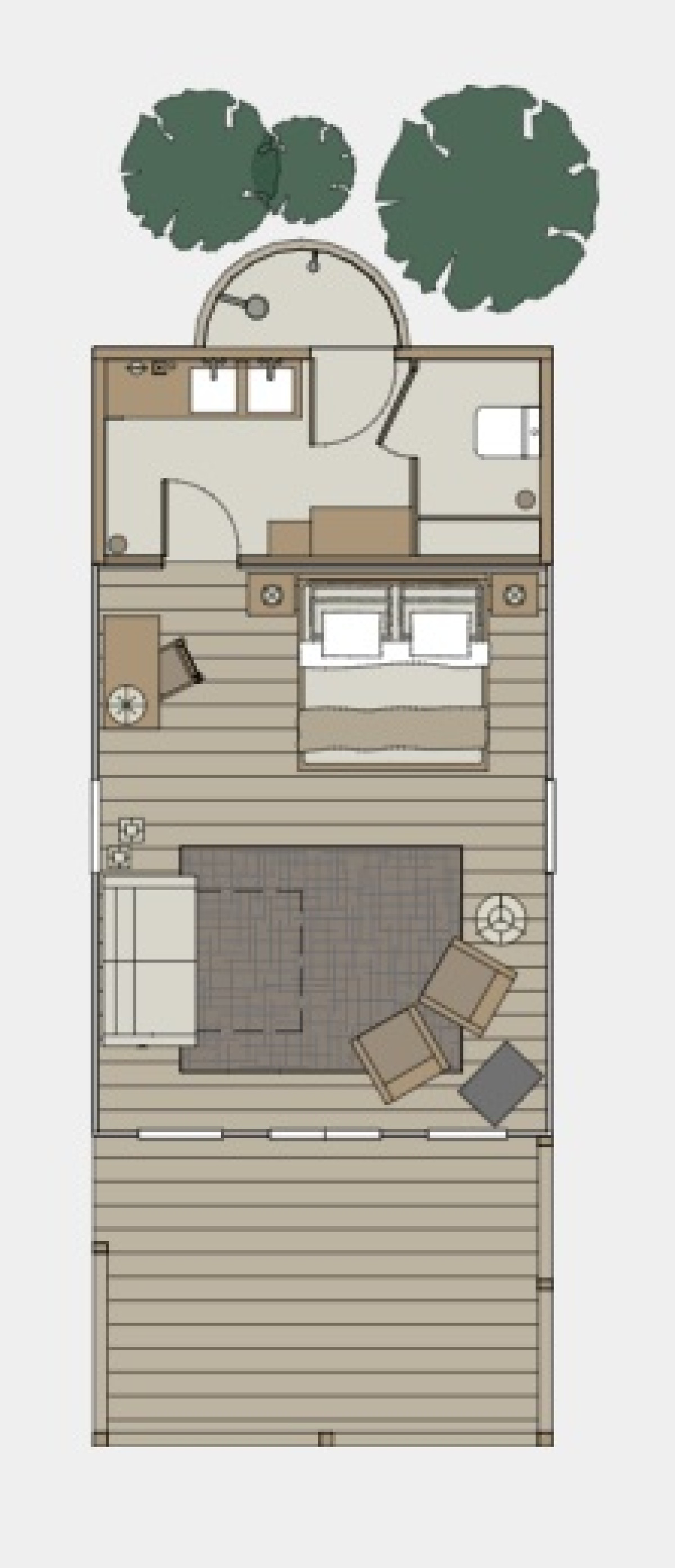 Dopřejte si ještě více pohodlí v podobě tohoto prostorného plátěného stanu (55 m2), který nabízí luxusní ubytování v obklopení deštného pralesa. Soukromá veranda je vybavena polohovatelnými křesly, odkud se můžete kochat okolní přírodou. Součástí otevřeného interiéru je manželská postel s luxusním ložním prádlem (nebo dvě samostatná lůžka), obývací část s rozkládací pohovkou a posezení u litinových kamen. Uvnitř stanu se nachází také koupelna s vyhřívanou podlahou, dvěma umyvadly a venkovní sprchou obloženou cedrovým dřevem s výhledem na koruny stromů. Maximální kapacita: 2 dospělí a 2 děti.