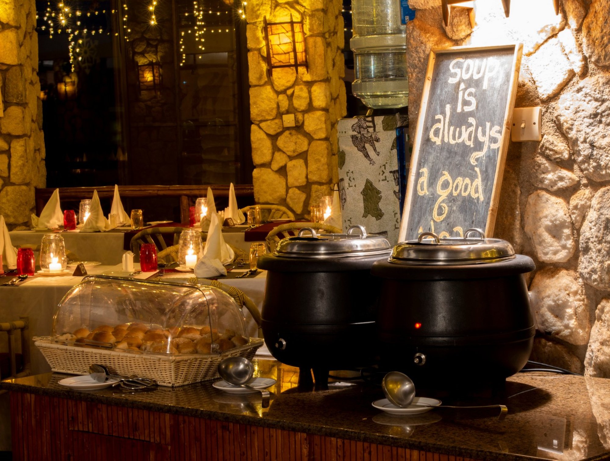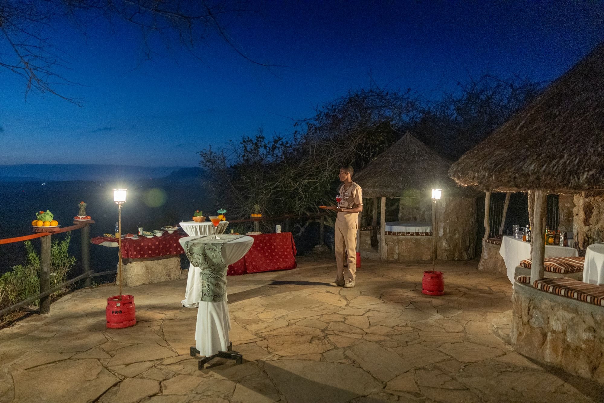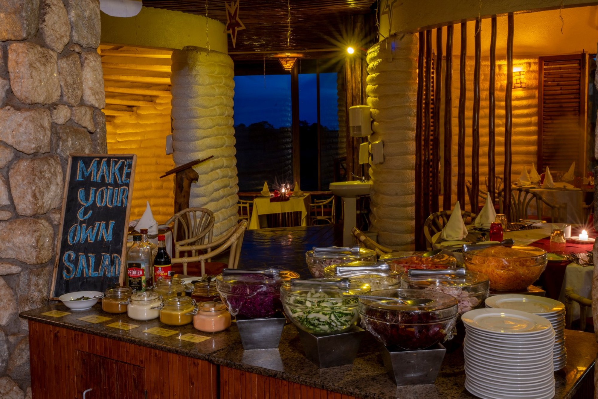 Bura Restaurant – Hlavní restaurace s kapacitou 150 osob nabízí úchvatný výhled na napajedla pro divokou zvěř. Podávají se zde snídaně, obědy a večeře formou bufetu a k dispozici jsou i otevřená kuchařská stanoviště, kde vám připraví nejrůznější speciality na počkání. Můžete se těšit na vynikající panafrickou, panevropskou a panasijskou kuchyni.