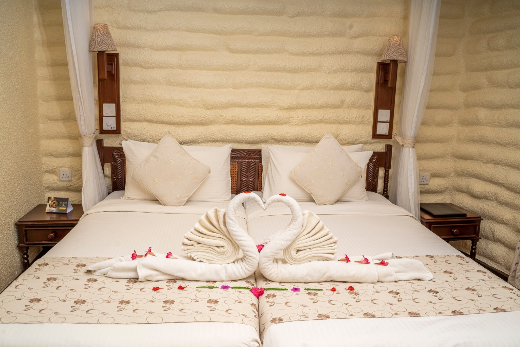 Součástí špičkového vybavení každého pokoje je: luxusní ložní prádlo a ručníky, moskytiéra, stropní ventilátor, elektrické zásuvky 220 V / 50 Hz AC a zásuvky na holicí strojek, noční lampičky, digitální trezor, příslušenství na přípravu kávy a čaje, osvětlené šatní skříně, psací stůl, cedule na dveře „Nerušit“, fén na vlasy (na vyžádání), osvětlené zrcadlo v koupelně, Wi-Fi připojení.