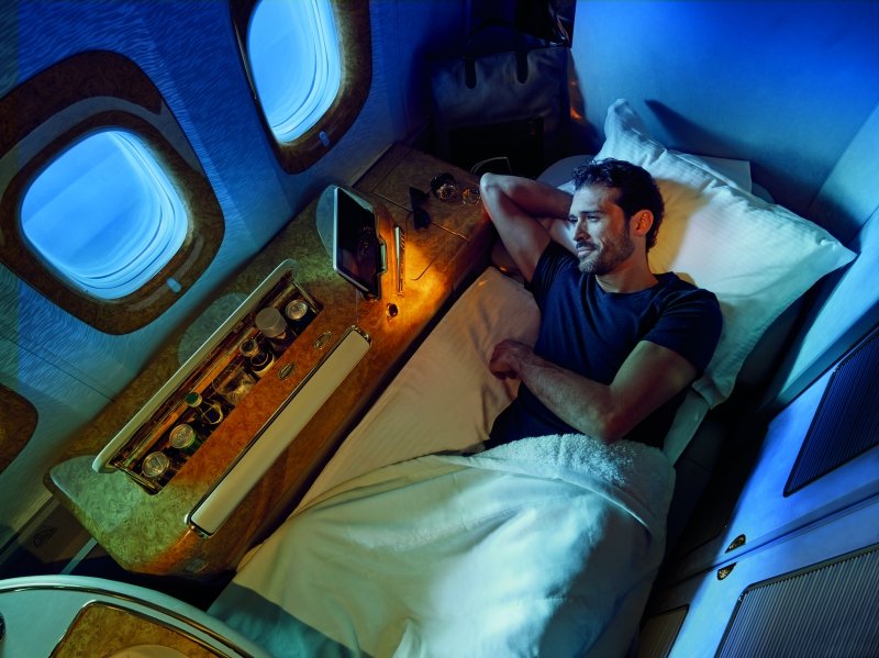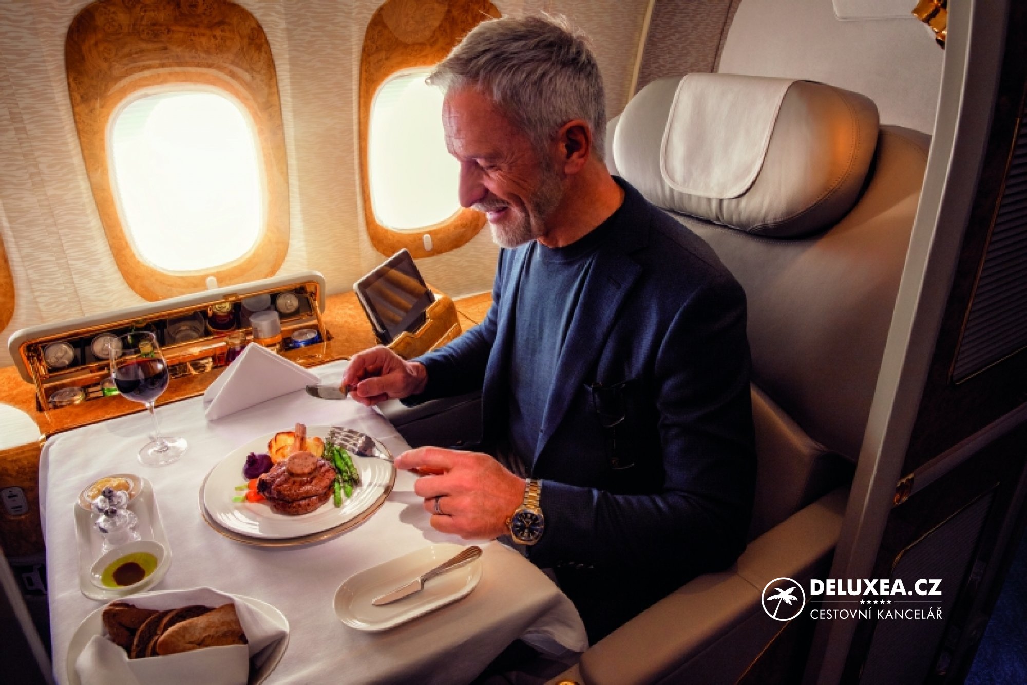 Airbus A380 se svou vysokou kapacitou a ekonomickým způsobem provozu představuje jeden z hlavních pilířů růstu Emirates. První třída v Emirates A380 skýtá cestujícím nový svět inovace a luxusu. Klienti si mohou dlouhé hodiny letu zpříjemnit v jedinečných soukromých apartmánech (suites) první třídy. Každý centimetr těchto suites byl pečlivě vytvořen tak, aby splnil a překonal veškerá vaše očekávání a komfortem se vyrovnal cestování soukromým letadlem. Na horní palubě letounu A380 jsou pro cestující první třídy k dispozici nádherně koncipované sprchové koutky, v nichž se můžete hýčkat prvotřídní kosmetikou navrženou pro stimulaci Vašich smyslů. Salónek na palubě Airbusu A380 je k dispozici cestujícím první a business třídy a je možné se zde občerstvit nebo jen tak relaxovat.