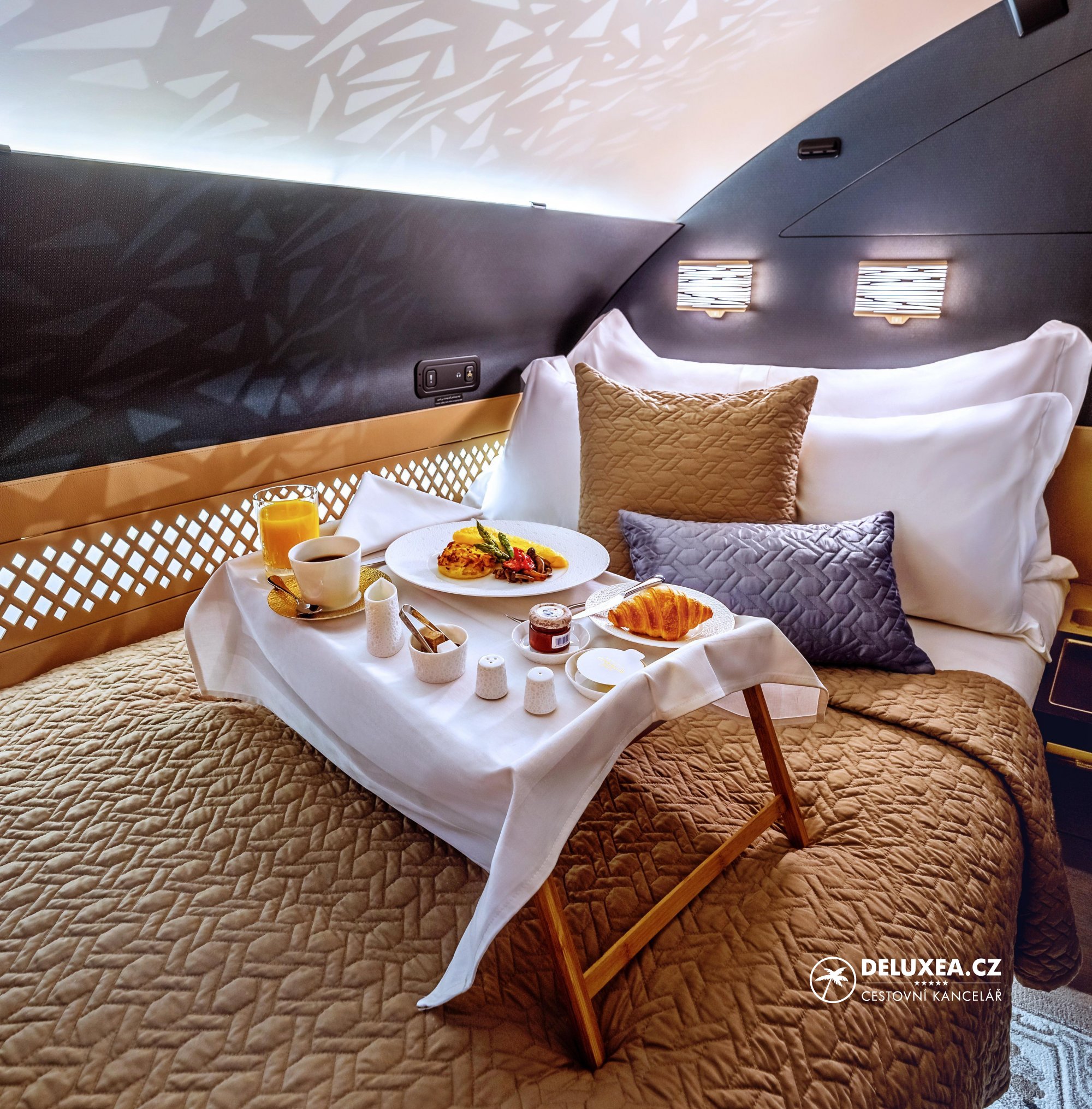 Airbus A380 je největším osobním dopravním letounem současnosti. Paluba je rozdělena na dvě podlaží. Na horní palubě naleznete luxusní rezidenci, suites první třídy, sprchy pro cestující první třídy, business třídu a bar pro první a business třídu. Zvláštností je modlitebna na obou podlažích. Suites nabízejí cestujícím absolutní soukromí, kdy sami můžete rozhodnout o požadované úrovni kontaktu s okolím. Ve všech třídách je cestujícím k dispozici velmi kvalitní servis i vybavení, pohodlná sedadla a velkorysý prostor.
