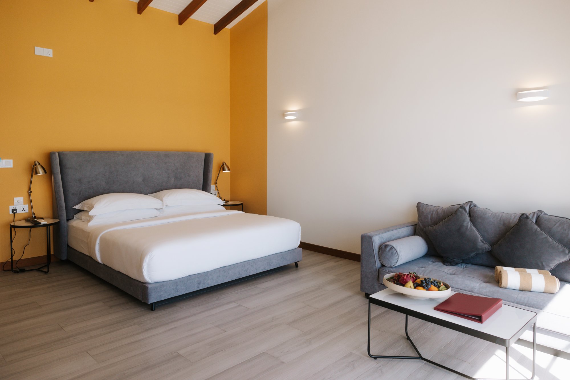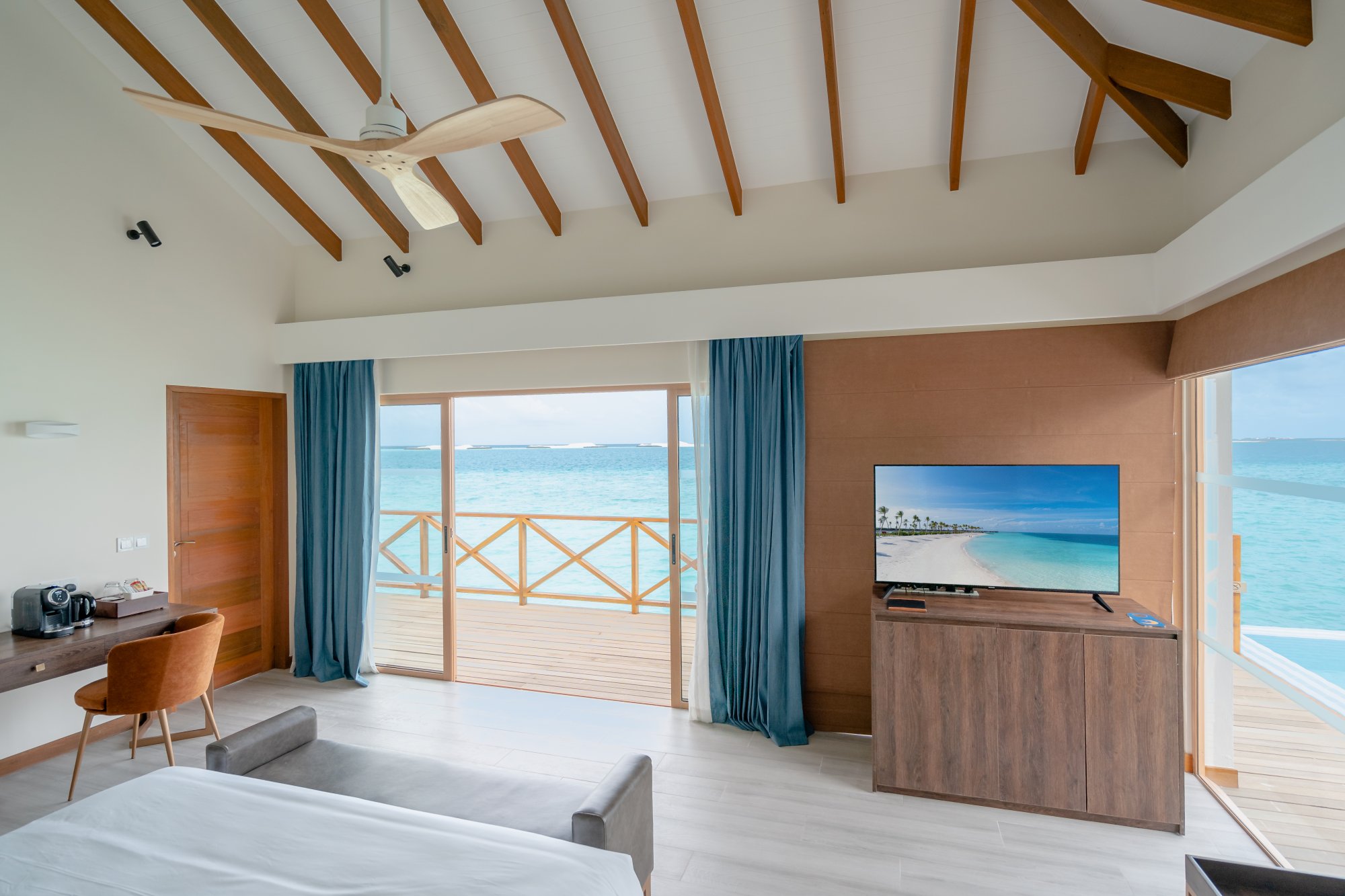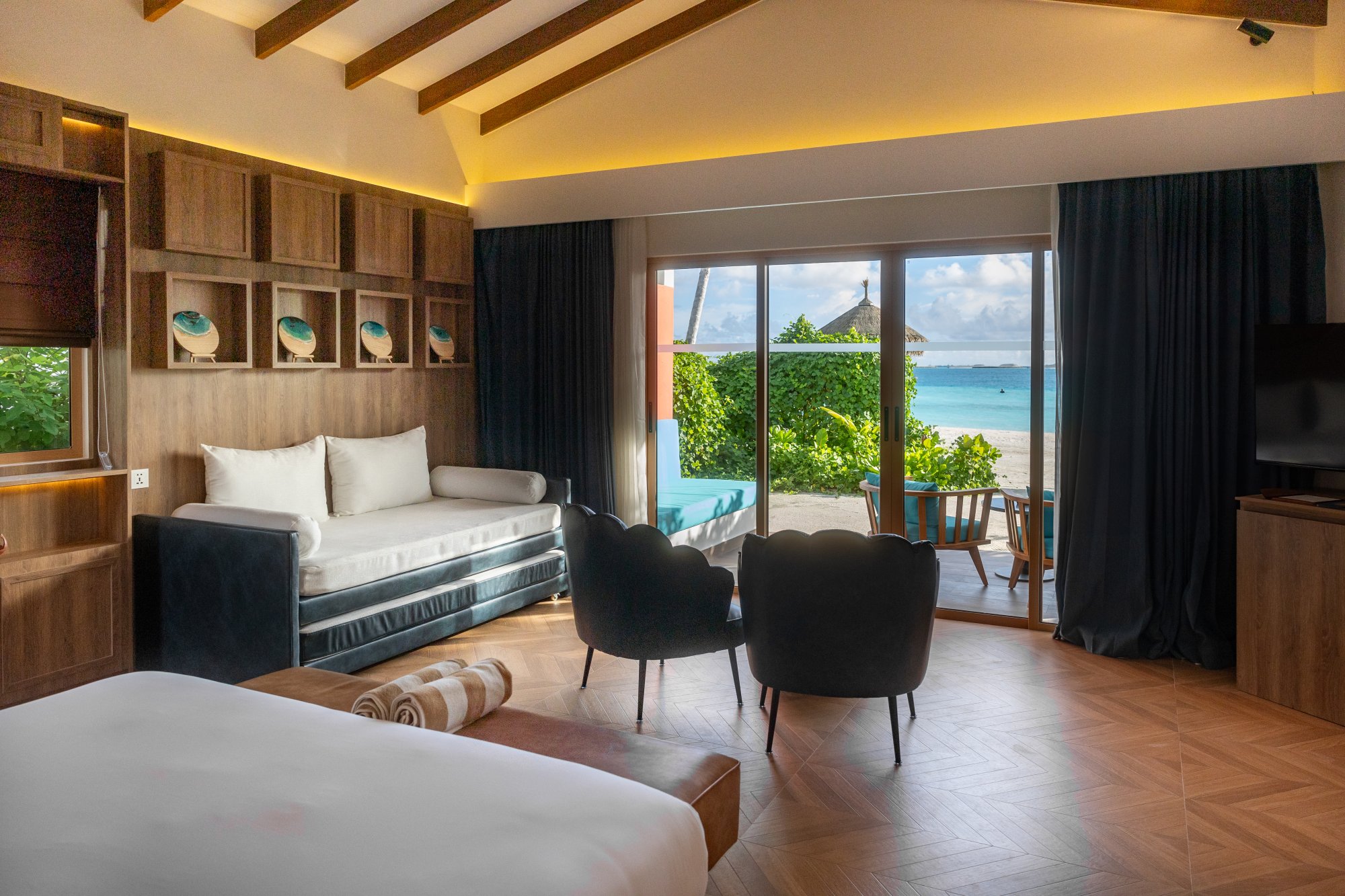 Suita na pláži vám poskytne velkorysý prostor na západní části ostrova, odkud můžete pozorovat nádherné západy slunce. Uvnitř najdete velký obývací pokoj, manželskou postel a typickou maledivskou venkovní koupelnu. Maximální kapacita: 3 dospělí a 1 dítě.