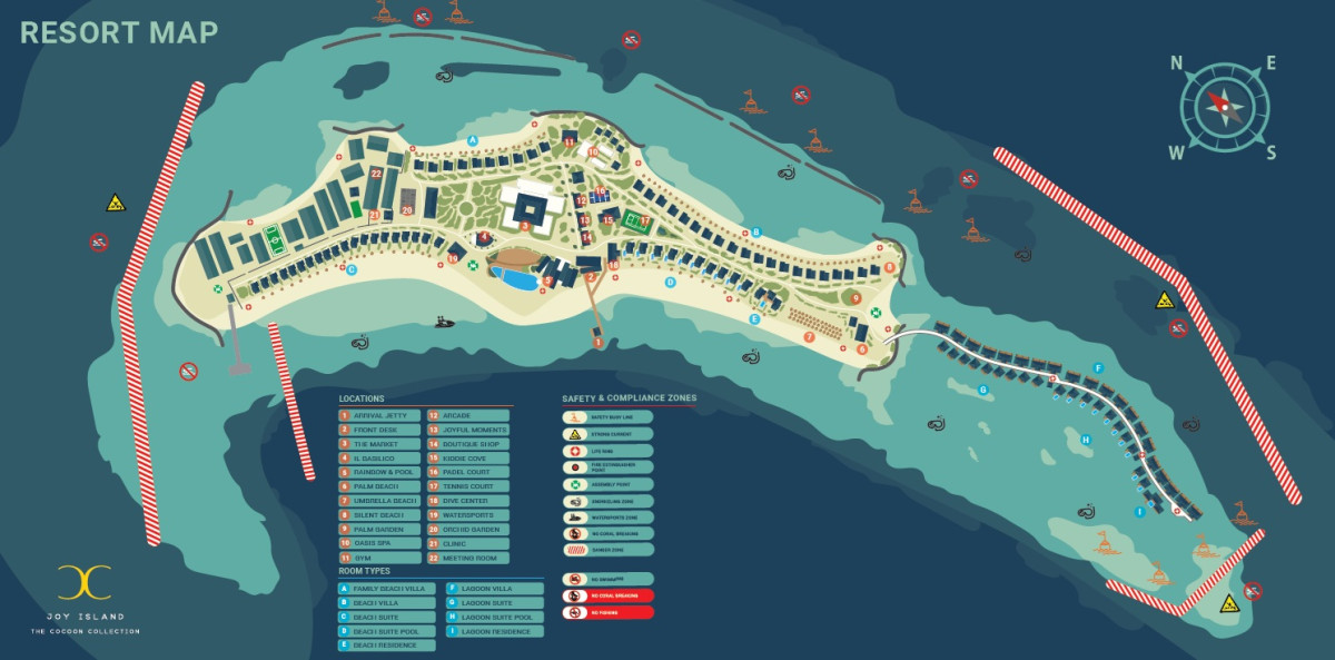 Kolekce ubytování zahrnuje 151 nádherně zařízeních luxusních vil. Stačí si vybrat, zda chcete bydlet přímo na pláži nebo ve vile stojící nad tyrkysovou lagunou. K dispozici jsou také vilky se soukromým bazénem. Hotel Joy Island se navíc může pochlubit čtyřmi prvotřídními restauracemi a bary s pestrým výběrem pokrmů z celého světa, které jsou zárukou nezapomenutelných kulinářských zážitků. Pro malé hosty je zde k dispozici dětský klub Kiddie Cove.