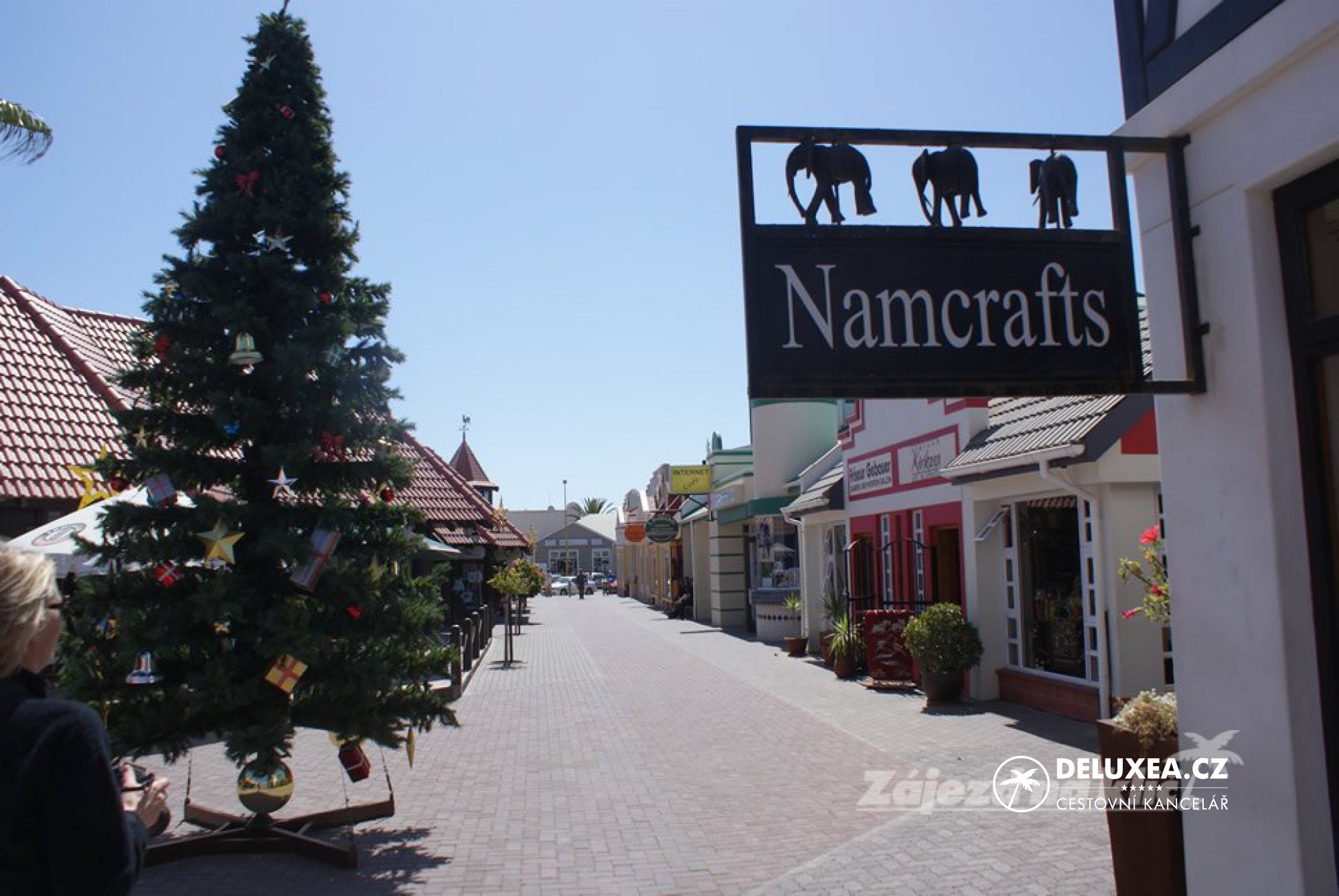 Ještě toho dne jsme se vydali na cestu na pobřeží Atlantiku, do turistického města Swakopmund. Cesta je 350 km dlouhá a zabere necelých 5 hodin. Namibii se říká „země kontrastů“ a je zajímavé pozorovat, jak se zdejší krajina opravdu mění: z hor okolo Windhoeku jsme se přes pás rozlehlých savan, porostlých typickou nažloutlou trávou, dostali až do pouště, jež přímo hraničí s oceánem. První, čeho si po vystoupení z auta povšimnete, je teplota: je tu o poznání chladněji (cca 20 °C) než ve Windhoeku (přes 30 °C). Swakopmund žije turismem – ve dne tu na ulicích potkáte davy návštěvníků. Já jsem si na zdejším trhu (nachází se u palmové promenády blízko majáku) na památku koupil dvě misky, ručně vyřezávanou sošku zebry a malované plátno, na kterém jsou žirafy a sloni. Poobědvali jsme v restauraci Lighthouse, já jsem si dal místní kulinářskou specialitu – steak z oryxe (přímorožce afrického, je to druh antilopy) a musím říct, že byl výborný.