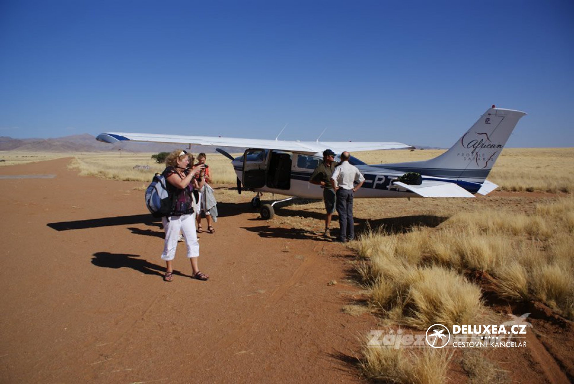 Pro cestu je potřeba mít vízum, pro české a slovenské občany ho vydává namibijská ambasáda ve Vídni. Z Evropy se do Namibie dostanete jednoduše – z Frankfurtu nad Mohanem sem létá šestkrát týdně letecká společnost Air Namibia. Tam i zpět se létá přes noc, z Frankfurtu se startuje v 8 večer a let trvá 10 hodin. (Letové řády do Namibie najdete zde.) Časový posun oproti středoevropskému času je v prosinci + 1 hodina. Personál je velmi vstřícný a cesta rychle ubíhá – po vzletu se servíruje vydatná večeře, kterou můžete zapít šálkem kávy nebo skleničkou vína. Pokud chcete, můžete se na exotickou destinaci naladit už na palubě letadla jihoafrickou specialitou – ovocným likérem Amarula. Poté se uvelebíte a usnete, a v 7 hodin ráno se při východu slunce probudíte ve chvíli, kdy dosedáte na ranvej mezinárodního letiště Hosea Kutako Airport blízko hlavního města Namibie Windhoeku. Jde samozřejmě o mezinárodní letiště afrických dimenzí – žádné město v dohledu, jen jedna malá budova a široká pláň okolo ní.