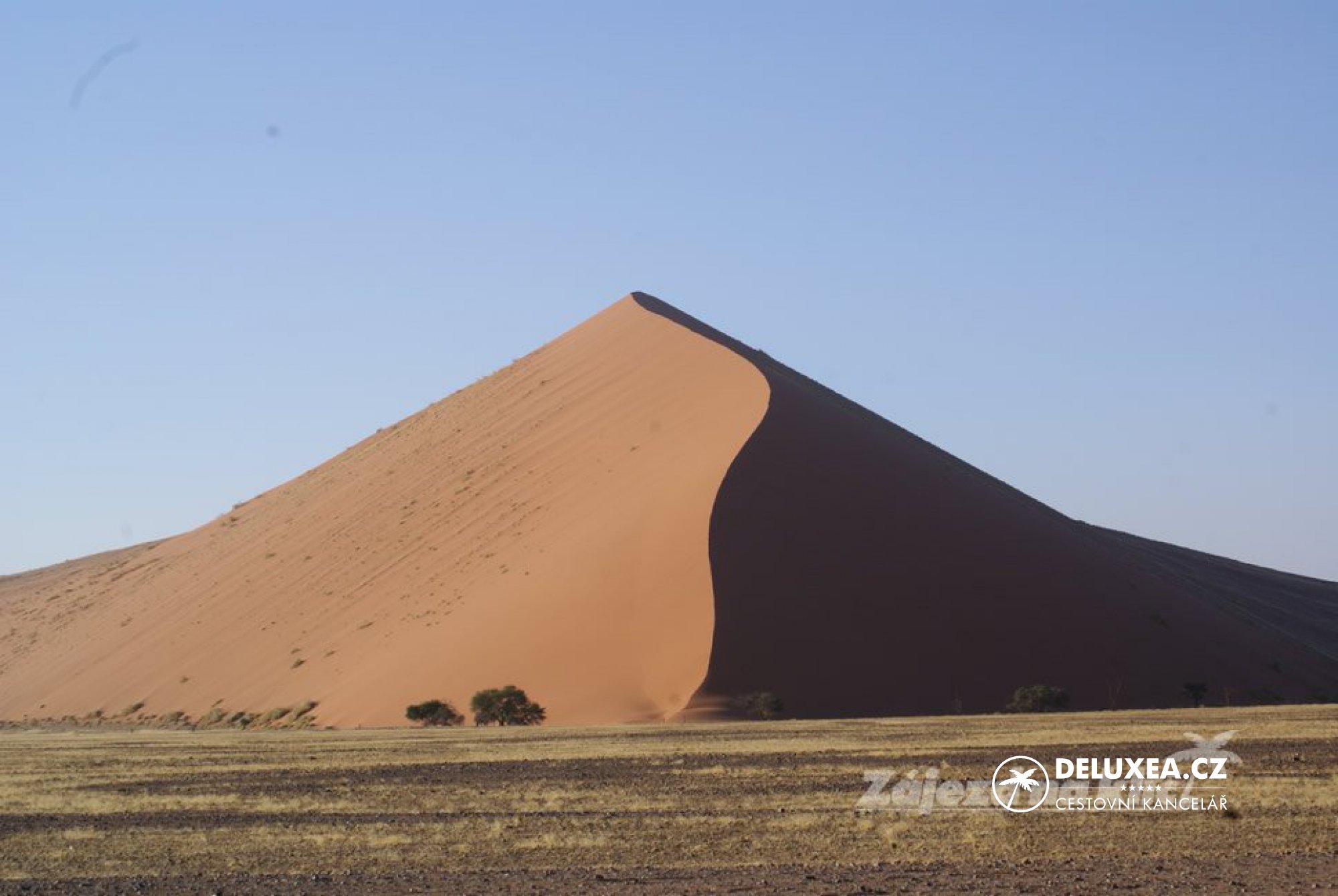 Po šedesáti kilometrech asfaltka na parkovišti končí. Do Sossusvlei je to odtud 5 km a vede tam už jen písečná cesta, na níž mohou jen auta s náhonem na všechna čtyři kola. Ostatní musí zaparkovat a nechat se do cíle odvézt shuttlem, který tu jezdí. Před Sossusvlei se nachází Deadvlei. Toto místo, k němuž od hlavní silnice vede asi kilometr dlouhá stezka, je jedním z nejznámějších míst v Namibii a zároveň jedním z nejfotogeničtějších míst, která jsem kdy navštívil. Kdysi tady bylo malé jezero, a tak tu díky dostatku vody vyrostly mohutné stromy. Jezero časem vyschlo, stromy, jejichž stáří se odhaduje na 900 let, ale zůstaly, protože ale neměly dostatek vláhy, uschly. Jezero je obkrouženo ohromnými dunami. Je to skvělé místo pro ty, kdo rádi fotí: modrá barva oblohy, červená barva dun a šedá barva kmenů spolu opravdu výtečně kontrastují a fotky vypadají opravdu nádherně. Z Deadvlei jsme popojeli do Sossusvlei. Tady se opět dá vylézt na dunu, nebo si tu můžete tak jako my dát ve stínu akácií piknik, a vydat se zpět. Po návratu do hotelu můžete odpočívat u bazénu nebo zvolit aktivní druh relaxace – my jsme se byli projet na čtyřkolkách.