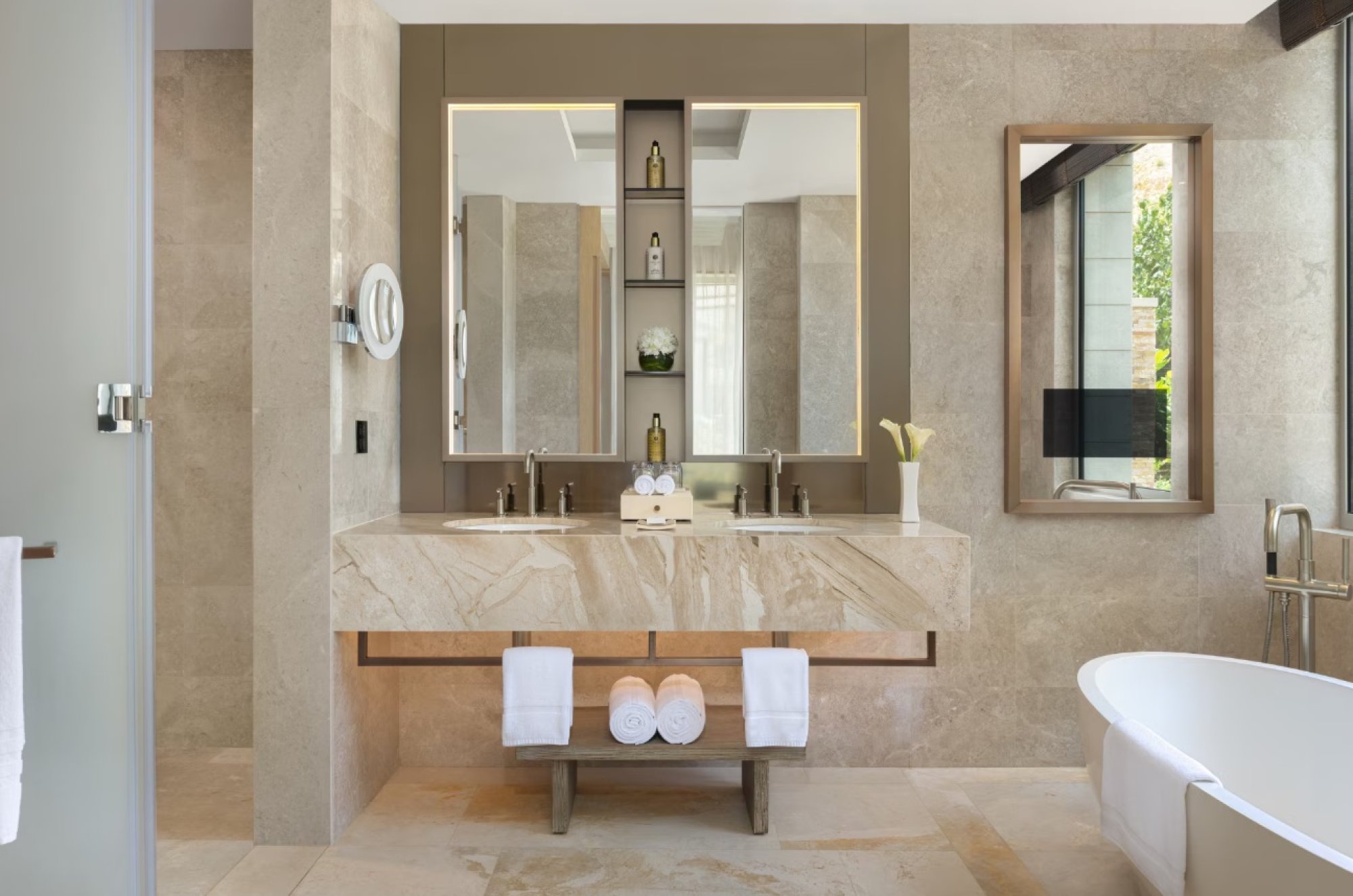 Rozlehlá rezidence se čtyřmi ložnicemi nabízí částečný výhled na moře a velkou terasu se soukromým bazénem. V přízemí se nachází ložnice s postelí velikosti king, prostorná mramorová koupelna s vanou a sprchou s dešťovou hlavicí. Součástí rezidence je také šatna. Dále je zde samostatný obývací pokoj, kuchyňský kout a jídelní část. Druhá ložnice v přízemí je vybavena dvěma oddělenými postelemi a má vlastní koupelnu. V horním patře se nachází další dvě ložnice – jedna s postelí king a druhá se dvěma oddělenými postelemi, obě s vlastní koupelnou. Nechybí ani další obývací pokoj a jídelní prostor. Obě patra jsou propojena venkovním schodištěm. Součástí vybavení jsou moderní technologie, přístup do prémiového Executive Lounge, bezplatný jednosměrný transfer z letiště a služba komorníka zdarma. Kapacita: 8 dospělých a 4 děti do 12 let, nebo až 12 dospělých.