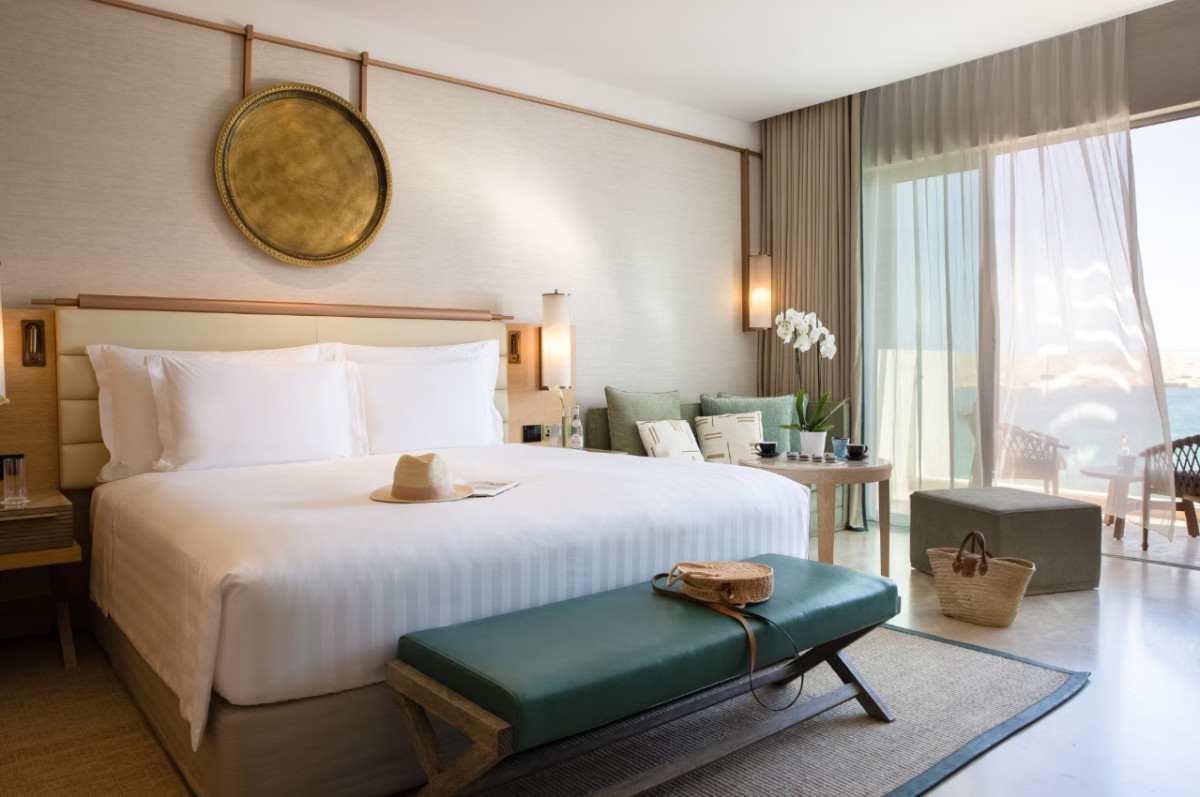 Užijte si prostorné ubytování s manželskou postelí king nebo dvěma oddělenými lůžky twin. Každý pokoj nabízí dvě elegantní mramorové koupelny s vanou, dešťovou sprchou a toaletními stolky. Nechybí komfortní obývací část s rozkládací pohovkou, moderní technologické vybavení, soukromý balkon s výhledem na moře a možnost propojení s dalším pokojem. Kapacita: 4 dospělí a 2 děti do 12 let, nebo max. 6 dospělých osob.