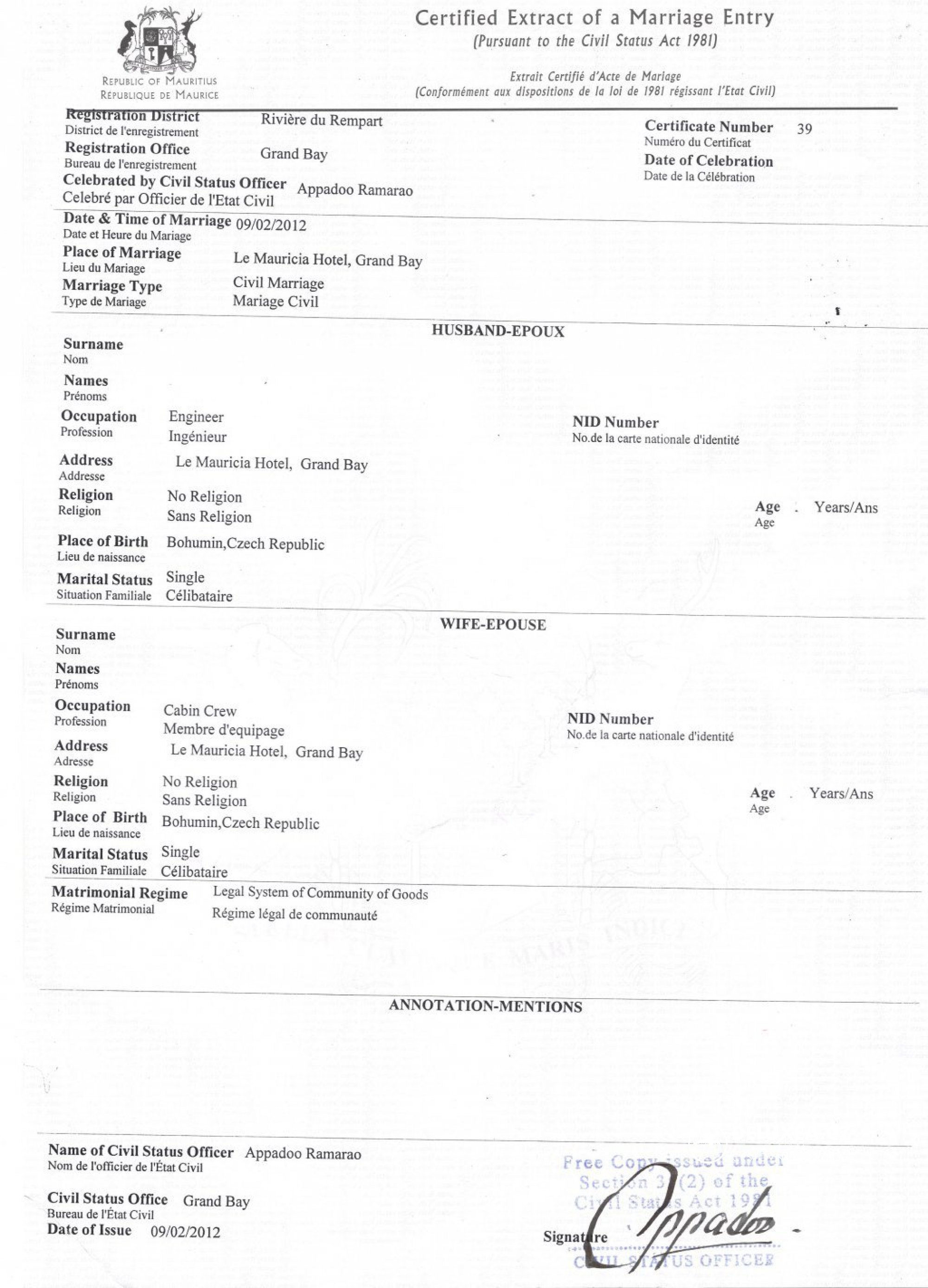 Vdova nebo rozvedená žena není oprávněna se znovu vdát za méně než 300 dní od smrti manžela nebo dne právní platnosti rozsudku o rozvodu. Svatba bude povolena pouze v případě, že žena podstoupí na Mauritiu lékařskou prohlídku dokladující, že není těhotná. Pokud bude test pozitivní, sňatek nebude za žádných okolností povolen. Tato podmínka platí pouze na Mauritiu. Ženy, které mají déle jak 300 dnů od rozvodu, samozřejmě žádnou lékařskou prohlídku neabsolvují. Pořádali jsme svatbu, kde počet dnů byl 302 a vše bylo bez problémů.