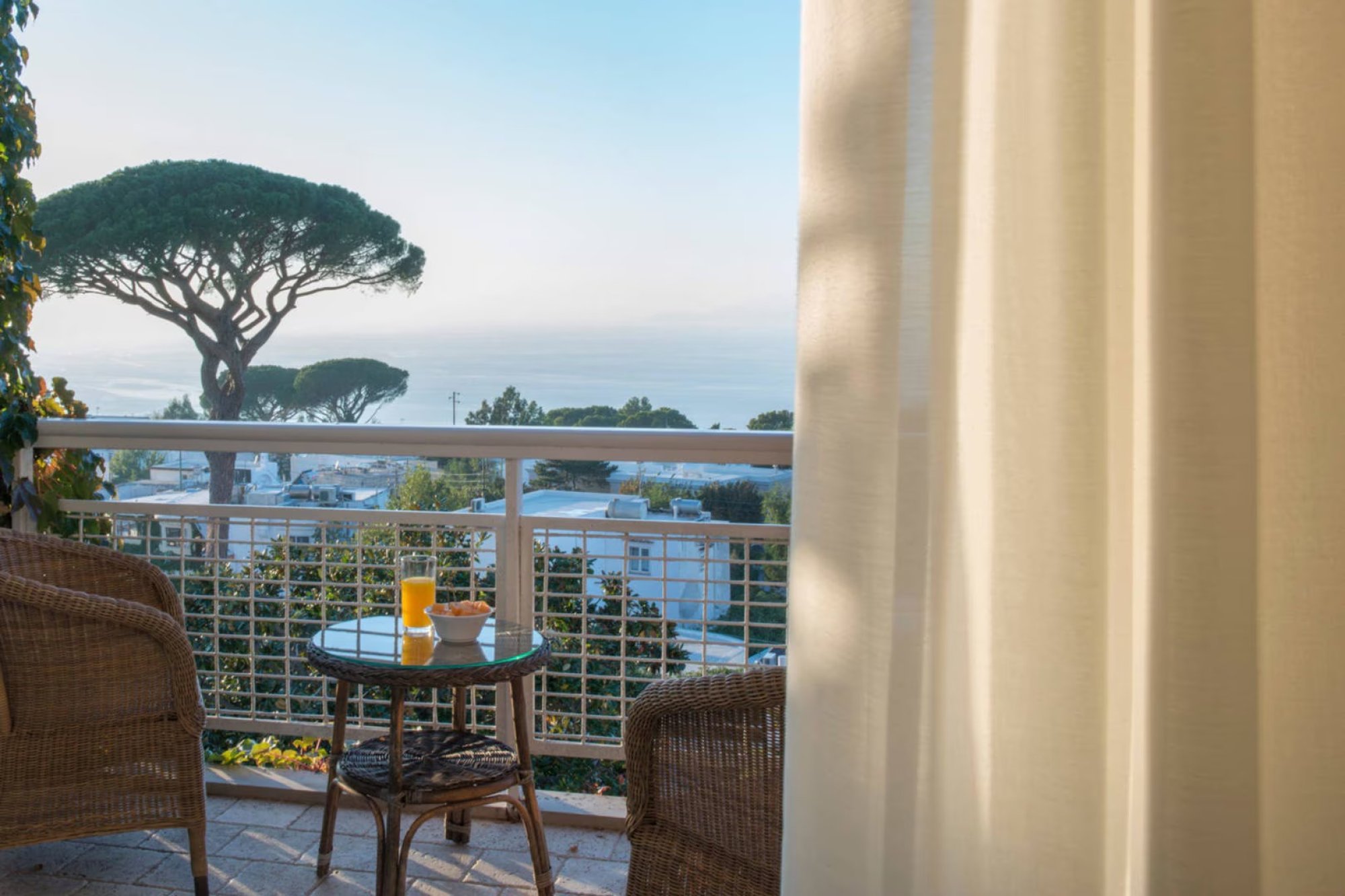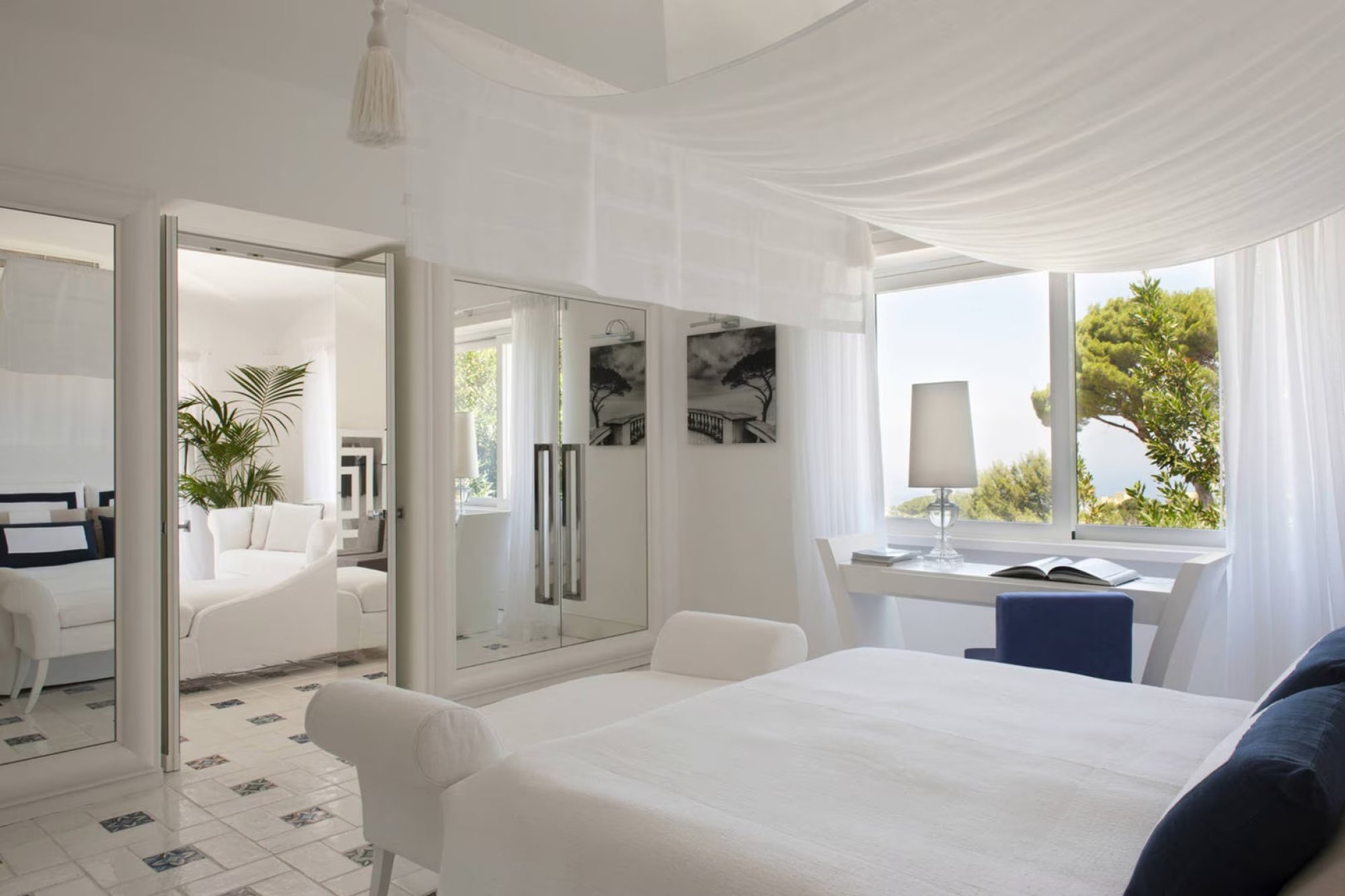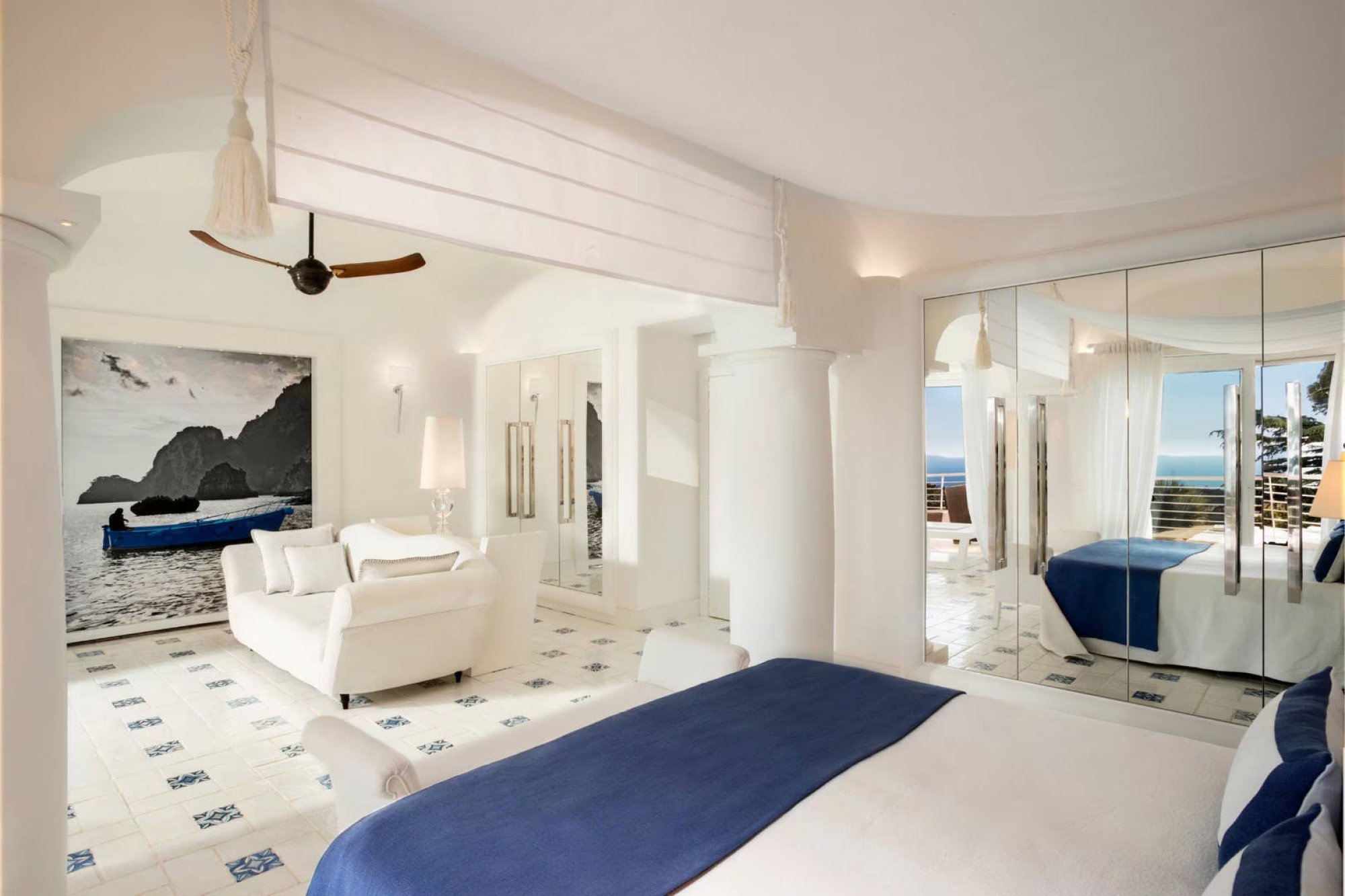 Ubytujte se v tomto nádherném apartmá (50 m²), které nabízí nerušený výhled na Neapolský záliv. Stylový interiér zařízený v modrých a bílých tónech zdobí luxusní látky z dílny Loro Piana a ručně vyráběné keramické dlaždičky, které zachycují kouzlo ostrova Capri. Součástí apartmá je manželská postel (nebo dvě lůžka na vyžádání), krásná koupelna, HD TV s mezinárodními i lokálními programy, sejf, fén na vlasy Dyson, pracovní stůl, minibar a láhev šumivého vína s kanapkami na uvítanou při příjezdu. Hosté mají navíc k dispozici tyto výhody – přístup do lázní Capri Medical Spa (od 16 let), sklenka aperitivu v Bar degli Artisti, jedna čtyřchodová večeře pro dva v michelinské restauraci L'Olivo (bez nápojů), jedna 25minutová švédská nebo aroma relaxační masáž pro dva za pobyt (při pobytu min. na 2 noci) a kyvadlová doprava k restauraci Il Riccio Restaurant & Beach Club a a-Ma-Re Capri (podle dostupnosti). Maximální kapacita: 3 dospělí.