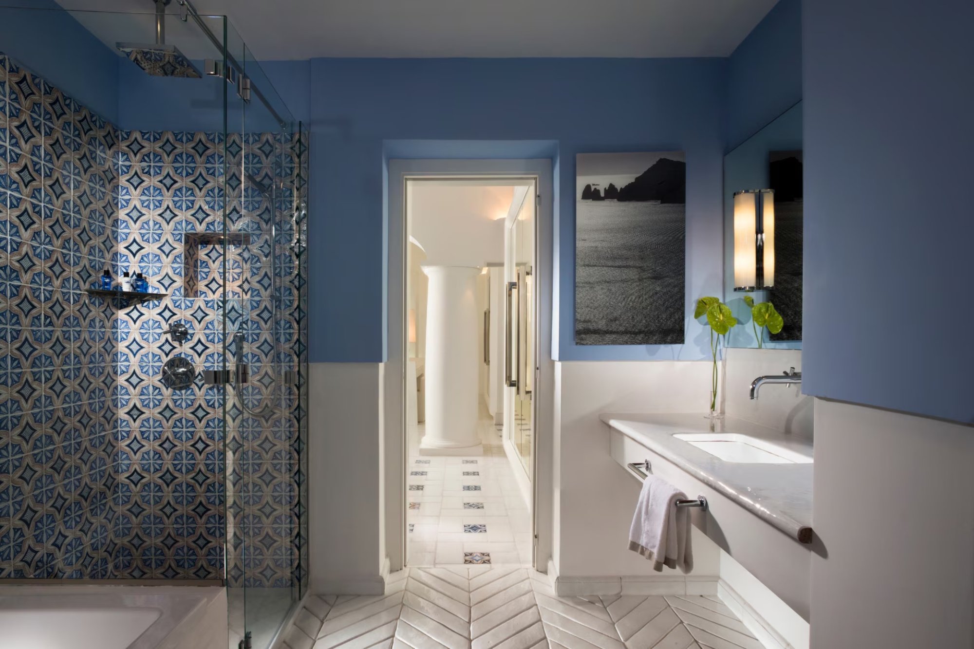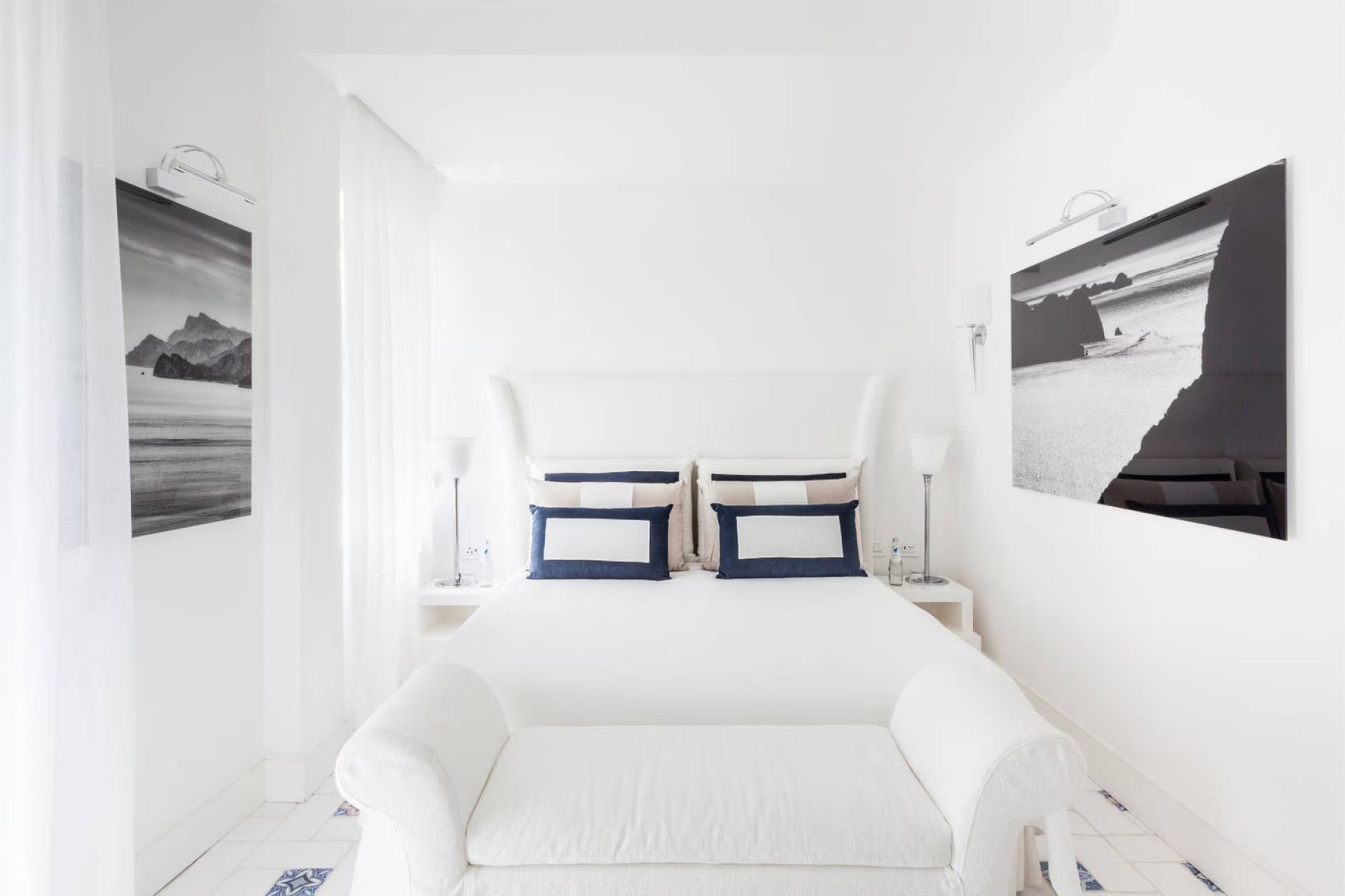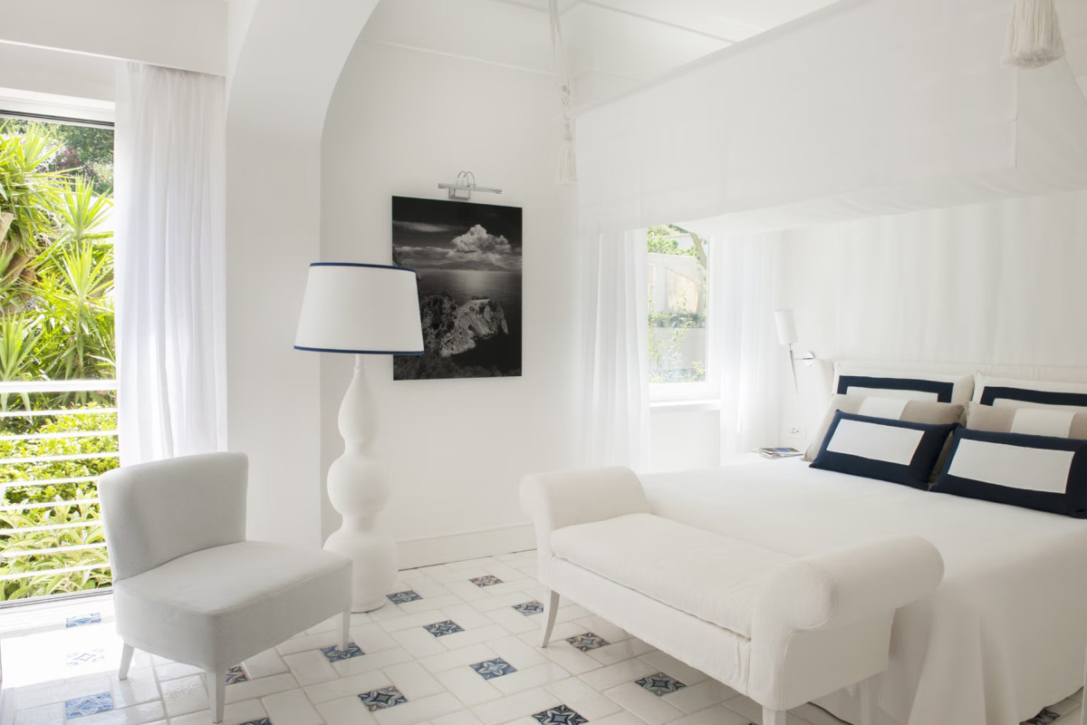 Ubytujte se v tomto nádherném apartmá (50 m²), které nabízí nerušený výhled na Neapolský záliv. Stylový interiér zařízený v modrých a bílých tónech zdobí luxusní látky z dílny Loro Piana a ručně vyráběné keramické dlaždičky, které zachycují kouzlo ostrova Capri. Součástí apartmá je manželská postel (nebo dvě lůžka na vyžádání), krásná koupelna, HD TV s mezinárodními i lokálními programy, sejf, fén na vlasy Dyson, pracovní stůl, minibar a láhev šumivého vína s kanapkami na uvítanou při příjezdu. Hosté mají navíc k dispozici tyto výhody – přístup do lázní Capri Medical Spa (od 16 let), sklenka aperitivu v Bar degli Artisti, jedna čtyřchodová večeře pro dva v michelinské restauraci L'Olivo (bez nápojů), jedna 25minutová švédská nebo aroma relaxační masáž pro dva za pobyt (při pobytu min. na 2 noci) a kyvadlová doprava k restauraci Il Riccio Restaurant & Beach Club a a-Ma-Re Capri (podle dostupnosti). Maximální kapacita: 3 dospělí.