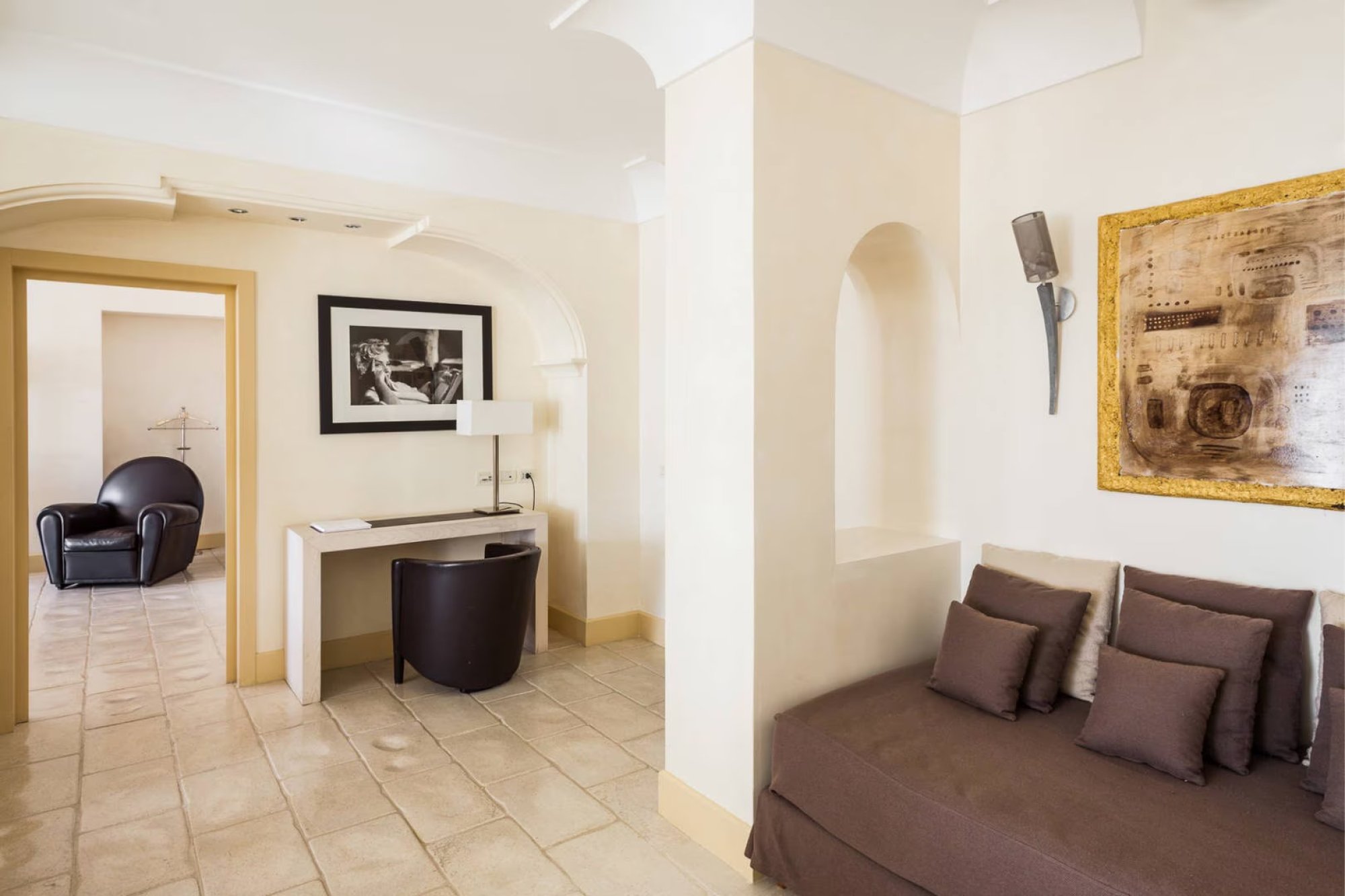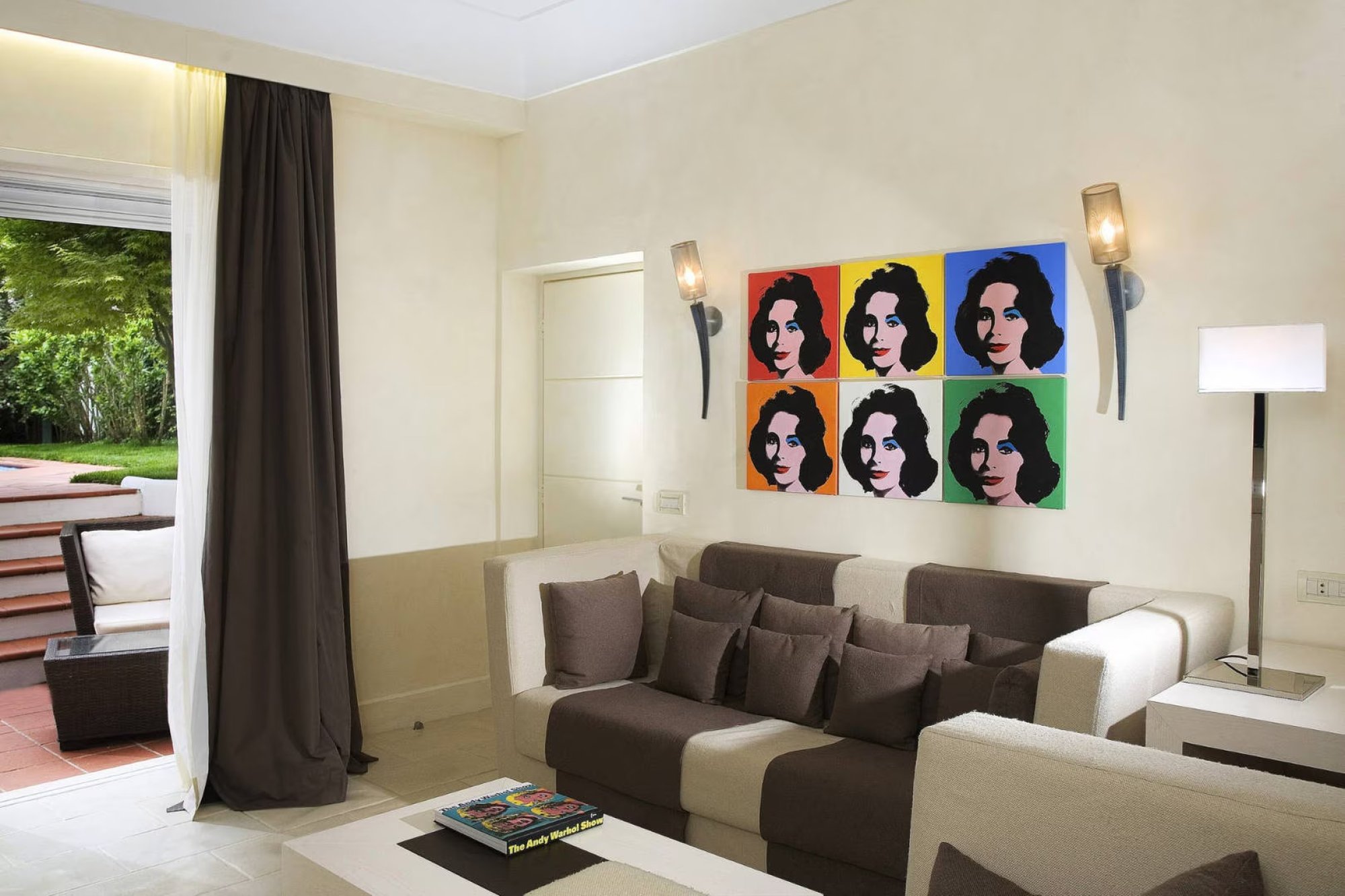 Pro milovníky umění je k dispozici toto originální apartmá, jehož stěny zdobí umělecká díla a ze soukromého balkónu se nabízí úchvatný výhled na Neapolský záliv. Osobitý interiér je inspirovaný designem a barevnou paletou mistrů devatenáctého století, jako byl Kandinsky, Mondrian a Miró. Rozlehlé obytné prostory (50 m²), včetně samostatného obývacího pokoje s kamennou podlahou, poskytují dokonalé pohodlí. Uvnitř najdete manželskou postel (nebo dvě lůžka na vyžádání), krásnou mramorovou koupelnu, HD TV s mezinárodními i lokálními programy, sejf, fén na vlasy Dyson, pracovní stůl, láhev šumivého vína s kanapkami na uvítanou při příjezdu a minibar s nabídkou nealkoholických nápojů, občerstvení a čaje. Hosté mohou navíc využívat tyto výhody – přístup do lázní Capri Medical Spa (od 16 let), sklenka aperitivu v Bar degli Artisti, jedna čtyřchodová večeře pro dva v michelinské restauraci L'Olivo (bez nápojů), jedna 25minutová švédská nebo aroma relaxační masáž pro dva za pobyt (při pobytu min. na 2 noci) a kyvadlová doprava k restauraci Il Riccio Restaurant & Beach Club a a-Ma-Re Capri (podle dostupnosti). K dispozici je také možnost propojení dvou apartmá. Maximální kapacita: 3 dospělí.