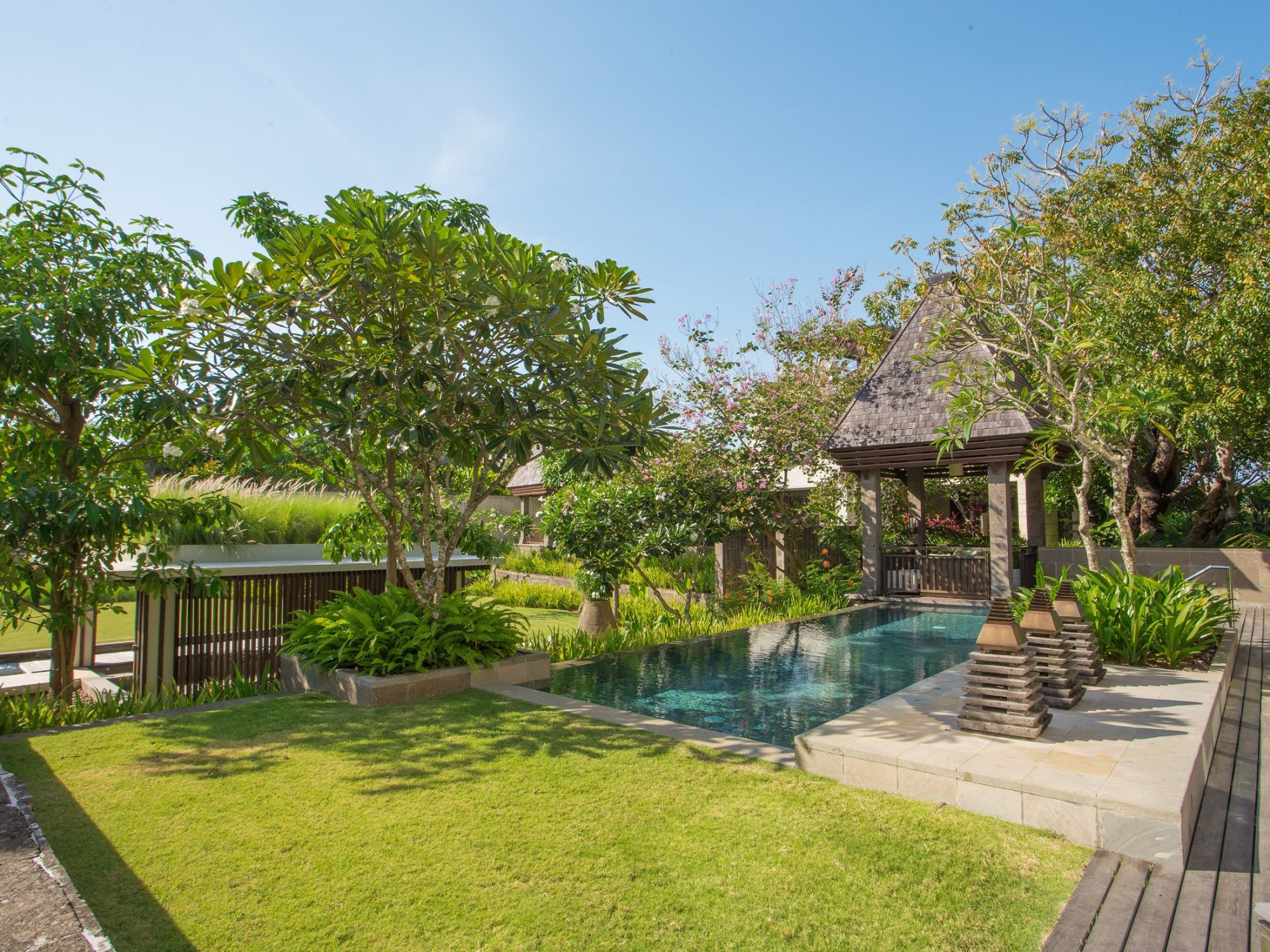 Dopřejte si ještě více prostoru a pohodlí v podobě této moderní balijské vily (360 m2) s rozlehlou zahradou a soukromým bazénem. Uvnitř najdete ložnici s manželskou postelí (možnost přidání přistýlky), samostatný obývací pokoj, jídelnu a luxusní koupelnu vybavenou sprchovým koutem i velkou vanou. Součástí vily je také venkovní terasa jako stvořená k nerušené relaxaci. Kromě toho můžete využít služby komorníka. Maximální kapacita: 3 osoby.
