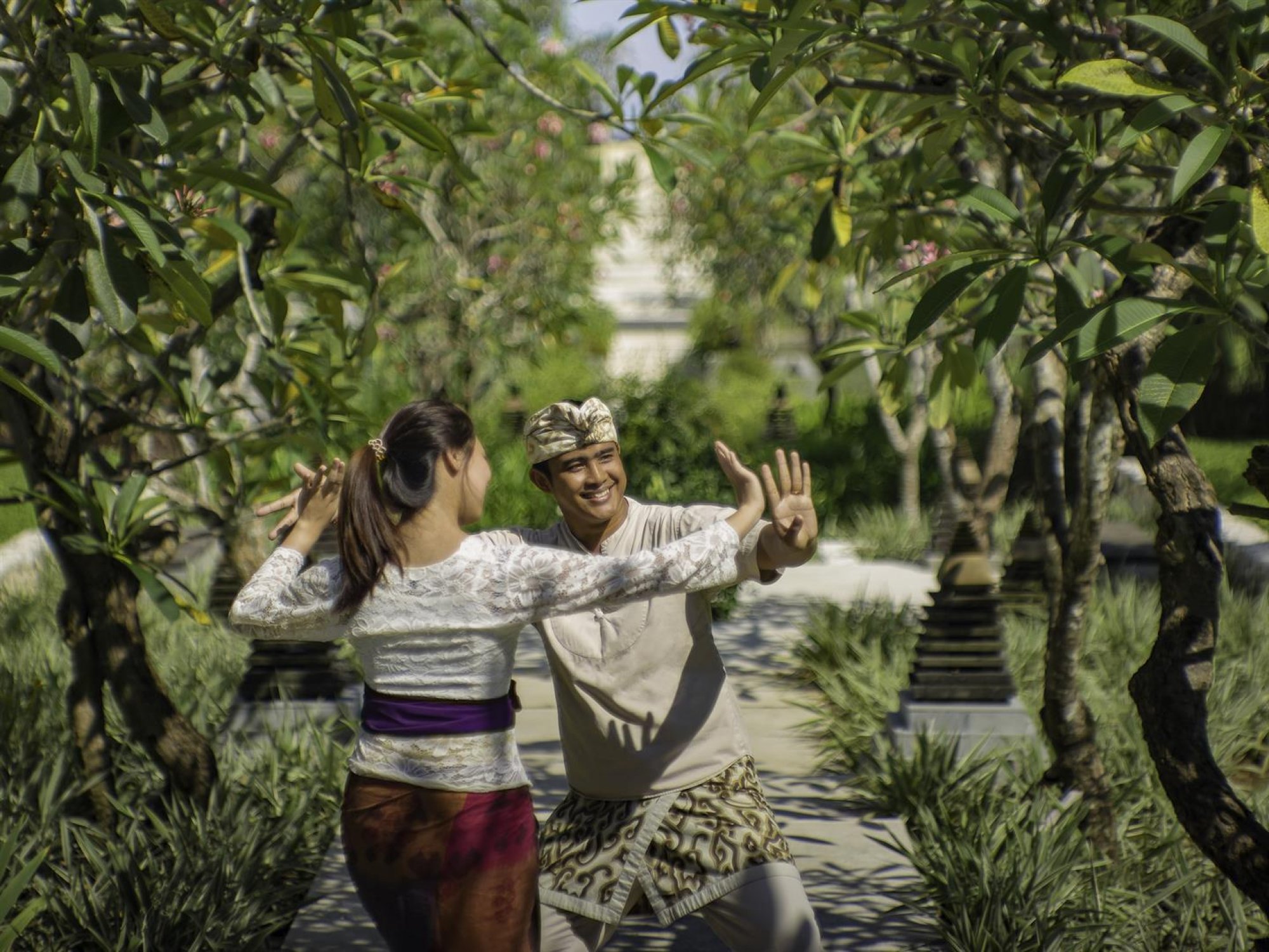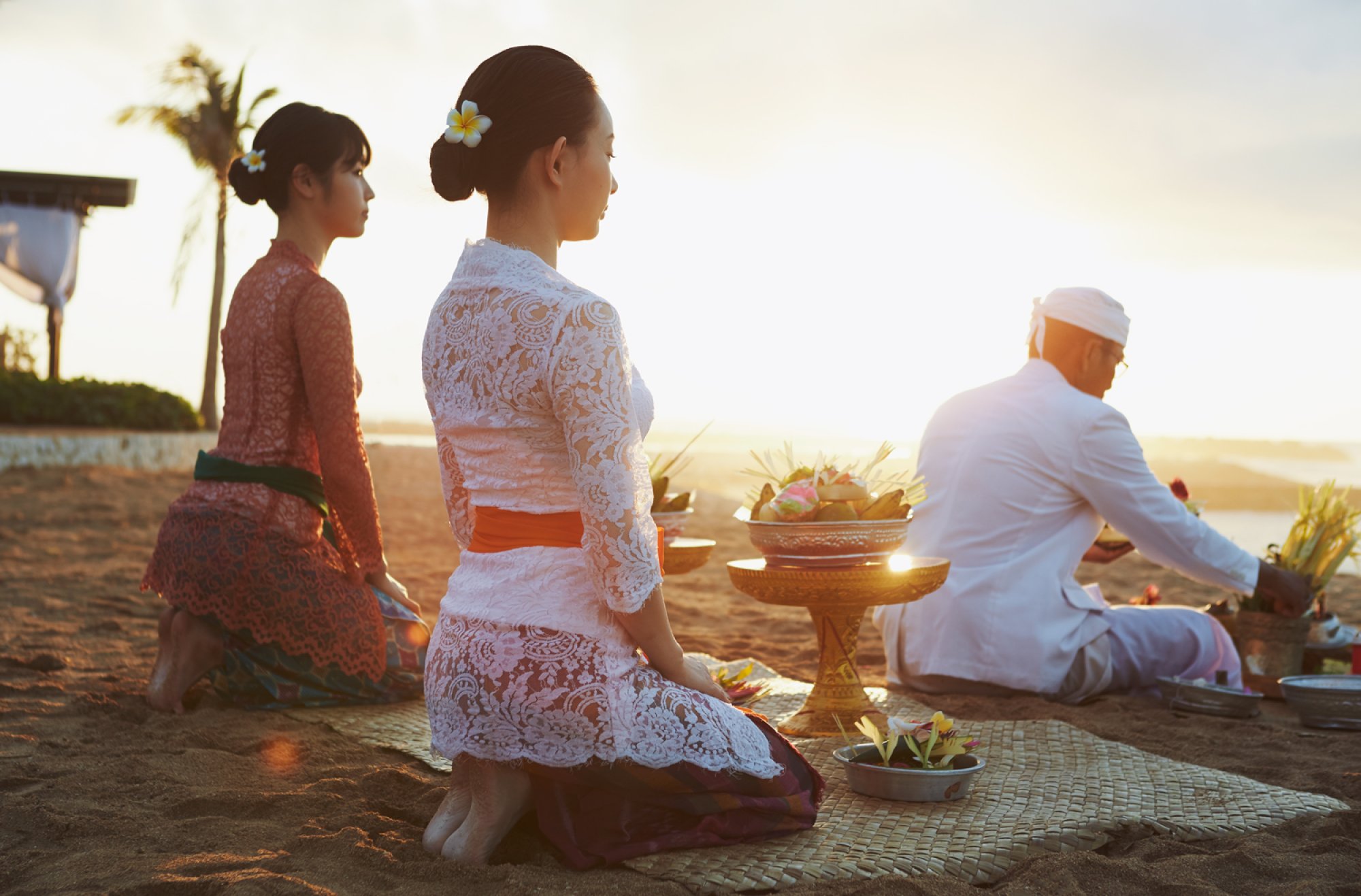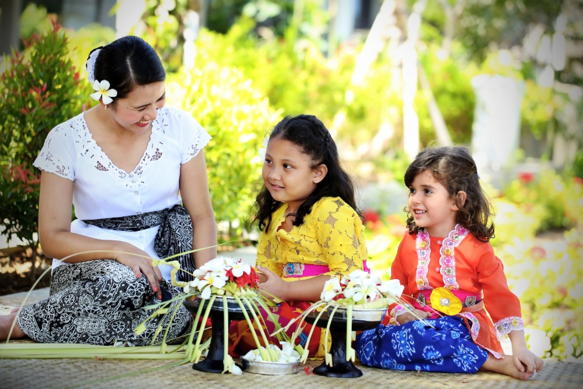 - rituál Canang Sari: oblékání tradičního balijského sarongu, výroba obětiny z mladých kokosových listů a barevných květů, umístění obětin do chrámu v resortu nebo v místní
