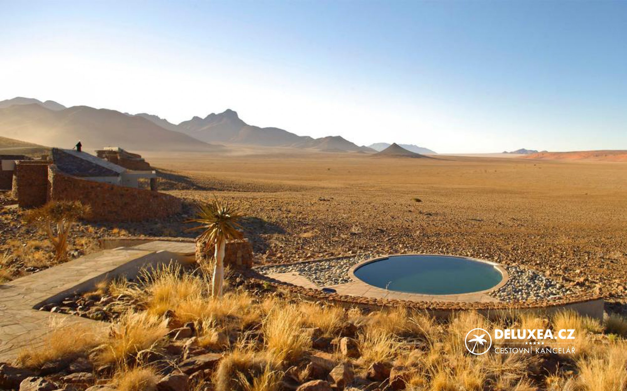 „Sofistikovaná safari lodge situována oproti horám dohlížejícím na Namibijskou poušť“