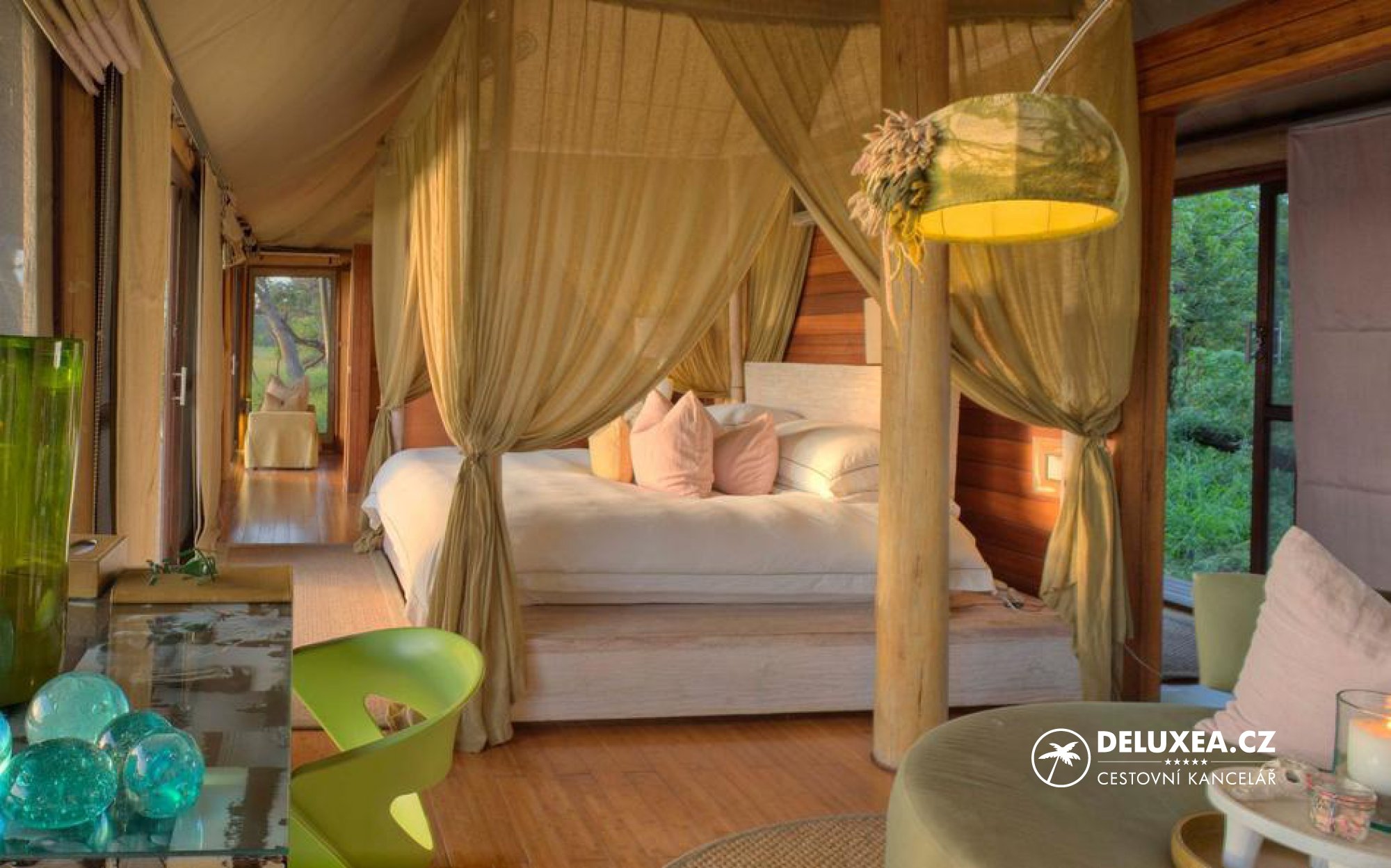 „Elegantní stanový kemp umístěný v rámci exkluzivních 25 000 hektarů divočiny s úchvatnými výhledy na deltu řeky.“