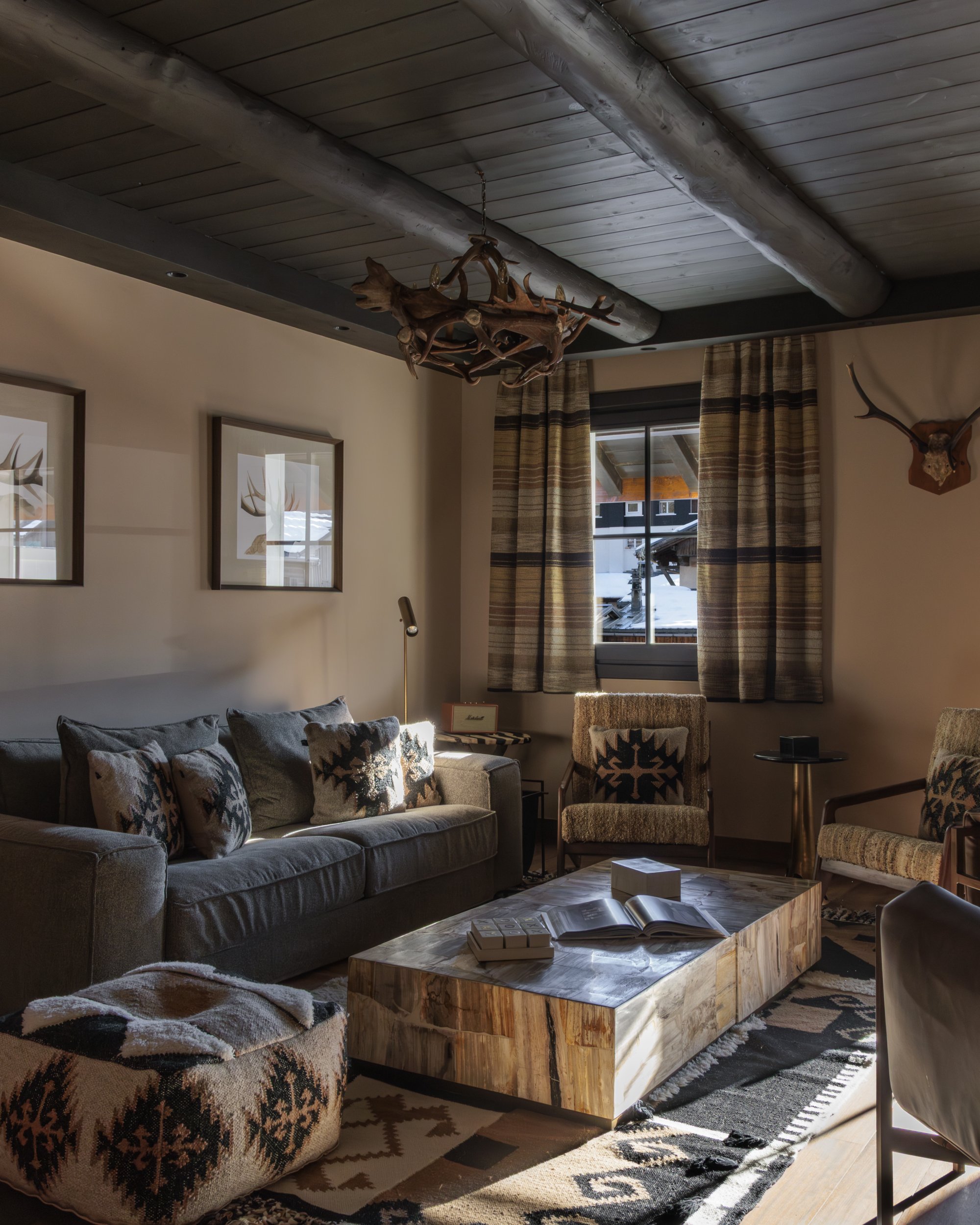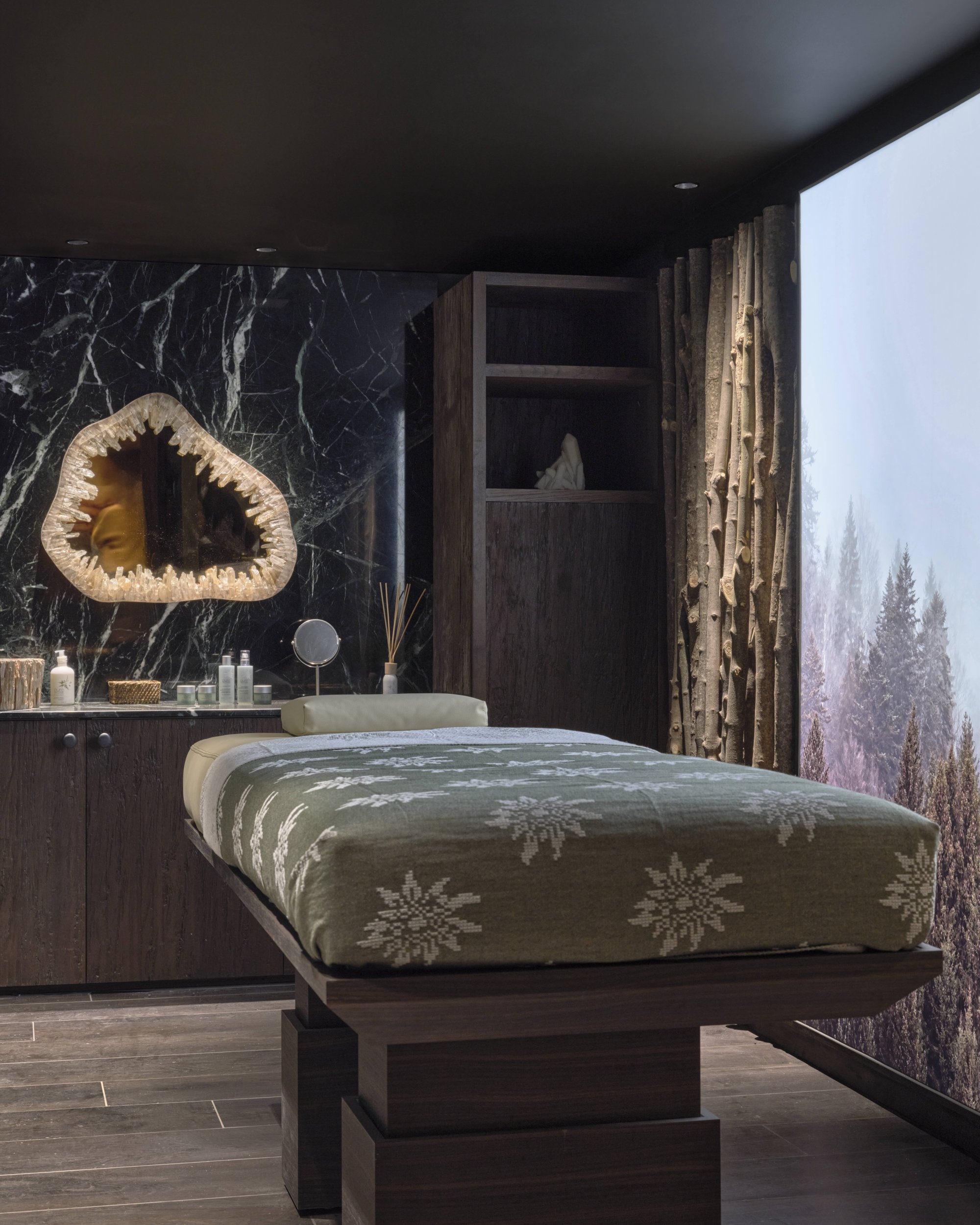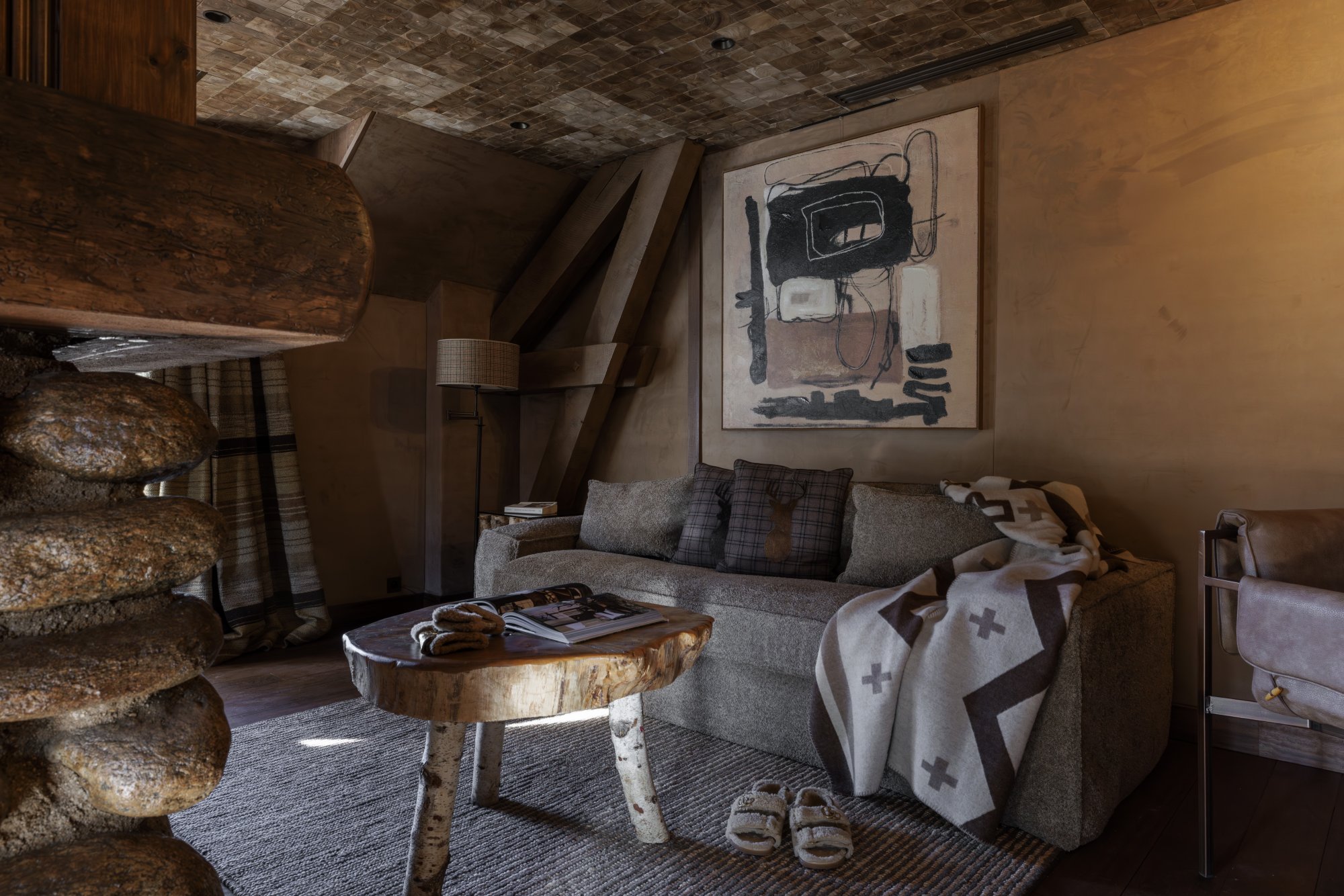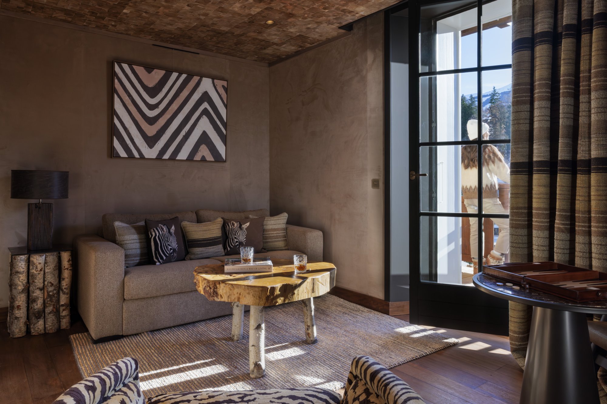 Vnitřní prostory jsou luxusně zařízené, avšak stále se nesou v duchu tradičního horského stylu. Dominují jim především dřevěné prvky, které doplňují kožené akcenty, textilie s unikátními vzory a jelení parohy. Rovněž tu můžete najít povlaky od značky Ralph Lauren, koupelny obložené mramorem Brin Emperador a krby pokryté kameny z ledovců.