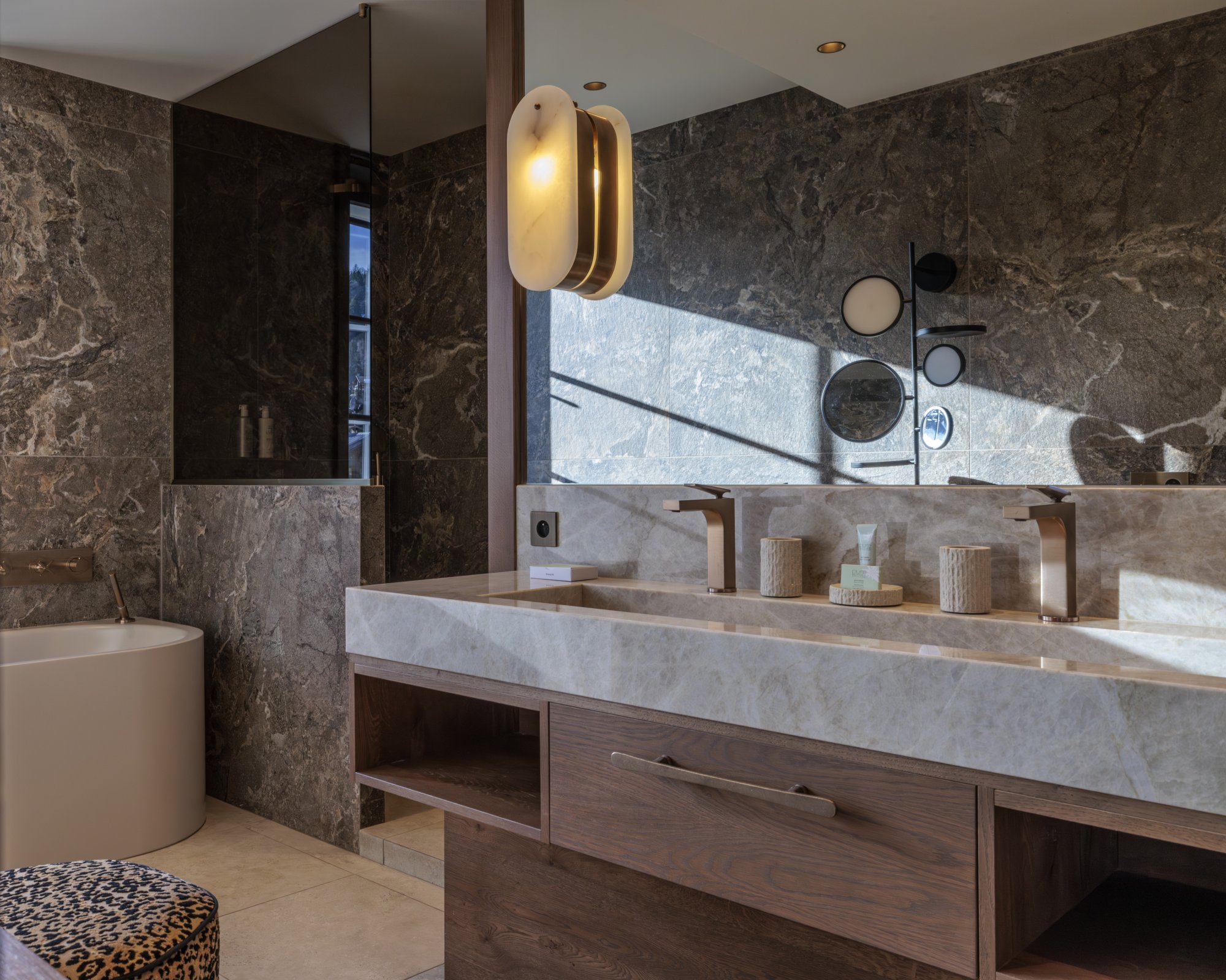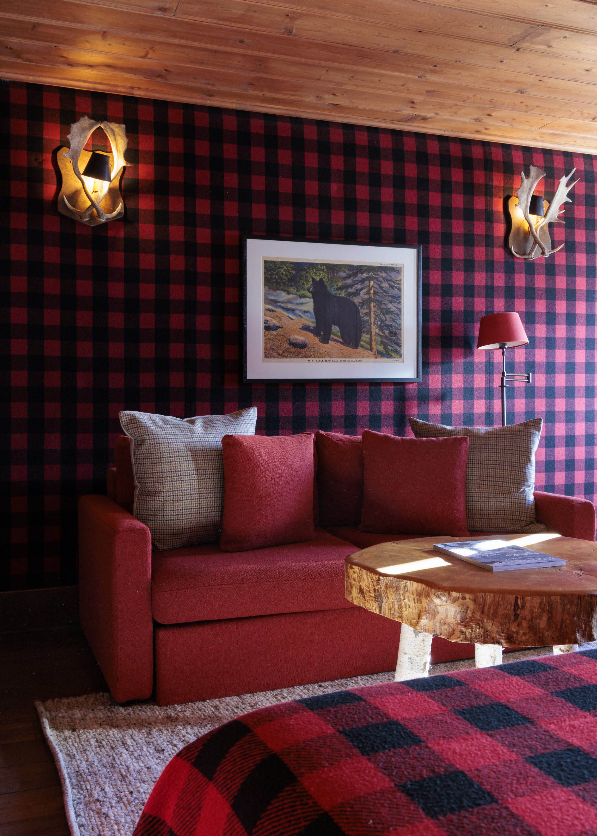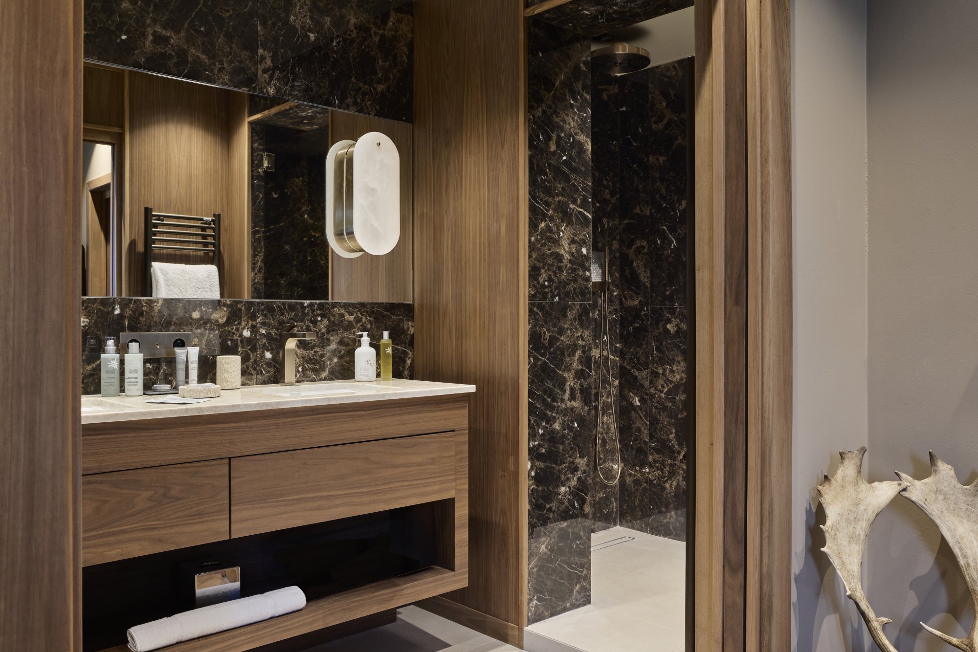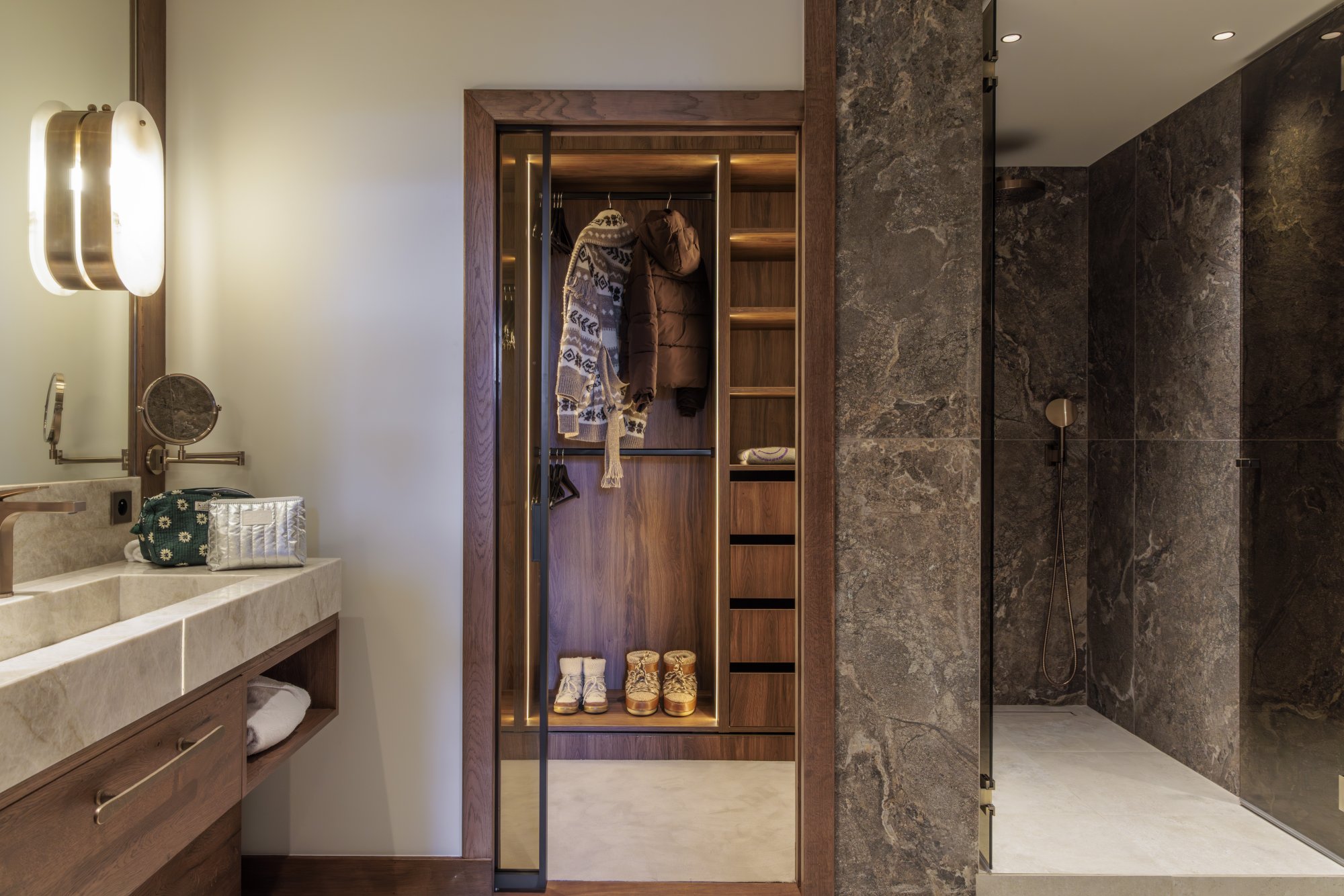 Vnitřní prostory jsou luxusně zařízené, avšak stále se nesou v duchu tradičního horského stylu. Dominují jim především dřevěné prvky, které doplňují kožené akcenty, textilie s unikátními vzory a jelení parohy. Rovněž tu můžete najít povlaky od značky Ralph Lauren, koupelny obložené mramorem Brin Emperador a krby pokryté kameny z ledovců.