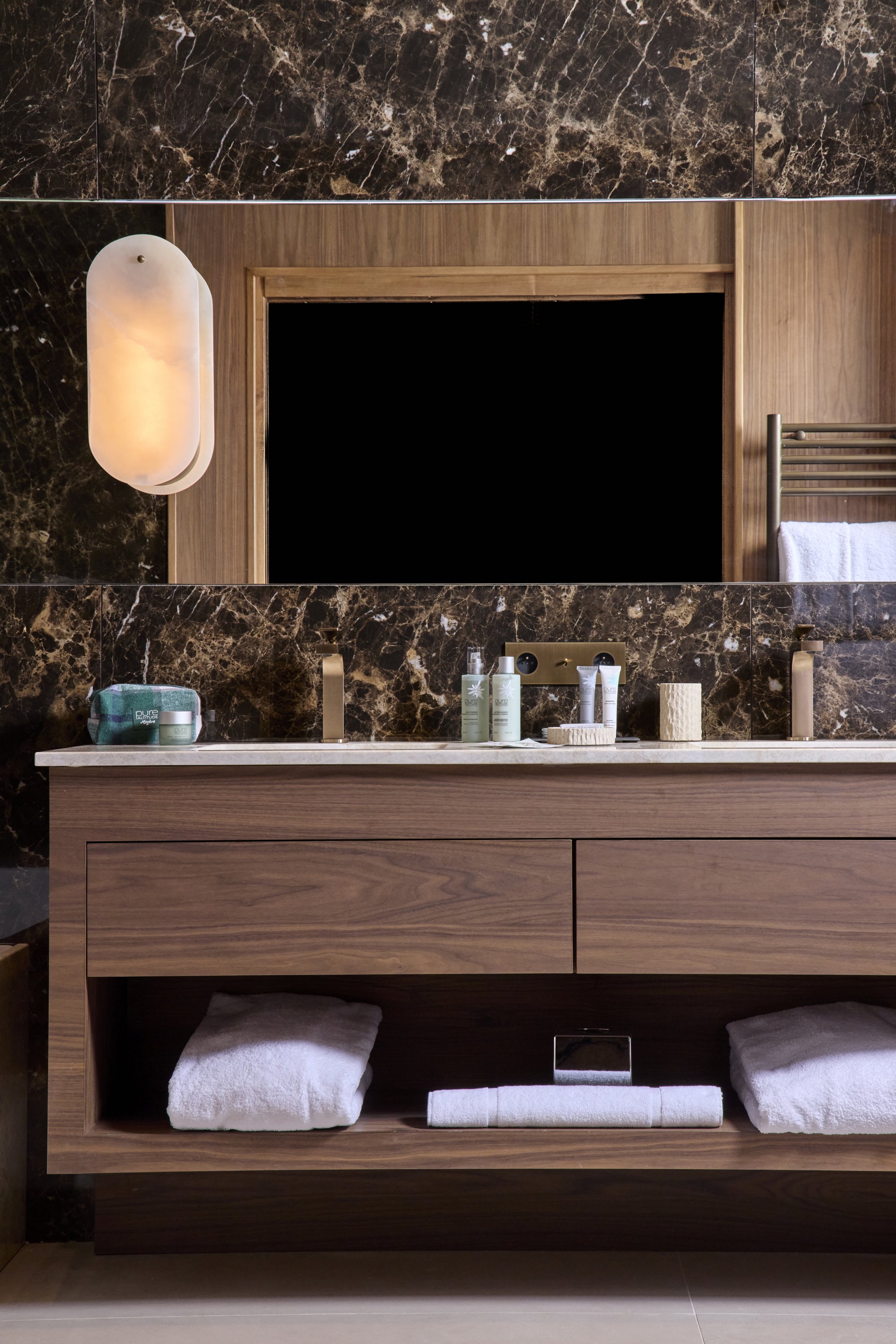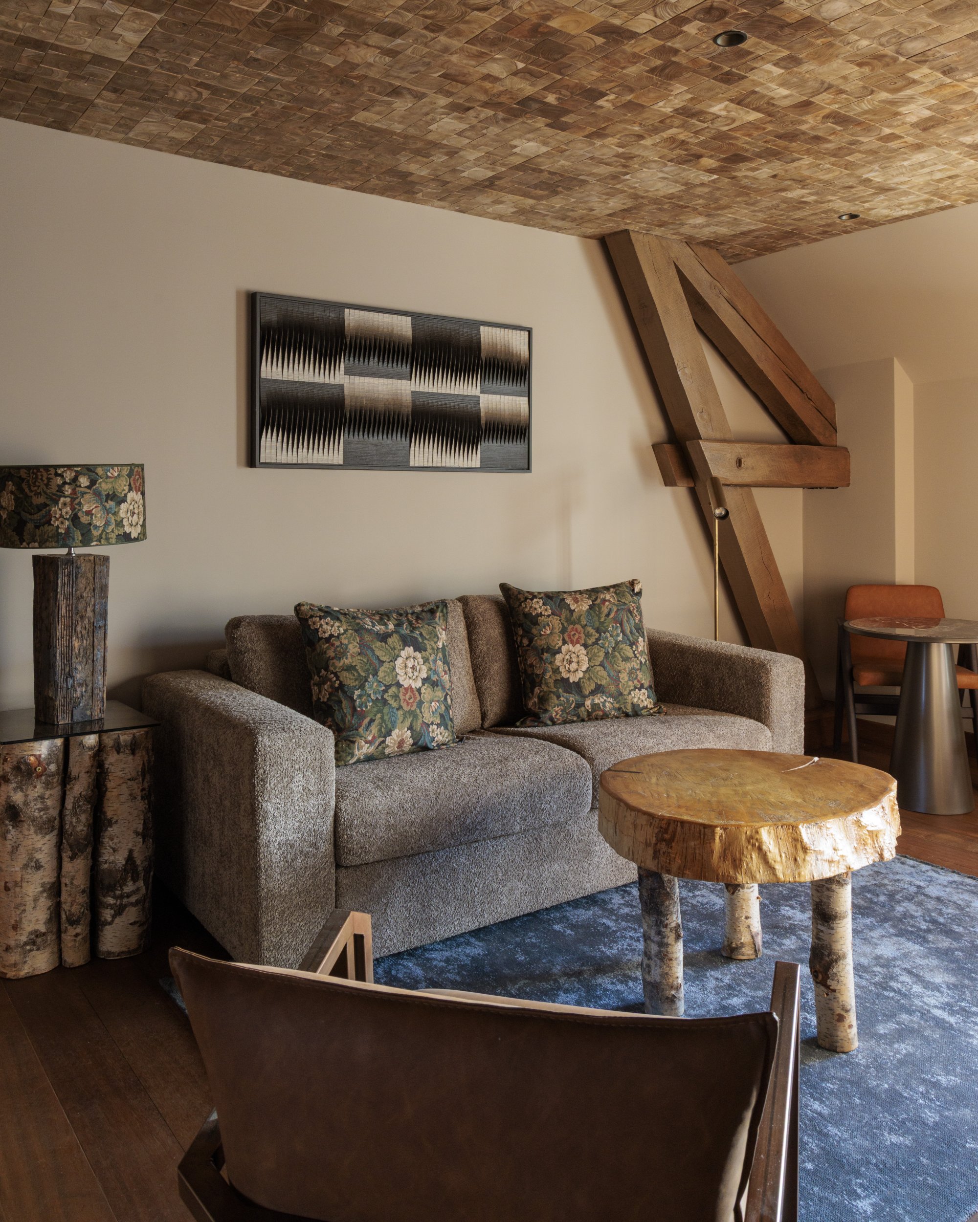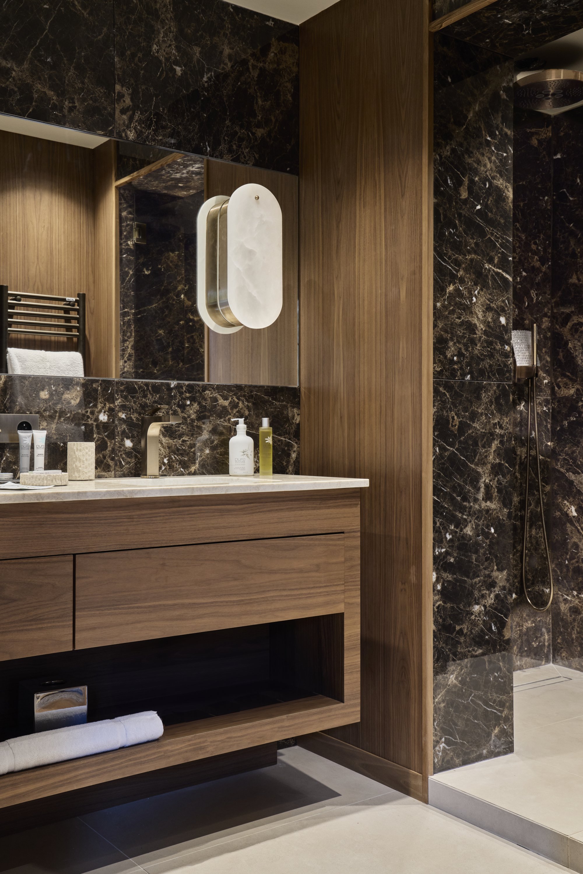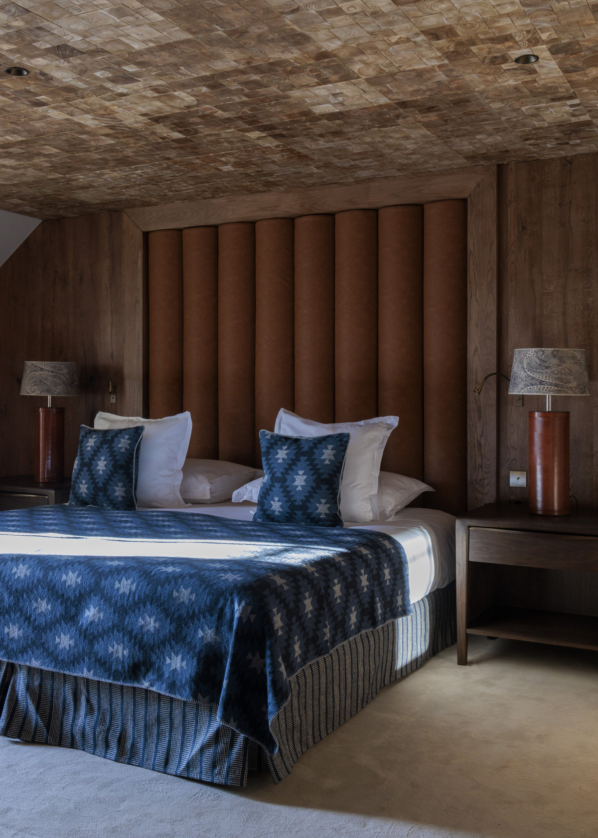 Vnitřní prostory jsou luxusně zařízené, avšak stále se nesou v duchu tradičního horského stylu. Dominují jim především dřevěné prvky, které doplňují kožené akcenty, textilie s unikátními vzory a jelení parohy. Rovněž tu můžete najít povlaky od značky Ralph Lauren, koupelny obložené mramorem Brin Emperador a krby pokryté kameny z ledovců.