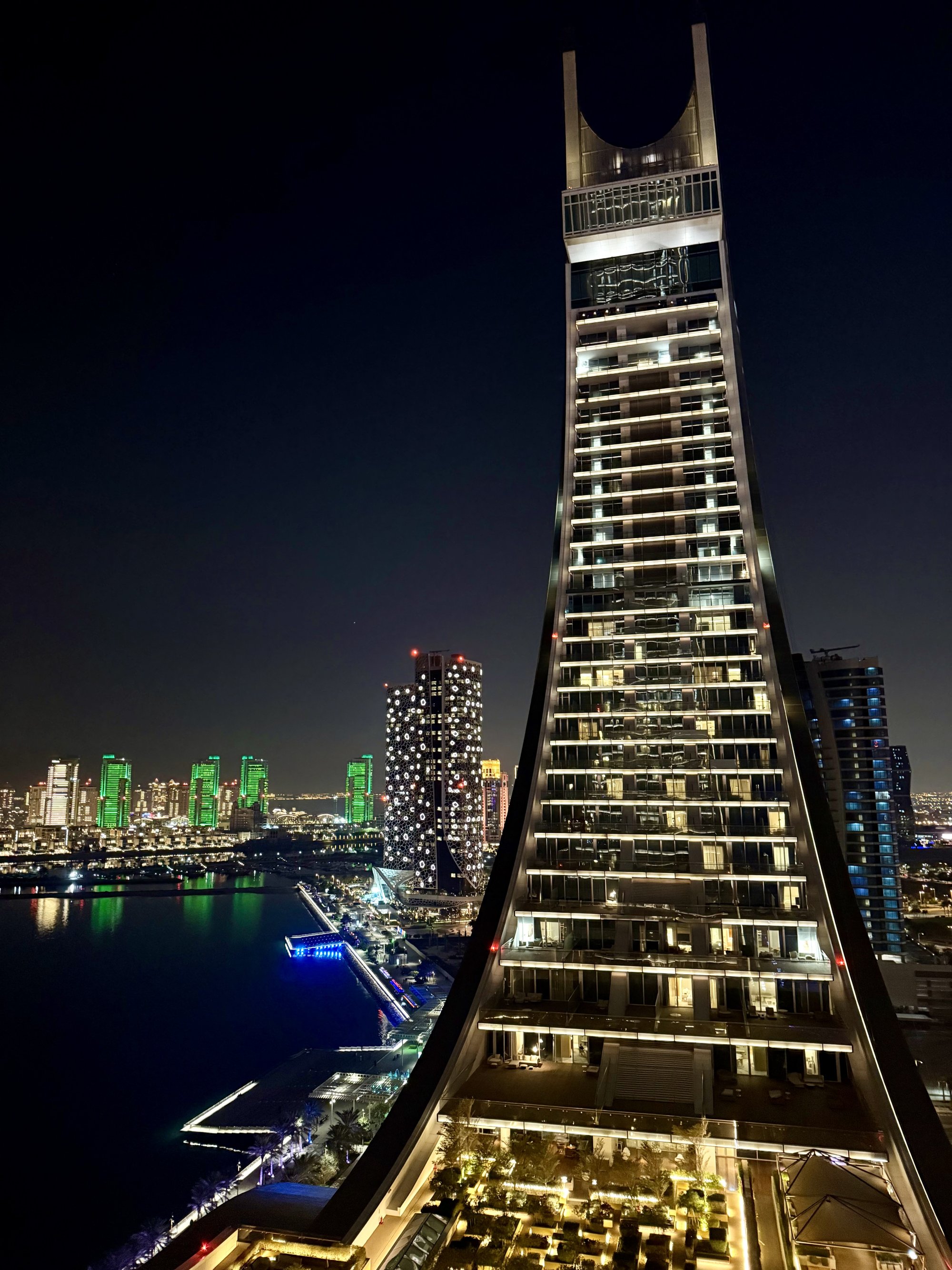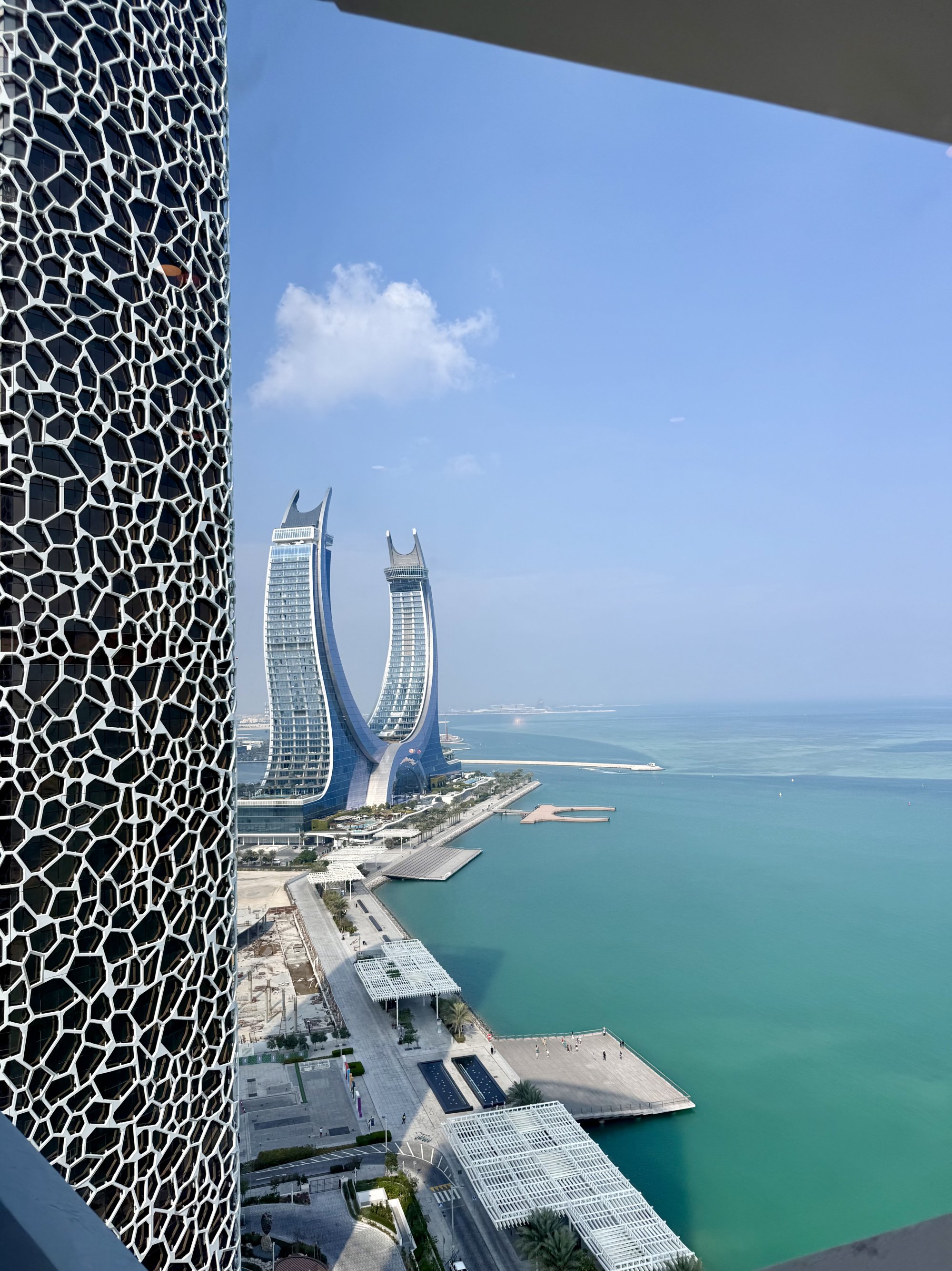 Katara Towers je naprosto unikátní stavba, která svým tvarem připomíná zkřížené meče/šavle, tedy významný symbol arabského světa. Budova je rozdělena na dvě části: jednu tvoří hotel Raffles Doha, druhou Fairmont Doha, který jsme si rovněž prohlédly v rámci hotelové vizity.