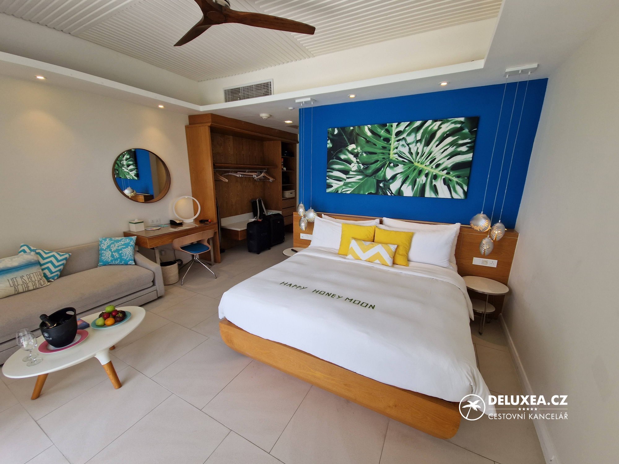 No ale ještě k pobytu samotnému. Ubytování jsme měli v základní kategorii pokojů – tedy Sky Studio v patře vilek, které mají vždy dvě Beach Studia v přízemí a dvě Sky Studia v patře. Pokoj je to pěkný, prostorný a má krásné výhledy z balkonu na západ slunce. Všechny tyto kategorie jsou umístěny na západní pláži u hotelové laguny, takže nabízejí i ideální podmínky ke koupání v moři, jelikož jsou situovány jen pár kroků od pláže. Oficiálně se do těchto pokojů vlezou až 4 dospělé osoby, ale dle mého názoru je ideální obsazenost právě 2 dospělí či případně 2 dospělí + 1 až dvě děti (na rozkládacím gauči), aby byl zachován určitý komfort dovolené. Na pokoji nám nic nechybělo – do vybavení patří vše od klimatizace či redukcí na zásuvky až po kávovar, konvici na čaj nebo minibar. Nicméně na pokoji jsme stejně příliš času netrávili a chodili se tam prakticky jen vyspat, jelikož by byla škoda netrávit čas jednom z hotelových bazénu, v moři, na barech, při šnorchlování nebo třeba na masáži či na tenisovém kurtu.