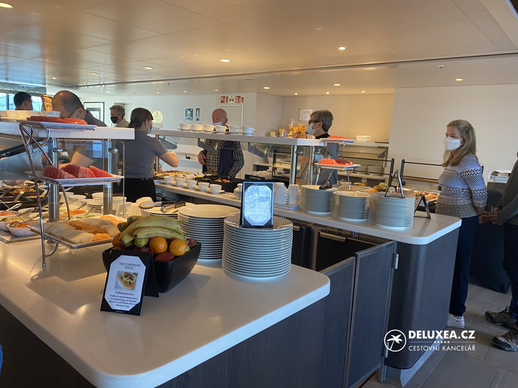 Snídaně na lodi jsou vždy formou bufetu a nabízí bohatý výběr. Z nápojů jsou k dispozici káva, čaj, 3 varianty džusů a smoothie. Dále si můžete vybrat ze slaniny, sýru, vajíček, fazolí, hash browns a toastů, nebo naopak zvolit sladkou snídani v podobě pečiva, müsli, ovesné kaše a jogurtů. Samozřejmostí je výběr ovoce, zeleniny a možnost nechat si připravit omeletu nebo míchaná vajíčka.