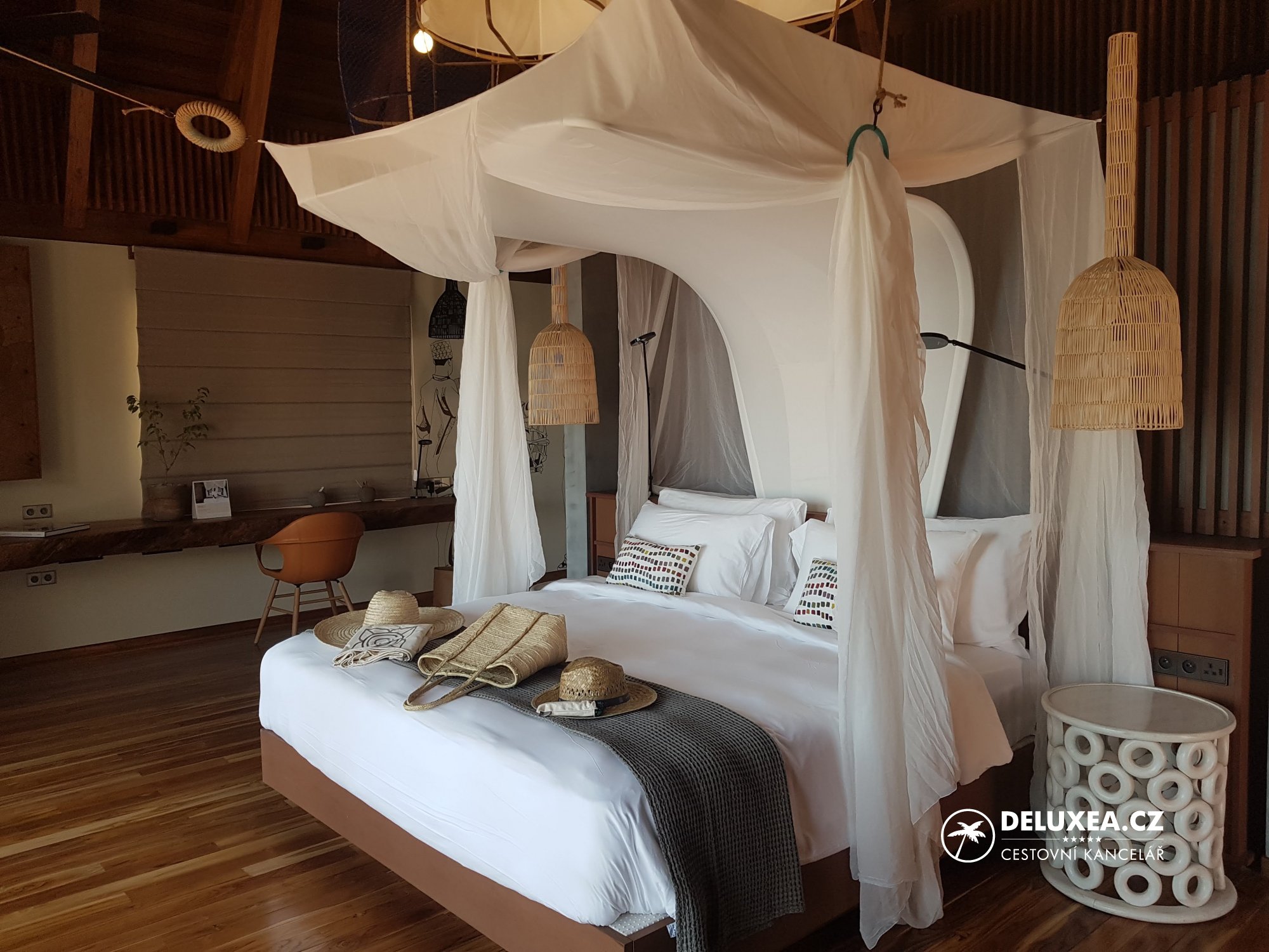 Na ubytování máte na výběr jednu ze 16 vilek umístěných v zahradě nebo u pláže. A co považujeme za naprosto unikátní, je koncept all inclusive, který zahrnuje vše. Na resortu opravdu neplatíte ani za prémiový alkohol nebo luxusní jídla jako lobster apod.