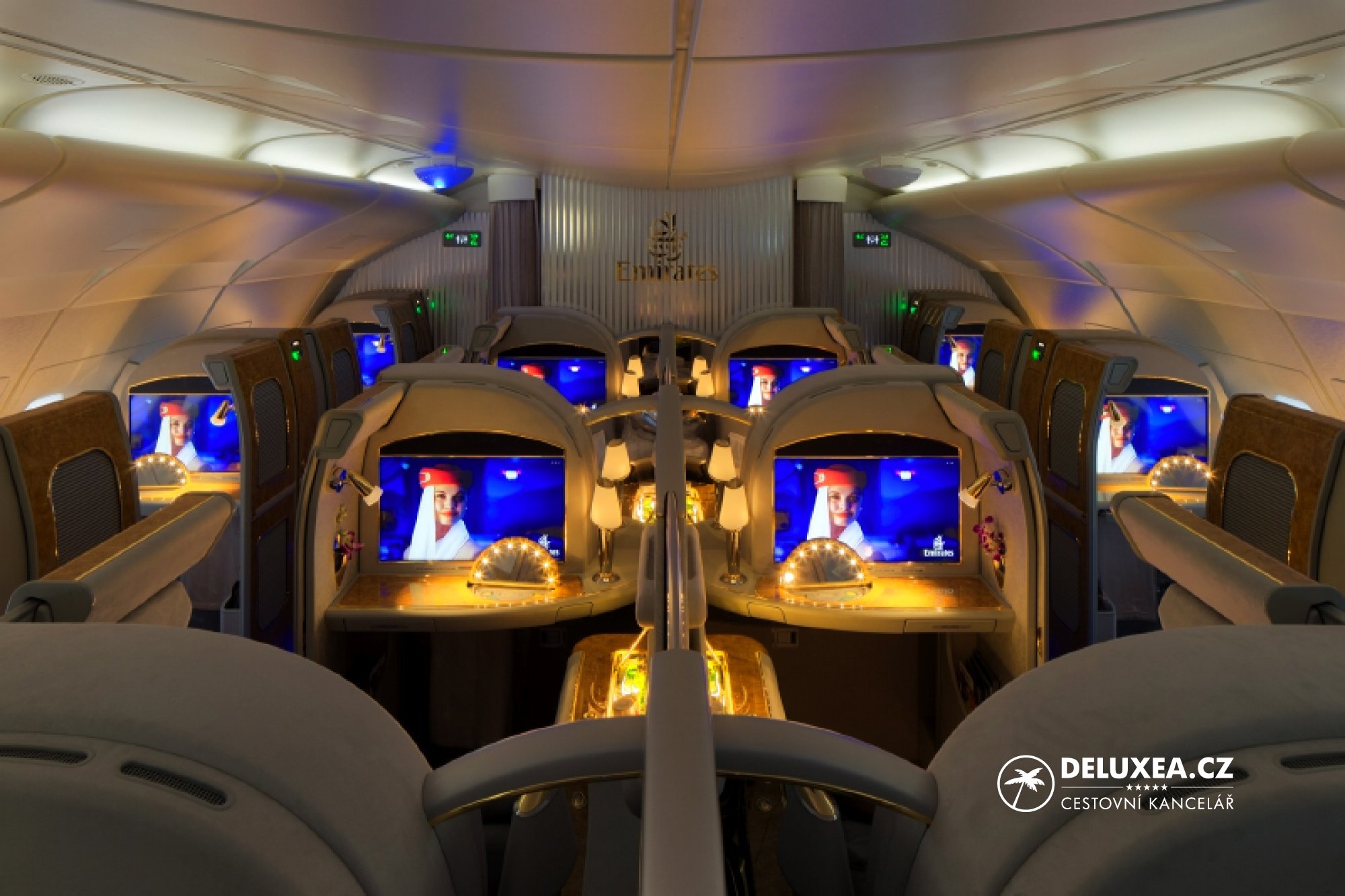 Airbus A380 se svou vysokou kapacitou a ekonomickým způsobem provozu představuje jeden z hlavních pilířů růstu Emirates. První třída v Emirates A380 skýtá cestujícím nový svět inovace a luxusu. Klienti si mohou dlouhé hodiny letu zpříjemnit v jedinečných soukromých apartmánech (suites) první třídy. Každý centimetr těchto suites byl pečlivě vytvořen tak, aby splnil a překonal veškerá vaše očekávání a komfortem se vyrovnal cestování soukromým letadlem. Na horní palubě letounu A380 jsou pro cestující první třídy k dispozici nádherně koncipované sprchové koutky, v nichž se můžete hýčkat prvotřídní kosmetikou navrženou pro stimulaci Vašich smyslů. Salónek na palubě Airbusu A380 je k dispozici cestujícím první a business třídy a je možné se zde občerstvit nebo jen tak relaxovat.