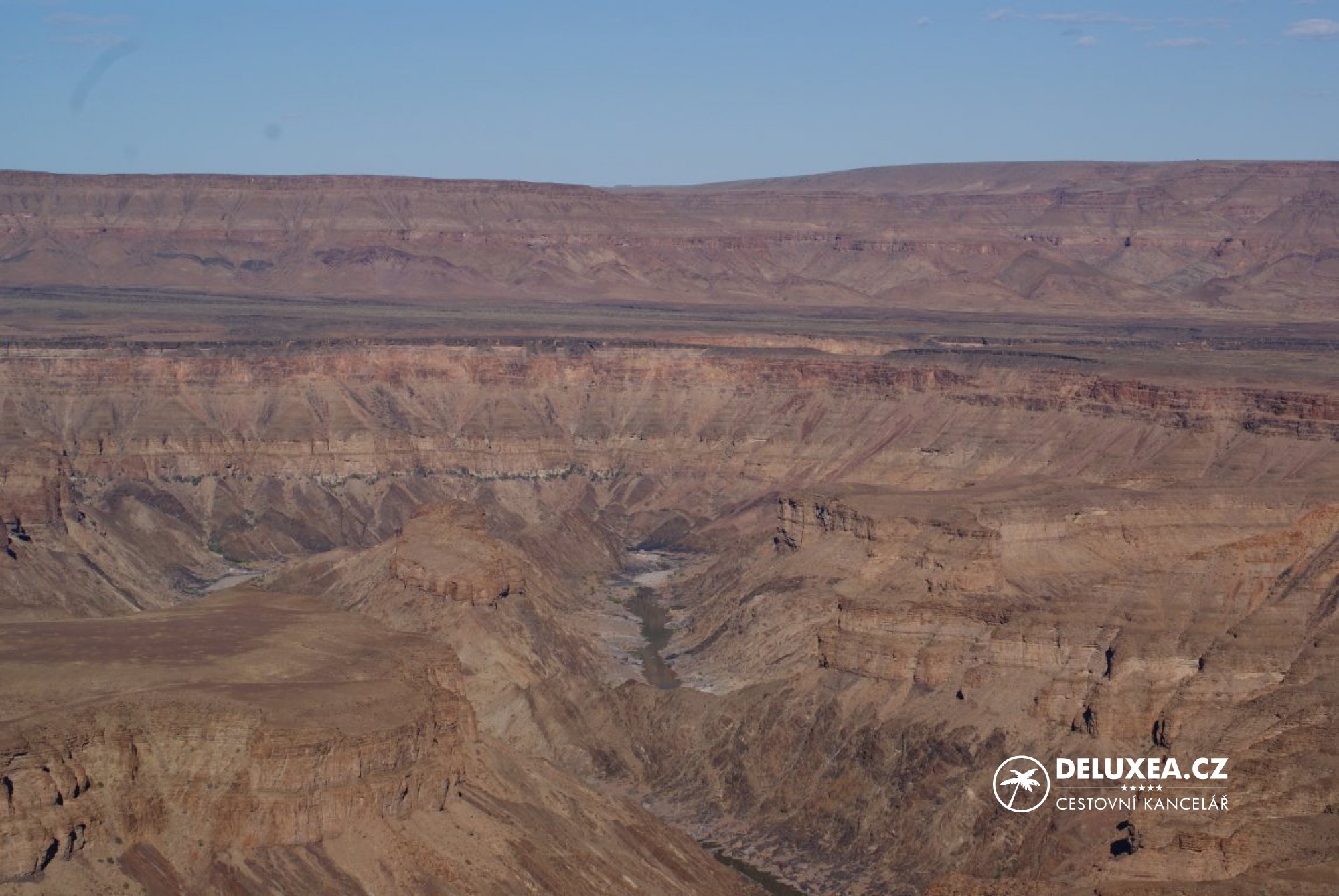 Dalšího rána jsme se vydali na dlouhou cestu k Fish River Canyon, druhému největšímu kaňonu na světě. Ze Sossusvlei je to přes 350 km, ovšem tentokrát už ne po asfaltce, ale po štěrkové cestě. I když jsou tyto cesty velmi široké, průvodce nás poučil, že na štěrku se musí jezdit velice opatrně a nikdy ne více než 80 km/h, protože se může docela lehce stát, že dostanete smyk. Jeli jsme tedy na jih, cesta trvala se zastávkami okolo osmi hodin. Pouštní krajina se cestou měnila v hornatou a pak přecházela ve volně otevřené savany. Po cestě jsme viděli opět spoustu zvířat – kromě známých pštrosů, antilop a přímorožců, jsme měli tentokrát štěstí a potkali i stádo zeber a čtyři žirafy. K večeru jsme přijeli do hotelu, kde jsme si u bazénu se sklenkou sektu v ruce vychutnali západ slunce. Ráno jsme vyrazili ke kaňonu. Dojeli jsme až jeho okraji, a naskytl se nám úchvatný pohled na údolí, které se tu během milionů let vytvořilo. Kaňon je 160 km dlouhý, 27 km široký a na některých místech až 550 m hluboký. Na dno vede stezka, na kterou se ale můžete vydat jen v doprovodu zkušeného průvodce. I když se to shora nezdá, prý je extrémně náročná: dole u řeky, která mimo období dešťů vysychá, teplota lehce přesáhne 40 °C.