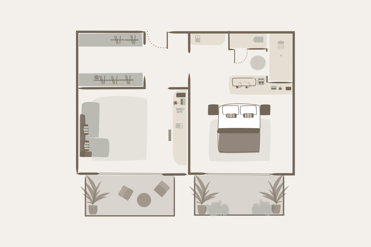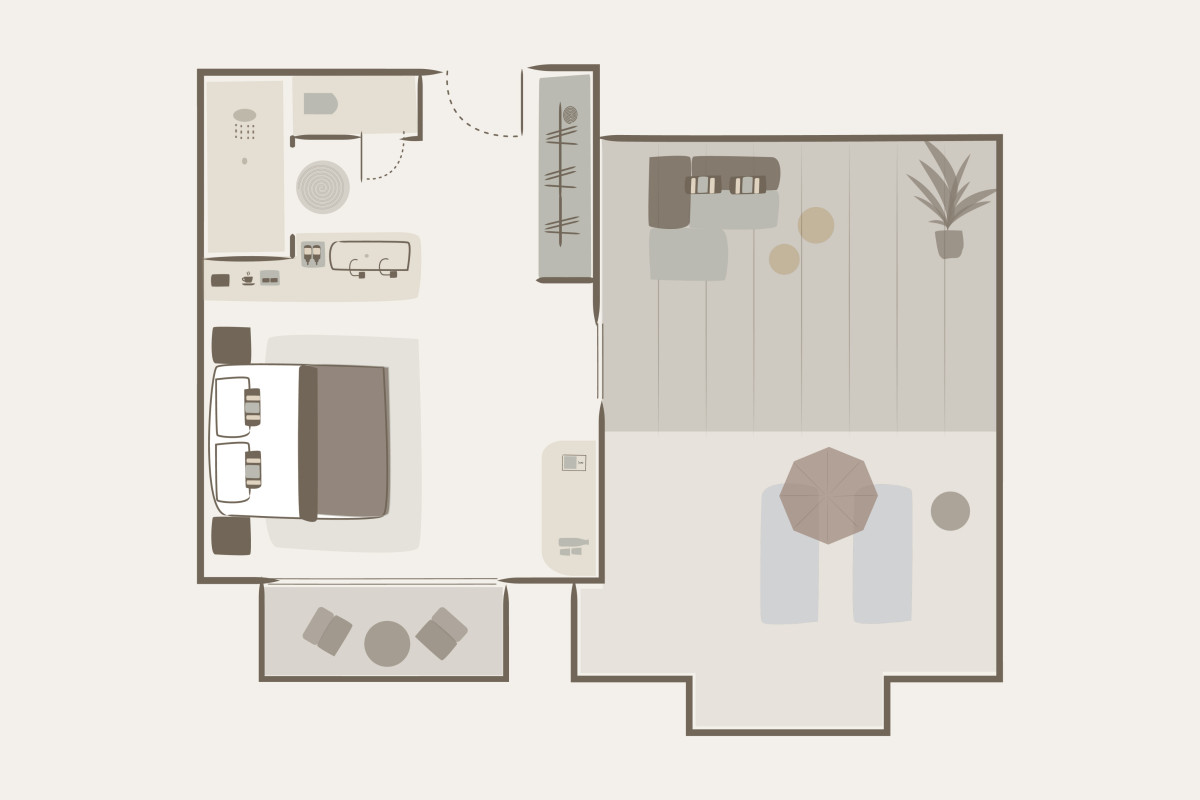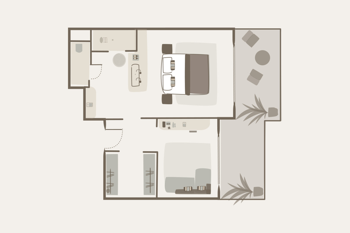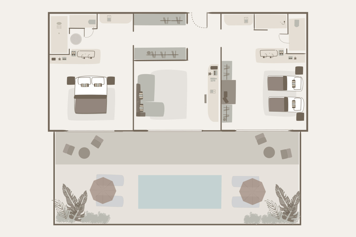 Toto apartmá (60 m²) disponuje prostornou terasou s přímým přístupem do bazénu sdíleného pouze se sousedním apartmá. Elegantní interiér zahrnuje ložnici s manželskou postelí a vlastní koupelnou, šatnu a samostatný obývací pokoj s rozkládací pohovkou a plně vybaveným barem. Ideální volba pro ty, kteří si chtějí užít dokonalé soukromí a snadný přístup k vodě. Maximální kapacita: 2 dospělí + 2 děti nebo 3 dospělí.