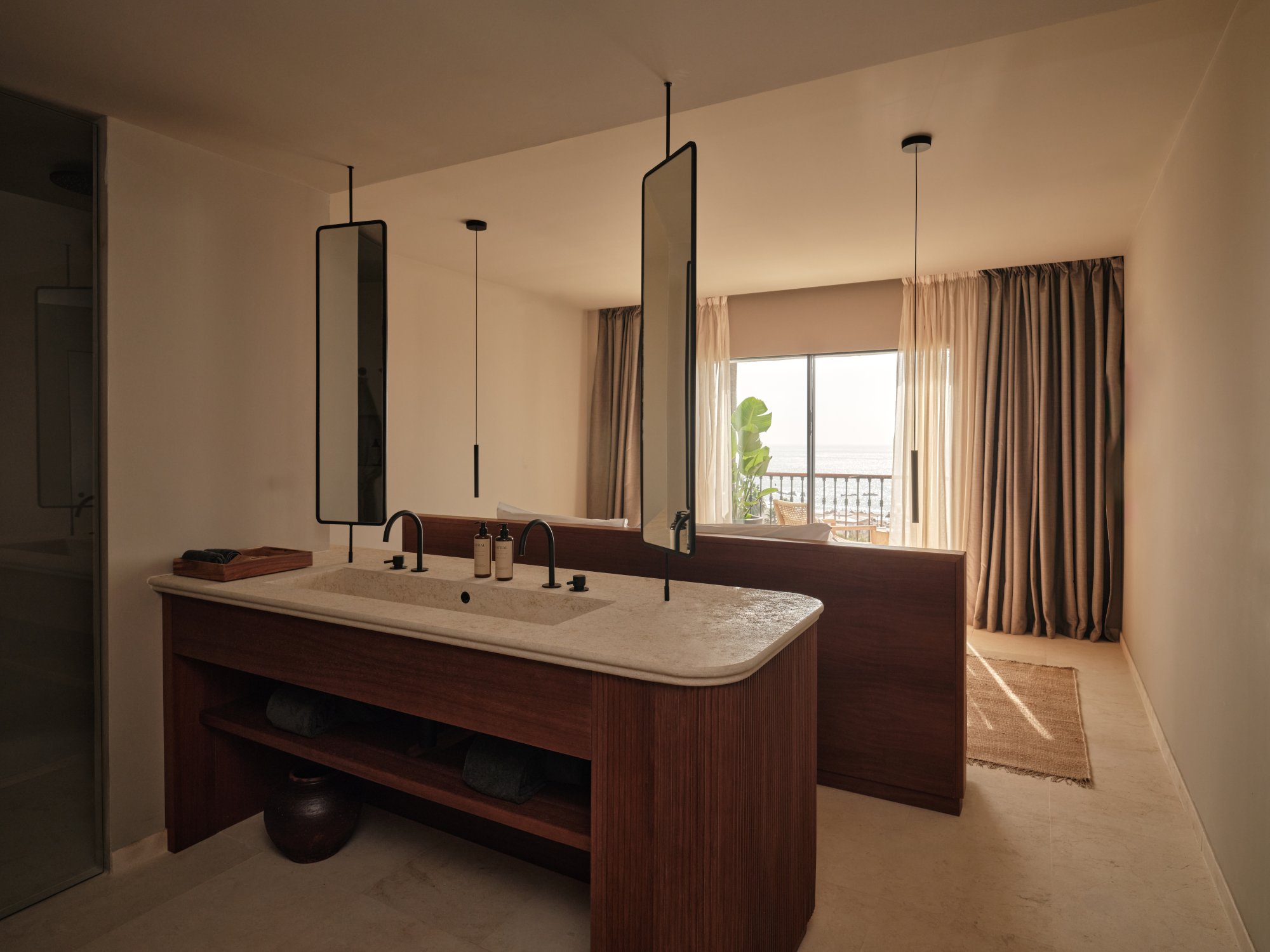 Vychutnejte si nádherný výhled na moře z tohoto elegantního apartmá (60 m²) se soukromým bazénem. Uvnitř najdete ložnici s manželskou postelí a vlastní koupelnou, šatnu a samostatný obývací pokoj s rozkládací pohovkou a plně vybaveným barem. Interiér je plynule propojený s venkovní terasou jako stvořenou pro nerušený odpočinek. Maximální kapacita: 2 dospělí + 2 děti nebo 3 dospělí.