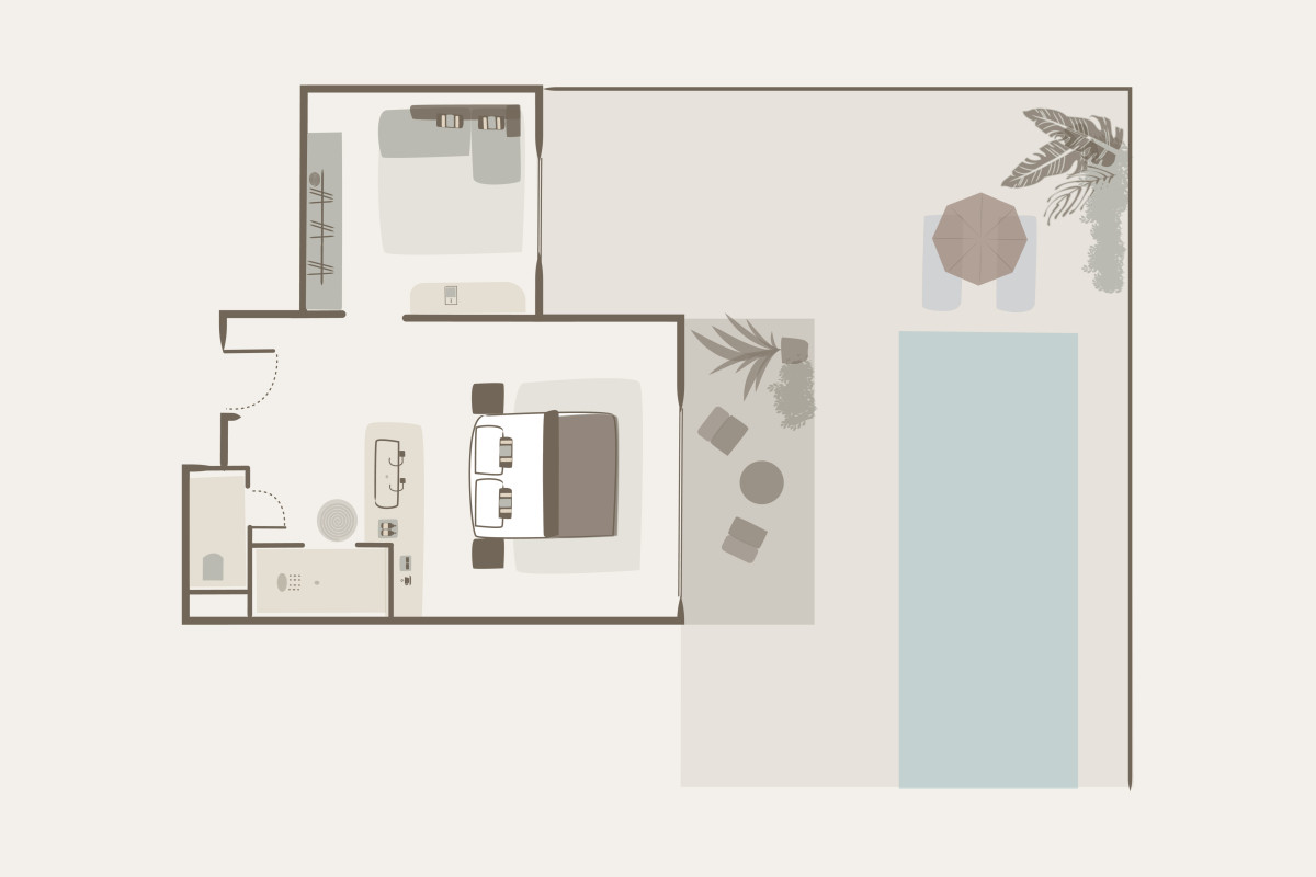 Pro větší skupiny je k dispozici apartmá (60 m²) propojující dva pokoje Classic, které se pyšní rozlehlou terasou se soukromým bazénem. Skládá se ze dvou ložnic s manželskou postelí (nebo dvěma samostatnými lůžky) a vlastní koupelnou vybavenou sprchou. Oba pokoje nabízejí přímý vstup na terasu. Minimalistický design inspirovaný přírodou vytváří klidné a harmonické zázemí jako stvořené pro odpočinek i společně trávené chvíle. Maximální kapacita: 4 dospělí.