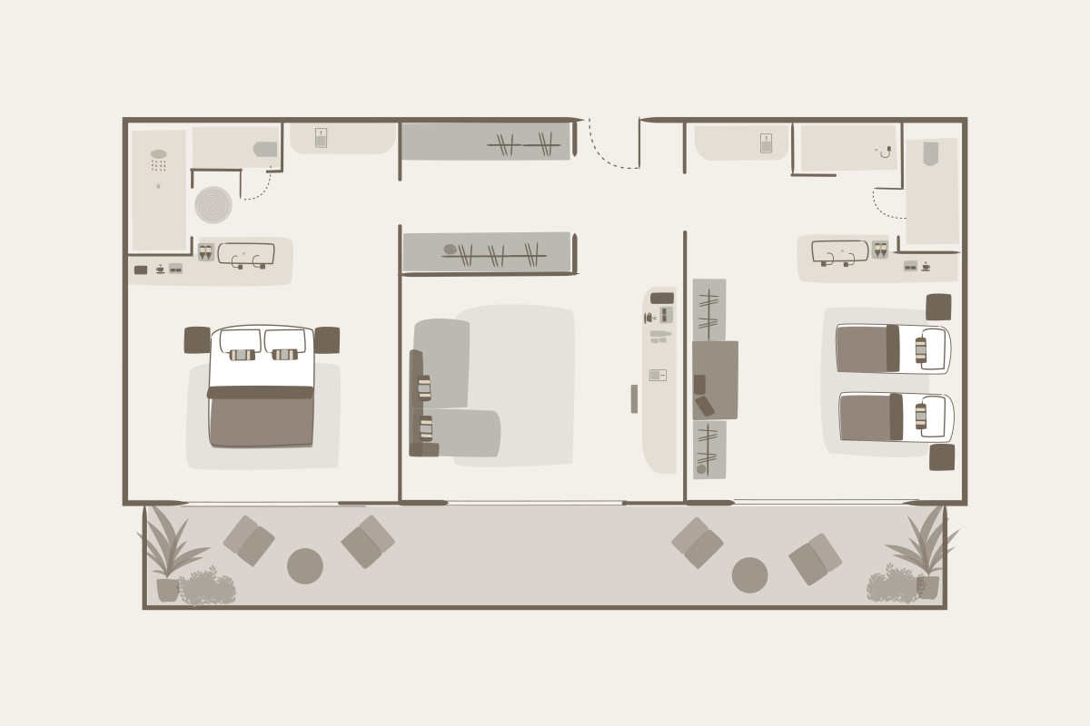 Dopřejte si spoustu prostoru a dechberoucí výhledy na moře z tohoto exkluzivního apartmá (70 m²), které je navržené v minimalistickém stylu. Luxusní a zároveň útulný interiér zahrnuje dvě ložnice (s manželskou postelí a dvěma samostatnými lůžky) a centrální obývací pokoj s rozkládací pohovkou, který je propojený se soukromým balkónem. Každá ložnice disponuje vlastní koupelnou (jedna je vybavená vanou a druhá sprchovým koutem). Maximální kapacita: 4 dospělí + 2 děti nebo 5 dospělých.