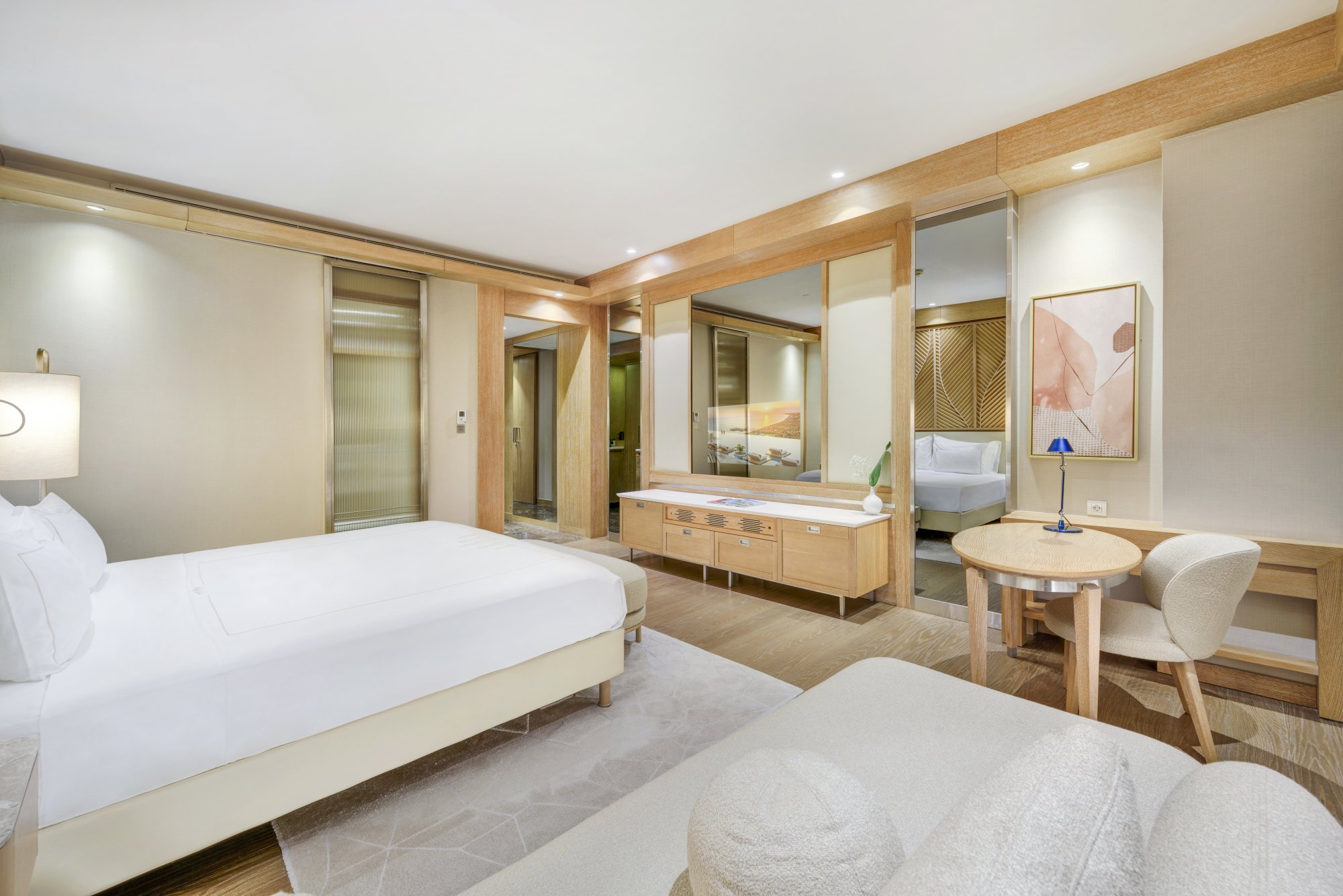 Pro rodiny a větší skupiny je k dispozici tento prostorný pokoj, který zahrnuje samostatnou šatnu, dvě koupelny a dvě ložnice – jednu s manželskou postelí a druhou se dvěma samostatnými lůžky. Velkou předností pokoje je balkón či terasa s opalovacími lehátky, slunečníkem a sedací soupravou, odkud se nabízí částečný výhled na moře. Maximální kapacita: 5 dospělých + 1 dítě