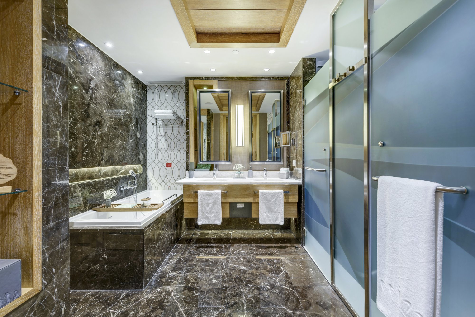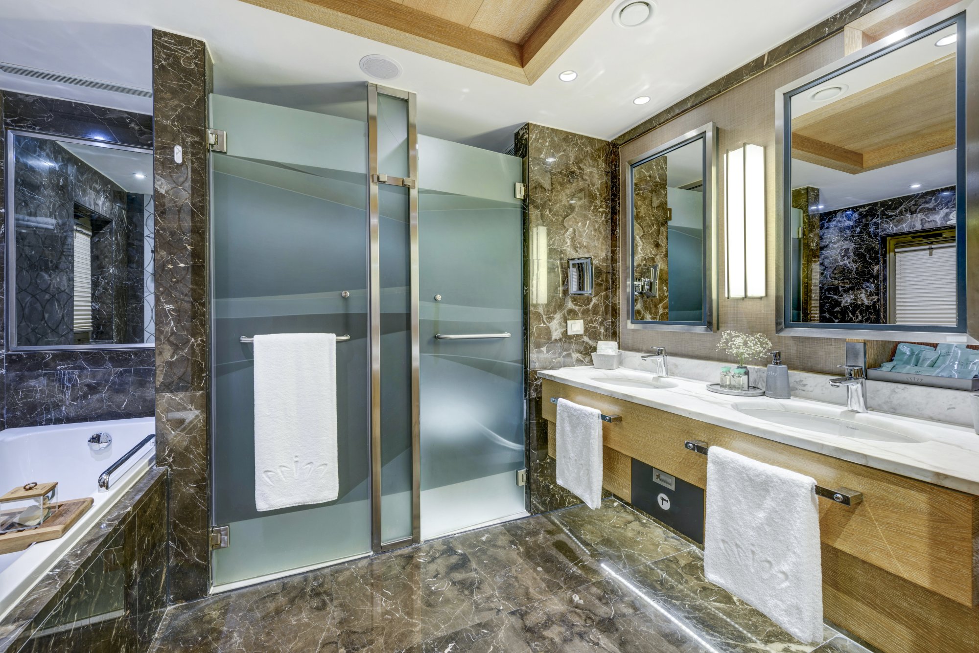 - koupelna: mramorová koupelna s dešťovou sprchou a samostatnou vanou, oddělená toaleta, dvojité umyvadlo, koupelnové a sprchové produkty od značky Bvlgari, dětské koupelové produkty od značky Chicco, osvětlené kosmetické zrcadlo, fén na vlasy, antibakteriální mýdlo na ruce, sada na péči o zuby včetně zubní pasty Marvis, podnos na vanu